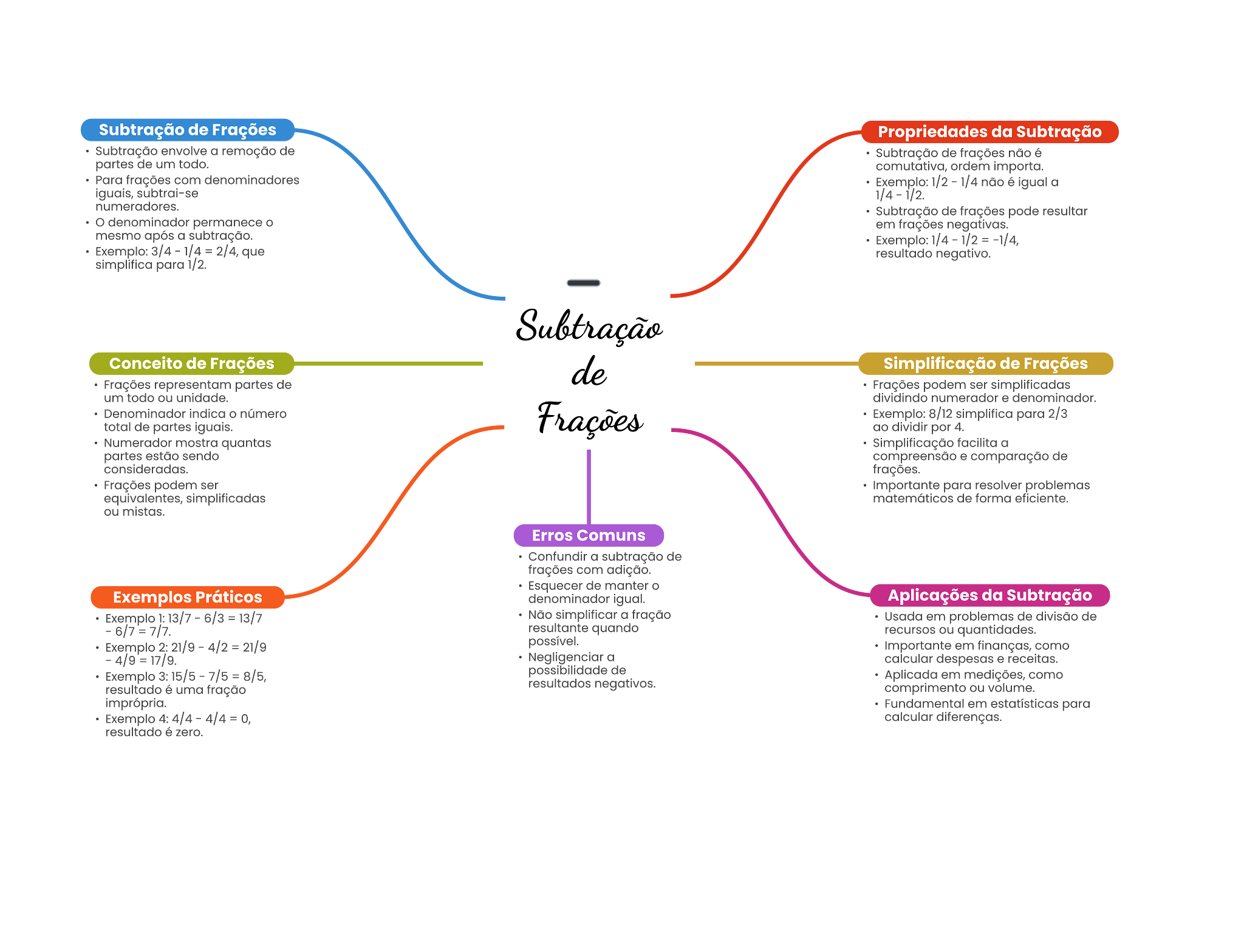 Subtração de Frações Propriedades da Subtração Subtração envolve a remoção de Subtração de frações não é partes de um todo. comutativa, ordem importa. Para frações com denominadores Exemplo: 1/2 1/4 não é a subtral-se 1/4 - numeradores. Subtração de frações pode resultar o permanece em frações negativas. mesmo a subtração. Exemplo: Exemplo: 3/4 1/4 2/4, que resultado negativo. simplifica para 1/2. Conceito de Frações Simplificação de Frações Frações representam partes de Frações podem simplificadas um todo ou unidade. dividindo numerador denominador. Denominador Indica número Exemplo: 8/12 simplifica para 2/3 total de partes dividir por 4. Numerador mostra quantas Simplificação facilita a partes estão sendo comparação de consideradas. frações. Frações podem ser . para resolver problemas equivalentes, de forma eficiente. ou mistas. Erros Comuns Confundir a subtração de frações com adição. Esquecer de manter o Exemplos Práticos denominador igual. Aplicações da Subtração 6/3 13/7 Não simplificar a fração em problemas de divisão de 6/7 - 7/7. resultante quando recursos ou Exemplo 21/9 4/2 21/9 possível. em finanças, como 4/9 - a despesas receitas. 7/5 possibilidade de Aplicada em medições, como resultado uma fração resultados negativos. comprimento ou volume. imprópria. Fundamental em para Exemplo calcular diferenças. resultado zero.