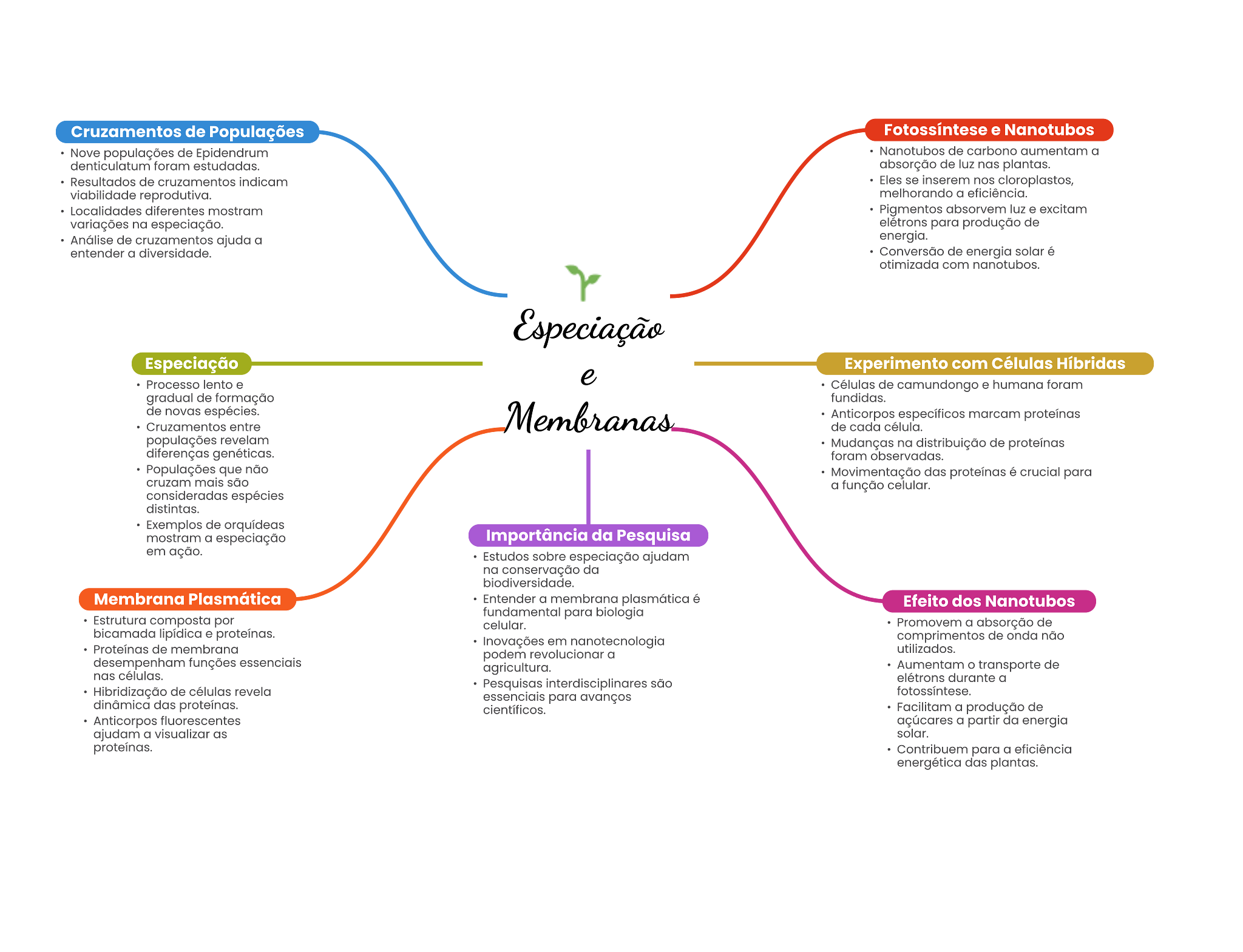 Cruzamentos de Populações Fotossíntese e Nanotubos Nove populações de Epidendrum Nanotubos de carbono aumentam a denticulatum foram estudadas. absorção de luz plantas. Resultados de cruzamentos nos cloropiastos, viabilidade reprodutiva. melhorando a eficiência. Localidades diferentes mostram Pigmentos luz variações na especiação. para produção de de cruzamentos ajuda a energia. entender a diversidade. de energia solar otimizada com nanotubos. Especiação Experimento com Células Híbridas Processo lento e de camundongo humana foram gradual de formação de novas espécies. Anticorpos marcam Cruzamentos entre de cada populações revelam na distribuição de proteínas diferenças genéticas. foram observadas. Populações que não Movimentação das proteínas para mais a função celular. consideradas Exemplos de mostram a especiação Importância da Pesquisa em ação. sobre especiação ajudam na conservação da Membrana Plasmática Entender a membrana é Efeito dos Nanotubos fundamental para Estrutura composta por celular. a absorção de bicamada em comprimentos de onda não de membrana podem revolucionar a utilizados. desempenham funções agricultura. Aumentam transporte de nas de elétrons durante a para avanços dinâmica Facilitam a produção de Anticorpoe fluorescentes açúcares a partir da ajudam a visualizar solar. Contribuem para a eficiência energética das