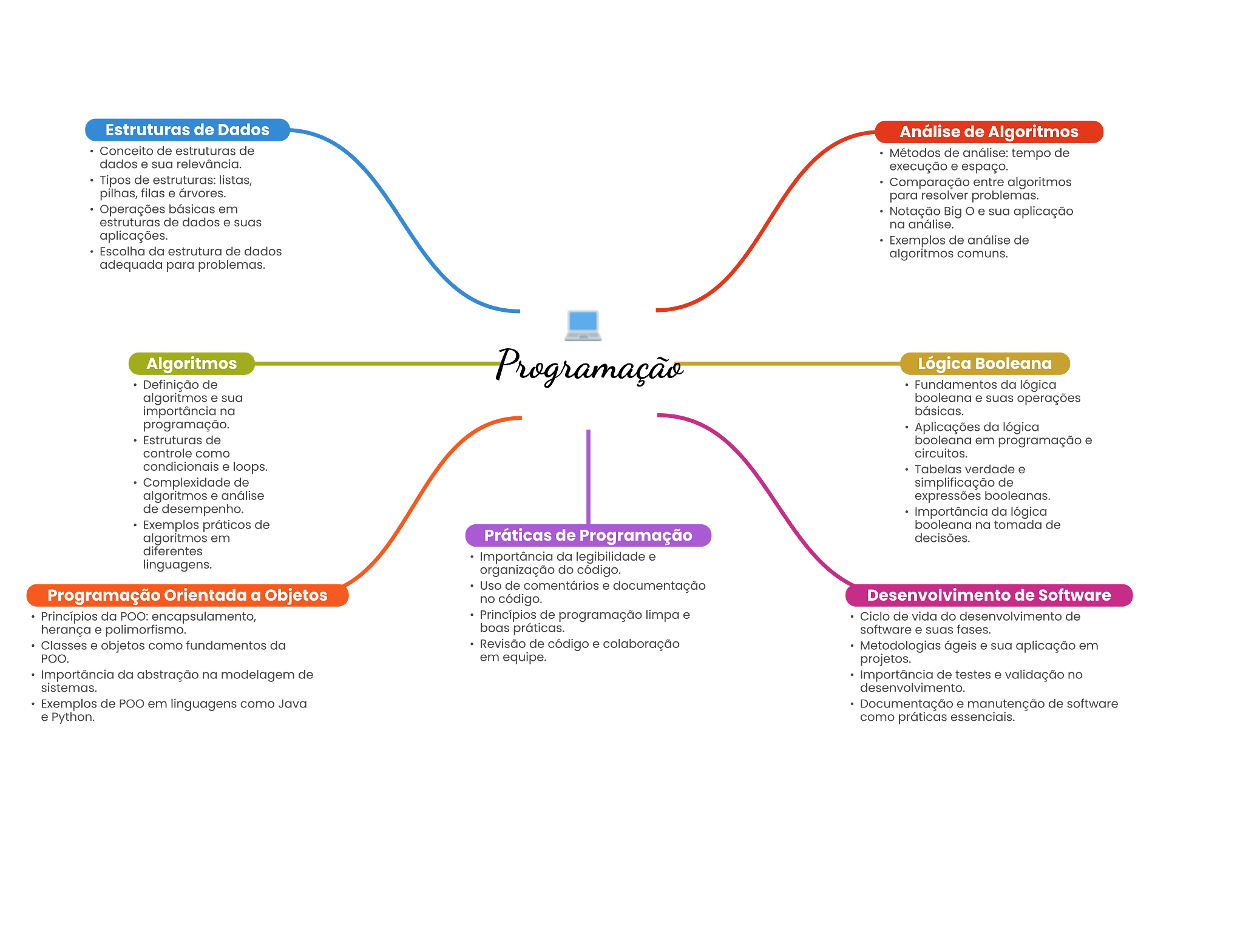 Estruturas de Dados Análise de Algoritmos de estruturas de de tempo de dados . sua relevância. e espaço. Tipos de estruturas: Comparação entre algoritmos pilhas, filas para resolver problemas. Operações em Notação Big aplicação estruturas de dados na aplicações. Exemplos de de Escolha da estrutura de dados comune. adequada para problemas. Algoritmos Lógica Booleana Definição de Fundamentos da lógica algoritmos sua booleana operações na programação. Aplicações da lógica Estruturas de booleana em programação controle como circultos. loops. verdade . Complexidade de de algoritmos e expressões de desempenho. da lógica Exemplos de na tomada de algoritmos em Práticas de Programação da legibilidade organização do código. Uso de comentários documentação Programação Orientada a Objetos no código. de Software da POO: de programação de vida do desenvolvimento de herança bods software fasse. Classes objetos como fundamentos da Revisão de código colaboração Metodologias ágeis aplicação em POO. em projetos. da na modelagem de de testes validação no Exemplos de POO em como Java Documentação manutenção de software Python. como práticas
