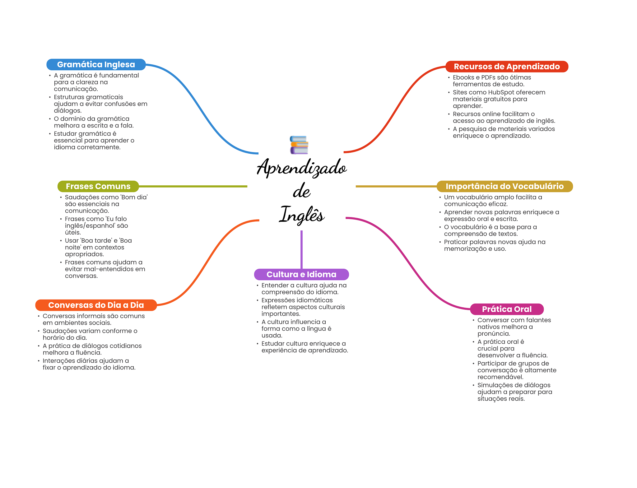 Gramática Inglesa Recursos de Aprendizado A gramática é fundamental Ebooks e PDFs são ótimas para a clareza na ferramentas de estudo. comunicação. Sites como HubSpot oferecem Estruturas gramaticais materiais gratuitos para ajudam a evitar confusões em aprender. diálogos. Recursos online facilitam domínio da gramática acesso ao aprendizado de inglês. melhora a escrita e a fala. A pesquisa de materiais variados Estudar gramática é enriquece aprendizado. essencial para aprender idioma corretamente. Aprendizado Frases Comuns de Importância do Vocabulário Saudações como 'Bom dia' Um vocabulário amplo facilita a são essenciais na comunicação eficaz. comunicação. Frases como 'Eu falo Inglês Aprender novas palavras enriquece a expressão oral e escrita. são vocabulário é a base para a úteis. compreensão de textos. Usar 'Boa tarde' e 'Boa Praticar palavras novas ajuda na noite' em contextos memorização e uso. apropriados. Frases comuns ajudam a evitar mal-entendidos em conversas. Cultura e Idioma Entender a cultura ajuda na compreensão do idioma. Expressões idiomáticas Conversas do Dia a Dia refletem aspectos culturais Prática Oral Conversas informais são comuns importantes. em ambientes sociais. A cultura influencia a Conversar com falantes Saudações variam conforme forma como a língua é nativos melhora a usada. pronúncia. horário do dia. Estudar cultura enriquece a A prática oral é A prática de diálogos cotidianos experiência de aprendizado. crucial para melhora a fluência. desenvolver a fluência. Interações diárias ajudam a Participar de grupos de fixar aprendizado do idioma. conversação é altamente recomendável. Simulações de diálogos ajudam a preparar para situações reais.