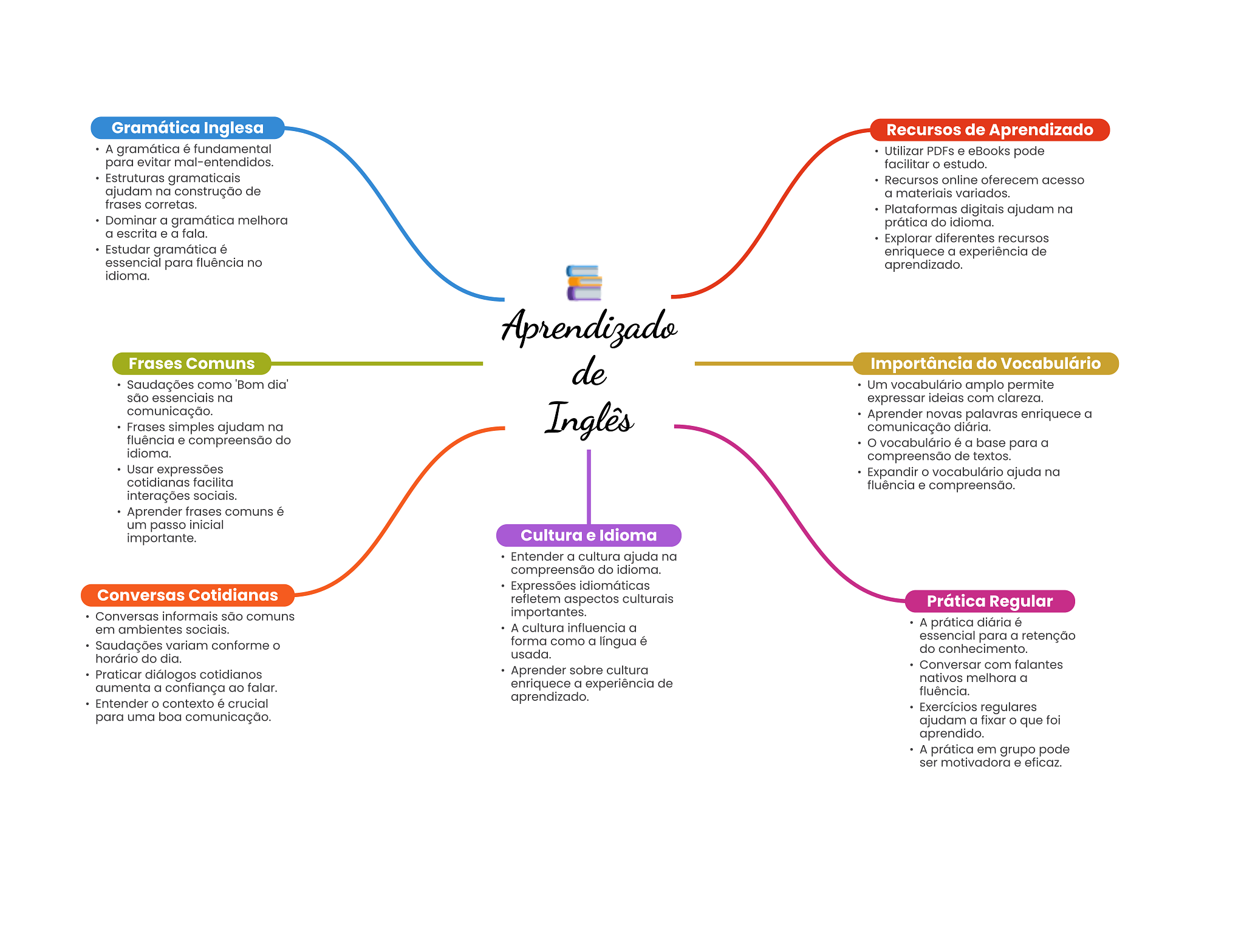 Gramática Inglesa Recursos de Aprendizado A gramática é fundamental Utilizar PDFs e eBooks pode para evitar mal-entendidos. facilitar estudo. Estruturas gramaticais Recursos online oferecem acesso ajudam na construção de a materiais variados. frases corretas. Plataformas digitais ajudam na Dominar a gramática melhora prática do idioma. a escrita e a fala. Explorar diferentes recursos Estudar gramática é enriquece a experiência de essencial para fluência no aprendizado. idioma. Aprendizado Frases Comuns de Importância do Vocabulário Saudações como 'Bom Um vocabulário amplo permite são essenciais na expressar ideias com clareza. comunicação. Frases simples ajudam na Inglês Aprender novas palavras enriquece a comunicação diária. fluência e compreensão do vocabulário é a base para a idioma. compreensão de textos. Usar expressões Expandir O vocabulário ajuda na cotidianas facilita fluência e compreensão. interações sociais. Aprender frases comuns é um passo inicial importante. Cultura e Idioma Entender a cultura ajuda na compreensão do idioma. Expressões idiomáticas Conversas Cotidianas refletem aspectos culturais Prática Regular Conversas informais são comuns importantes. em ambientes sociais. A cultura influencia a A prática diária é Saudações variam conforme O forma como a língua é essencial para a retenção usada. do conhecimento. horário do dia. Conversar com falantes Praticar diálogos cotidianos Aprender sobre cultura nativos melhora a aumenta a confiança ao falar. enriquece a experiência de fluência. Entender contexto é crucial aprendizado. Exercícios regulares para uma boa comunicação. ajudam a fixar O que foi aprendido. A prática em grupo pode ser motivadora e eficaz.