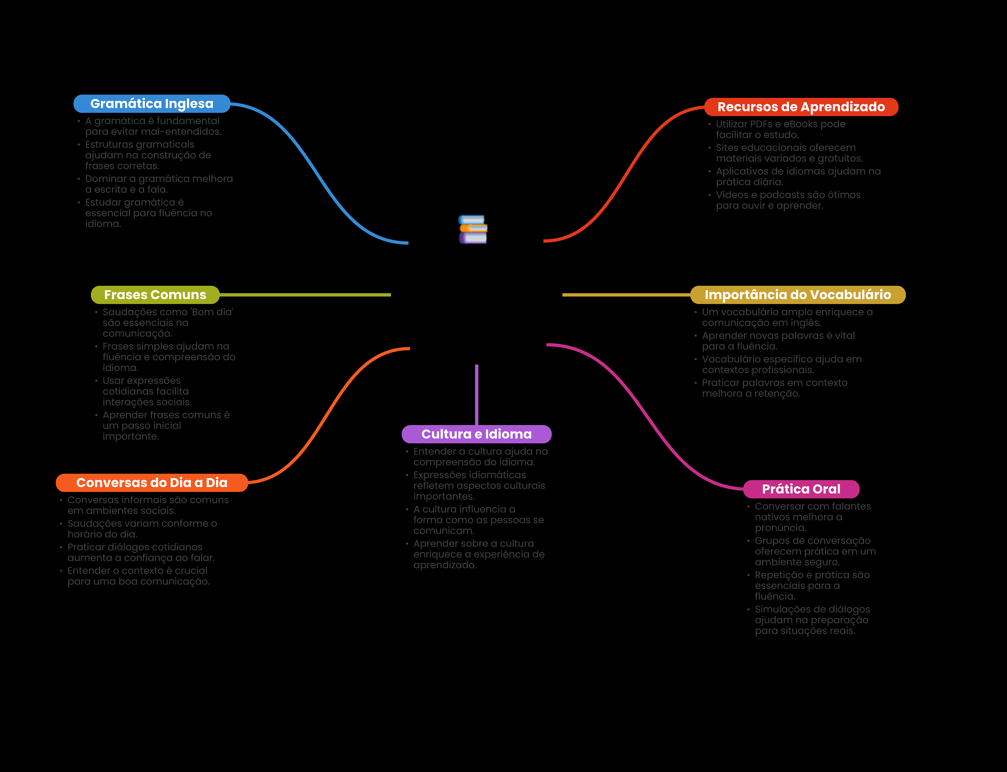 Gramática Inglesa Recursos de Aprendizado A gramática é fundamental Utilizar PDFs e eBooks pode para evitar mal-entendidos. facilitar O estudo. Estruturas gramaticais Sites educacionais oferecem ajudam na construção de materiais variados e gratuitos. frases corretas. Aplicativos de idiomas ajudam na Dominar a gramática melhora prática diária. a escrita e a fala. Vídeos e podcasts são ótimos Estudar gramática é para ouvir e aprender. essencial para fluência no idioma. Frases Comuns Importância do Vocabulário Saudações como 'Bom Um vocabulário amplo enriquece a são essenciais na comunicação em inglês. comunicação. Aprender novas palavras é vital Frases simples ajudam na para a fluência. fluência e compreensão do Vocabulário específico ajuda em idioma. contextos profissionais. Usar expressões Praticar palavras em contexto cotidianas facilita melhora a retenção. interações sociais. Aprender frases comuns é um passo inicial importante. Cultura e Idioma Entender a cultura ajuda na compreensão do idioma. Expressões idiomáticas Conversas do Dia a Dia refletem aspectos culturais Prática Oral Conversas informais são comuns importantes. em ambientes sociais. A cultura influencia a Conversar com falantes Saudações variam conforme forma como as pessoas se nativos melhora a horário do dia. comunicam. pronúncia. Aprender sobre a cultura Grupos de conversação Praticar diálogos cotidianos enriquece a experiência de oferecem prática em um aumenta a confiança ao falar. aprendizado. ambiente seguro. Entender O contexto é crucial Repetição e prática são para uma boa comunicação. essenciais para a fluência. Simulações de diálogos ajudam na preparação para situações reais.