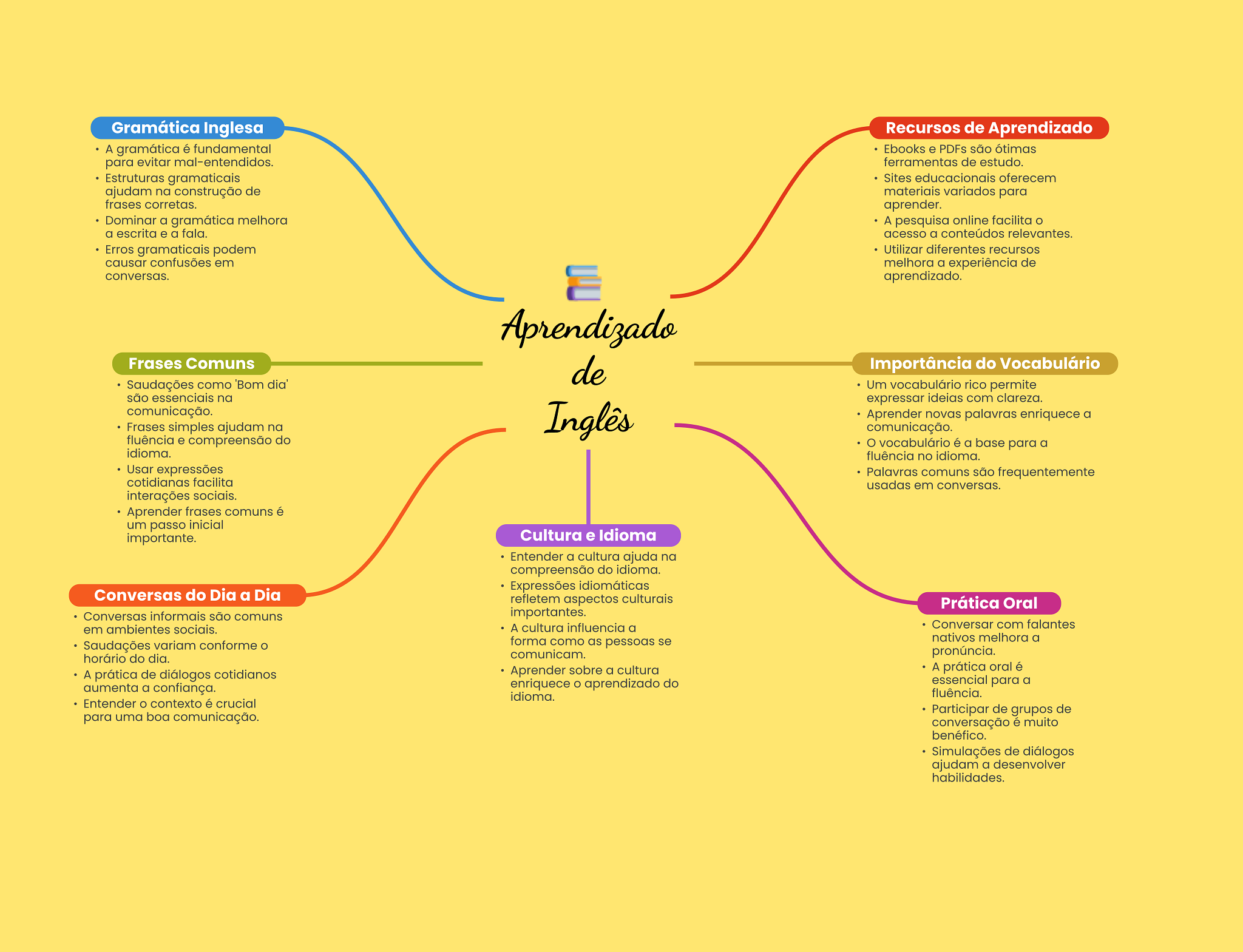 Gramática Inglesa Recursos de Aprendizado A gramática é fundamental Ebooks e PDFs são ótimas para evitar mal-entendidos. ferramentas de estudo. Estruturas gramaticais Sites educacionais oferecem ajudam na construção de materiais variados para frases corretas. aprender. Dominar a gramática melhora A pesquisa online facilita acesso a conteúdos relevantes. Erros gramaticais podem Utilizar diferentes recursos causar confusões em melhora a experiência de conversas. aprendizado. Aprendizado Frases Comuns de Importância do Vocabulário Saudações como 'Bom dia' Um vocabulário rico permite são essenciais na expressar ideias com clareza. comunicação. Frases simples ajudam na Inglês Aprender novas palavras enriquece a comunicação. fluência e compreensão do vocabulário é a base para a idioma. fluência no idioma. Usar expressões Palavras comuns são frequentemente cotidianas facilita usadas em conversas. interações sociais. Aprender frases comuns é um passo inicial importante. Cultura e Idioma Entender a cultura ajuda na compreensão do idioma. Expressões idiomáticas Conversas do Dia a Dia refletem aspectos culturais Prática Oral Conversas informais são comuns importantes. em ambientes sociais. A cultura influencia a Conversar com falantes Saudações variam conforme forma como as pessoas se nativos melhora a comunicam. pronúncia. horário do dia. Aprender sobre a cultura A prática oral é A prática de diálogos cotidianos enriquece aprendizado do essencial para a aumenta a confiança. idioma. fluência. Entender contexto é crucial Participar de grupos de para uma boa comunicação. conversação é muito benéfico. Simulações de diálogos ajudam a desenvolver habilidades.
