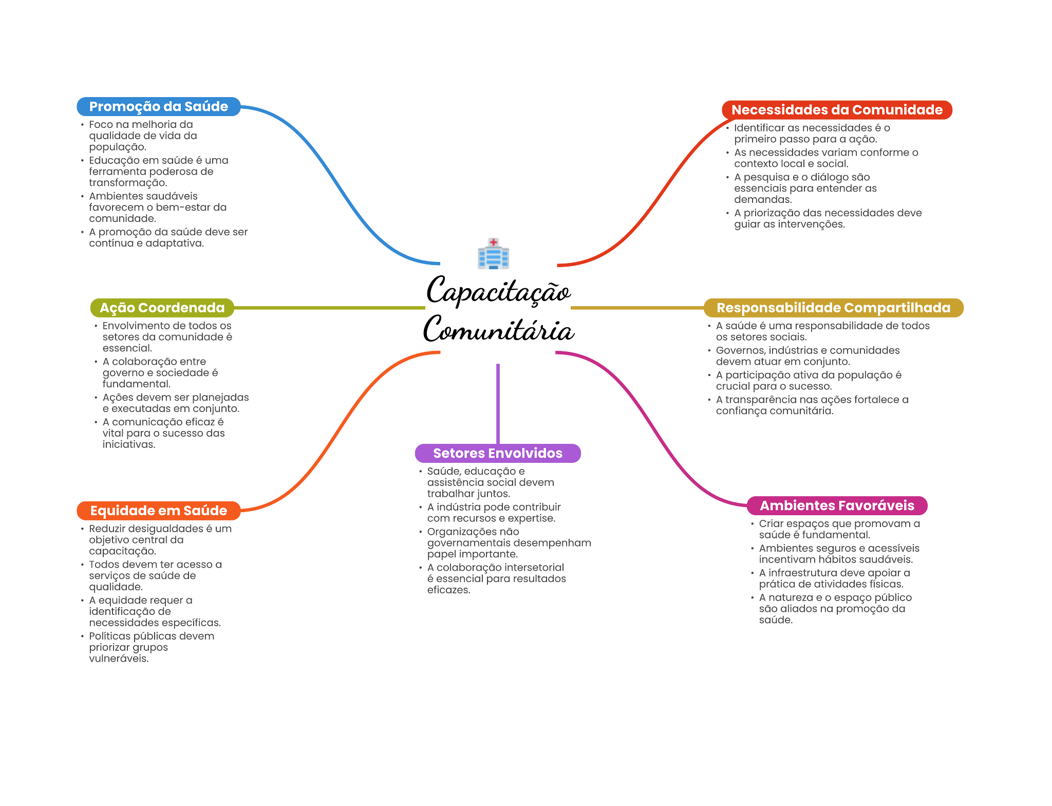Promoção da Saúde Necessidades da Comunidade Foco na melhoria da Identificar as necessidades é qualidade de vida da primeiro passo para a ação. população. As necessidades variam conforme Educação em é uma local social. poderosa de transformação. A peequisa . para entender as Ambientes favorecem da comunidade. A priortzação necessidades deve gular A promoção da deve continua . adaptativa. Ação Coordenada Responsabilidade Compartilhada Envolvimento de todos A é uma responsabilidade de todos estores da comunidade é essencial. Governos, comunidades A colaboração entre atuar em conjunto. governo sociedade A participação ativa da população é fundamental. para 0 devem A transparência nas ações a em conjunto. A comunicação eficaz é vital para Setores Envolvidos Saúde, educação . assistência social juntos. Equidade em Saúde A contribuir Ambientes Favoráveis com recursos expertise. é um Criar que promovam a Organizações não objetivo central da fundamental. governamentals desempenham capacitação. papel Ambientes seguros e Todos ter acesso a A colaboração serviços de saúde de para resultados A deve a qualidade. effcazes. prática de atividades A equidade requer a A natureza o espaço público identificação de na promoção da Politicas públicas devem priortzar grupos