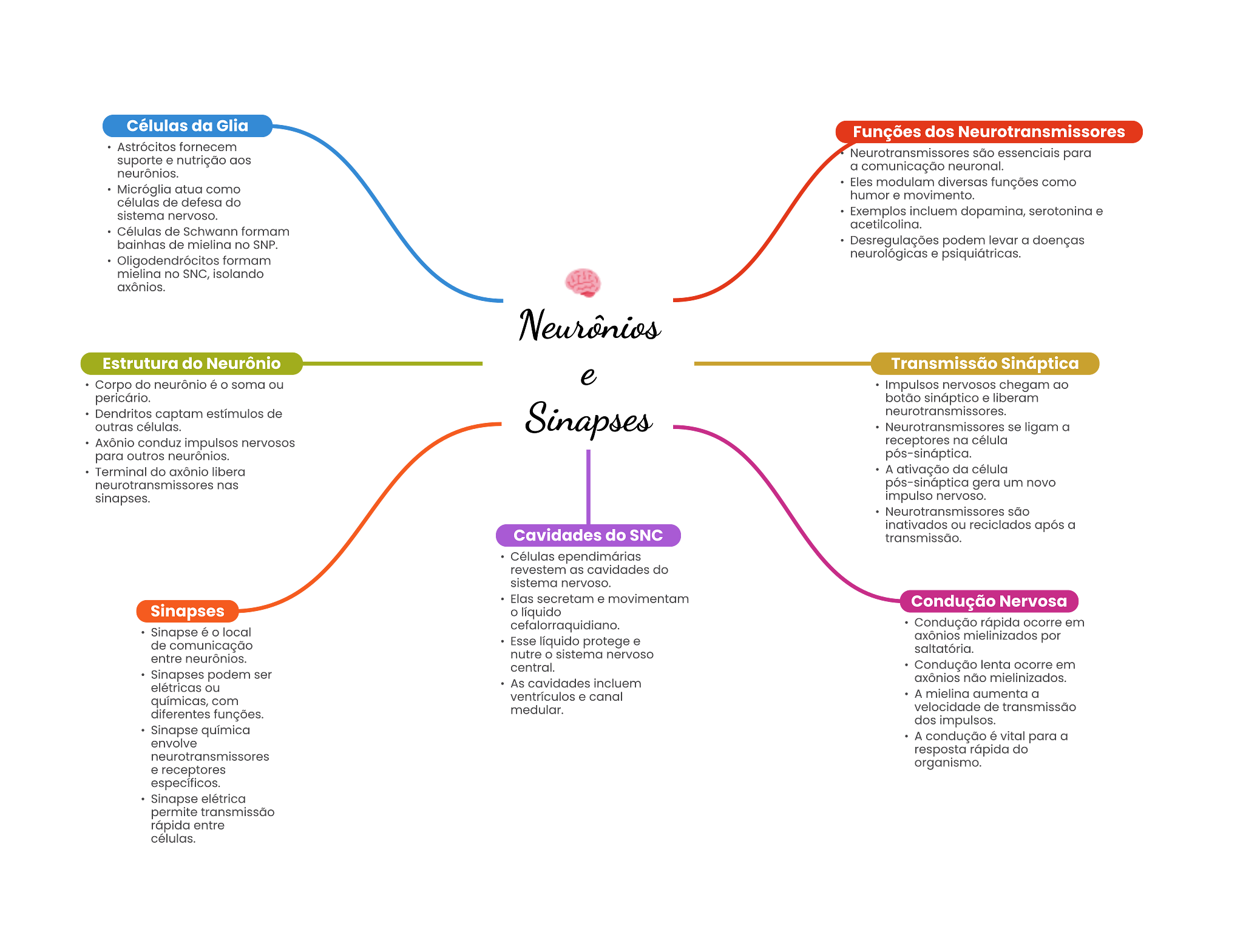 Células da Glia Funções dos Neurotransmissores fornecem suporte nutrição são essenciale para a comunicação neuronal. Micróglia atua como Else modulam diverage funções como humor movimento. células de do Exemplos incluem dopamina, de Schwann formam de no SNP. Desregulações podem a doenças formam no SNC, Isolando Estrutura do Neurônio Transmissão Sináptica Corpo do neurônio soma ou nervosos chegam ao liberam captam estímulos de ligam a Axônio conduz impulsos nervosos receptores na para outros Terminal do axônio A ativação da nas gera um novo sinapses. impulso nervoso. são inativados ou reciciados a Cavidades do SNC revestem as cavidades do sistema nervoso. secretam movimentam Condução Nervosa Sinapses líquido Condução ocorre em Sinapee é local Esse líquido protege mielinizados por de comunicação entre nutre sistema nervoso central. Condução lenta em podem ser cavidades não mielinizados. elétricas ou canal A aumenta a com medular. velocidade de transmissão diferentes funções. dos química envolve A condução vital para a rápida do receptores organismo. específicos. elétrica permite entre