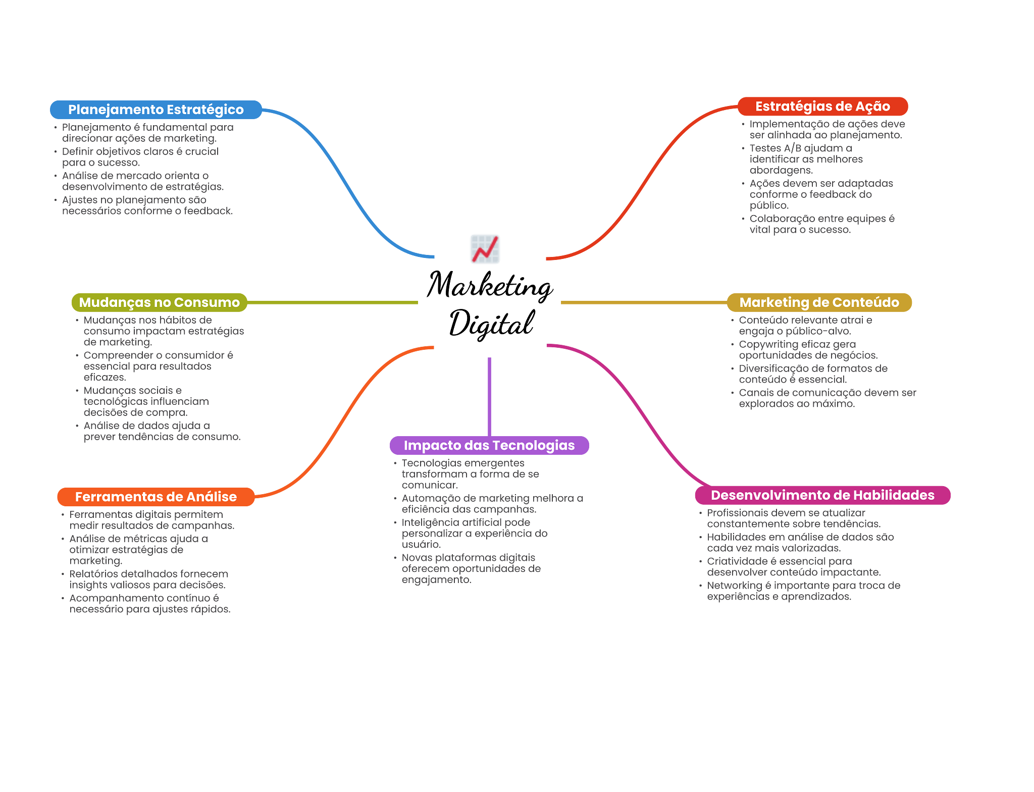 Planejamento Estratégico Estratégias de Ação é para de ações deve de marketing. ser alinhada Definir é crucial A/B ajudam a para sucesso. identificar as melhores de mercado orienta desenvolvimento de Ações devem conforme o feedback do Ajustes no necessários conforme o feedback. público. Colaboração entre equipes é vital para o sucesso. Mudanças no Consumo Marketing de Conteúdo Mudanças nos hábitos de Conteúdo relevante e consumo impactam estratégias engaja de marketing. Copywriting eficaz gera Compreender consumidor é oportunidades de essencial para resultados Diversificação de formatos de conteúdo Mudanças socials . de comunicação devem ser tecnológicas explorados decisões de compra. de dados ajuda a prever tendências de consumo. Impacto das Tecnologias Tecnologias emergentes transformam a forma de se comunicar. Ferramentas de Análise Automação de marketing melhora a de Habilidades Ferramentas digitals permitem eficiência das devem se atualizar medir resultados de campanhas. artificial pode constantements sobre tendências. de métricas ajuda a personalizar a experiência do Habilidades em de dados otimizar de usuário. oada vez mais marketing. Novas plataformas Criatividade é essencial para Relatórios detalhados fornecem oferecem oportunidades de Insights para decisões. Networking para troca de Acompanhamento experiências . aprendizados. necessário para