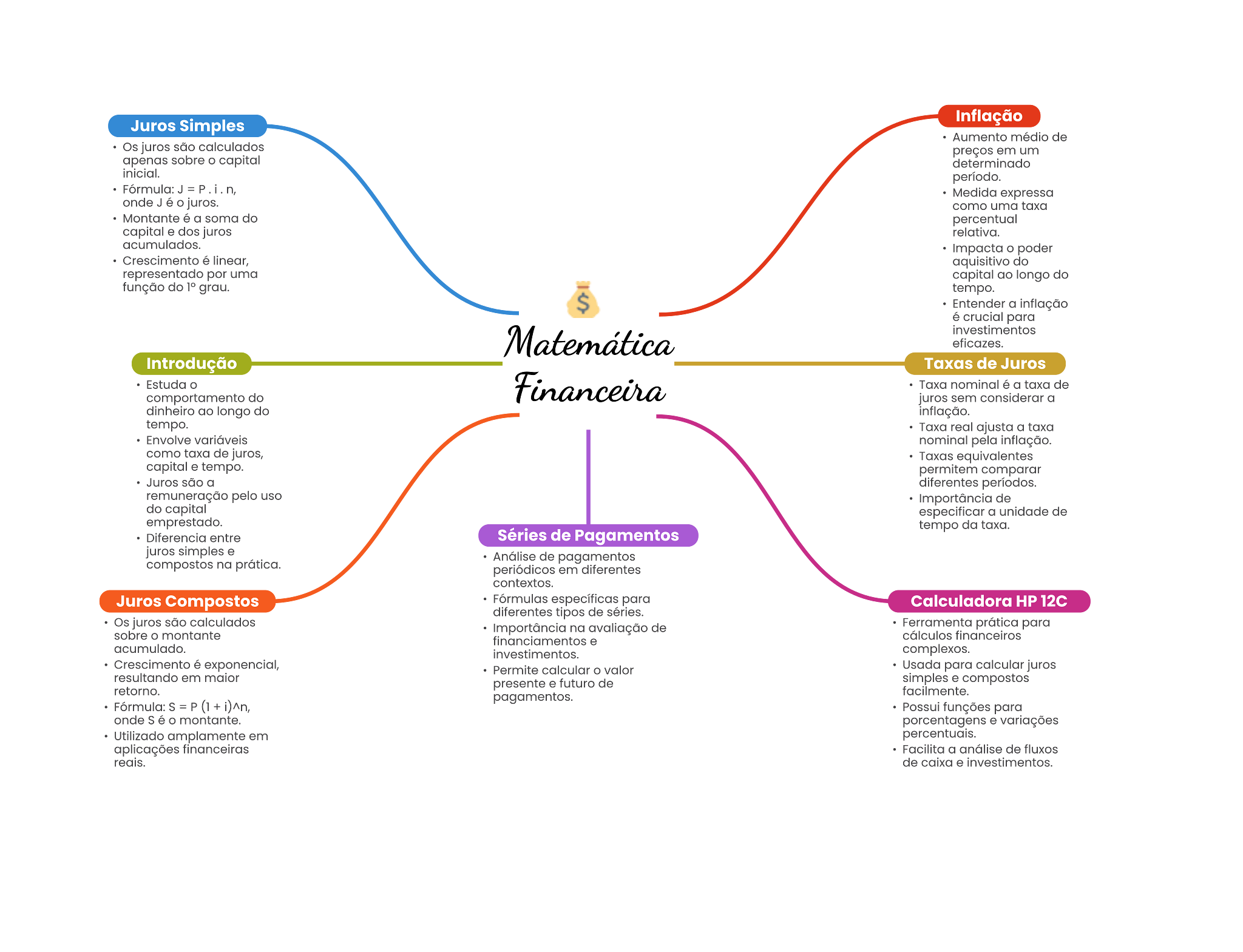 Inflação Juros Simples Aumento médio de são preços em um sobre o capital J - Medida onde J é juros. como uma é a soma do percentual capital dos juros relativa. acumulados. poder Crescimento linear, do representado por uma capital longo do função do tempo. $ Entender a é crucial para Introdução Taxas de Juros Estuda Taxa nominal a de comportamento do juros sem considerar a dinheiro do longo do tempo. Taxa real ajusta a Envolve nominal pela taxa de juros, equivalentes capital tempo. permitem comparar Juros são a diferentes remuneração pelo uso de do capital a unidade de emprestado. tempo da taxa. Diferencia entre Séries de Pagamentos juros simples de pagamentos compostos na em diferentes Juros Compostos Fórmulas específicas para Calculadora HP diferentes tipos de séries. Os juros são calculados na de Ferramenta para sobre financiamentos cálculos acumulado. complexos. Crescimento exponencial, Permite calcular valor Usada para calcular juros resultando em presente . futuro de . compostos . P (1 + pagamentos. Possul funções para onde é variações Utilizado amplamente em percentuals. aplicações Facilita a de fluxe de . investimentos.