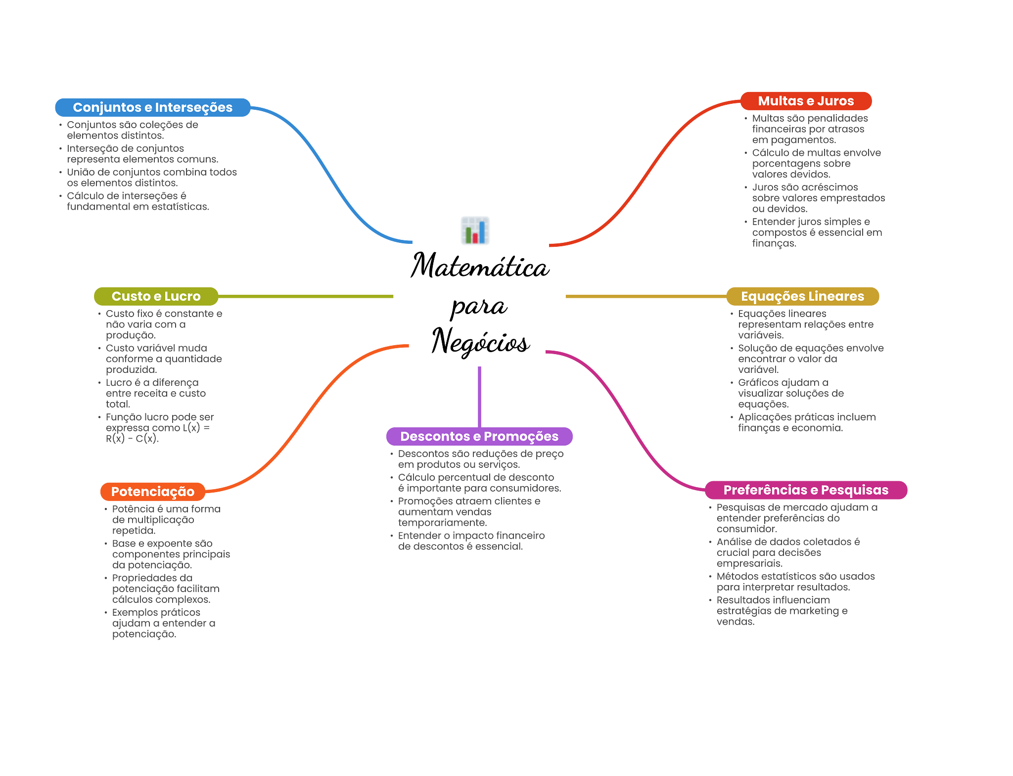 Multas e Juros Conjuntos e Interseções Conjuntos coleções de Multas são penalidades elementos distintos. financeiras por atrasos em pagamentos. de conjuntos Cálculo de multas envolve representa elementos porcentagens sobre de conjuntos combina todos valores elementos Juros são Cálculo de interseções sobre valores emprestados fundamental em ou devidos. Entender e compostos essencial em Custo e Lucro Equações Lineares Custo é constante Equações lineares não varia com a representam entre produção. Custo variável muda Solução de equações envolve conforme a quantidade encontrar valor da produzida. variável. Lucro a diferença Gráficos ajudam entre receita custo visualizar soluções de total. equações. Função lucro pode ser Aplicações incluem expresed como L(x) R(x) C(x). Descontos e Promoções Descontos são reduções de preço em produtos ou Cálculo percentual de desconto Potenciação importante para consumidores. Preferências e Pesquisas Promoções atraem clientes e é uma forma aumentam de mercado ajudam a de multiplicação temporariamente. entender preferências do consumidor. Entender financeiro Base são de descontos de dados componentes principals crucial para decisões da Propriedades da Métodos usados potenciação facilitam para interpretor resultados. Resultados Exemplos próticos de marketing . ajudam a entender a vendas. potenciação.