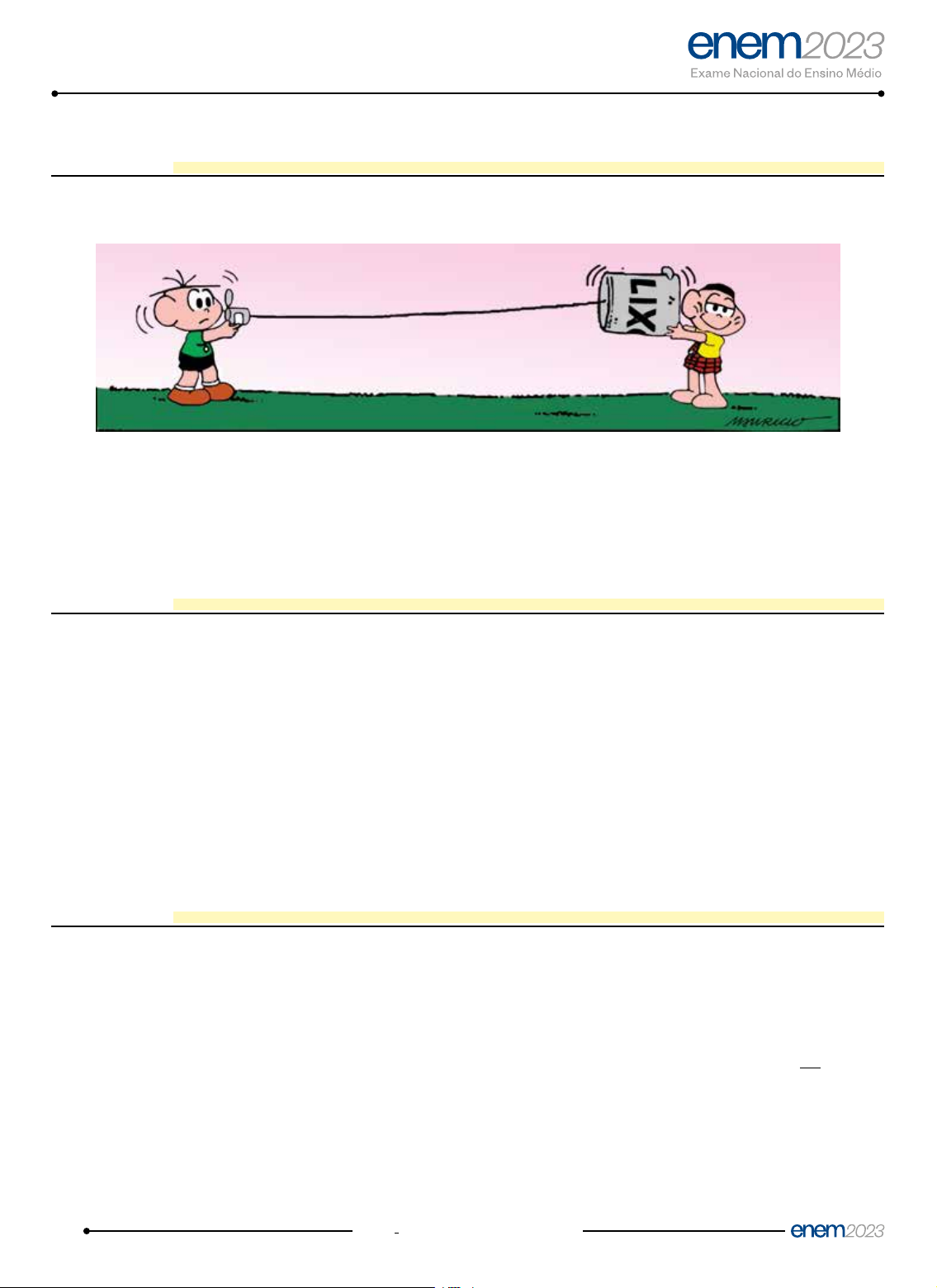 2 CN • 2º DIA • CADERNO 5 • AMARELO CIÊNCIAS DA NATUREZA E SUAS TECNOLOGIAS Questões de 91 a 135 QUESTÃO 91 Na tirinha de Mauricio de Sousa, os personagens Cebolinha e Cascão fazem uma brincadeira utilizando duas latas e um barbante. Ao perceberem que o som pode ser transmitido através do barbante, resolvem alterar o comprimento do barbante para ficar cada vez mais extenso. As demais condições permaneceram inalteradas durante a brincadeira. SOUSA, M. Disponível em: www.monica.com.br. Acesso em: 2 out. 2012 (adaptado). Na prática, à medida que se aumenta o comprimento do barbante, ocorre a redução de qual característica da onda sonora? A A Altura. B B Período. C C Amplitude. D D Velocidade. E E Comprimento de onda. QUESTÃO 92 Informações digitais — dados — são gravadas em discos ópticos, como CD e DVD, na forma de cavidades microscópicas. A gravação e a leitura óptica dessas informações são realizadas por um laser (fonte de luz monocromática). Quanto menores as dimensões dessas cavidades, mais dados são armazenados na mesma área do disco. O fator limitante para a leitura de dados é o espalhamento da luz pelo efeito de difração, fenômeno que ocorre quando a luz atravessa um obstáculo com dimensões da ordem de seu comprimento de onda. Essa limitação motivou o desenvolvimento de lasers com emissão em menores comprimentos de onda, possibilitando armazenar e ler dados em cavidades cada vez menores. Em qual região espectral se situa o comprimento de onda do laser que otimiza o armazenamento e a leitura de dados em discos de uma mesma área? A A Violeta. B B Azul. C C Verde. D D Vermelho. E E Infravermelho. QUESTÃO 93 O bluetooth é uma tecnologia de comunicação sem fio, de curto alcance, presente em diferentes dispositivos eletrônicos de consumo. Ela permite que aparelhos eletrônicos diferentes se conectem e troquem dados entre si. No padrão bluetooth, denominado de Classe 2, as antenas transmitem sinais de potência igual a 2,4 mW e possibilitam conectar dois dispositivos distanciados até 10 m. Considere que essas antenas se comportam como fontes puntiformes que emitem ondas eletromagnéticas esféricas e que a intensidade do sinal é calculada pela potência por unidade de área. Considere 3 como valor aproximado para π. Para que o sinal de bluetooth seja detectado pelas antenas, o valor mínimo de sua intensidade, em W m2 , é mais próximo de A A 2,0 × 10–6. B B 2,0 × 10–5. C C 2,4 × 10–5. D D 2,4 × 10–3. E E 2,4 × 10–1. *020125AM2* 3CN • 2º DIA • CADERNO 5 • AMARELO QUESTÃO 94 Os solos amazônicos, ricos em silicato, não são apropriados para o cultivo por serem incapazes de reter nutrientes. Contudo, descobertas arqueológicas têm demonstrado que os antigos habitantes da Amazônia dominavam a técnica de preparo de um insumo agrícola natural, denominado terra preta. Esse insumo era constituído principalmente de uma espécie de biocarvão (biochar) obtido da queima de matéria orgânica, como troncos de árvores, pedaços de ossos e esterco, capaz de manter um solo fértil por anos. Admite-se que o efeito do biocarvão na fertilização do solo estava, em parte, relacionado à presença de grupos orgânicos do tipo carboxilato em sua superfície, carregados negativamente (—COO−). Esses grupos atraem íons positivos necessários como nutrientes, tais quais os provenientes do potássio (K), do cálcio (Ca) e do magnésio (Mg), além de micronutrientes, como zinco (Zn) e ferro (Fe). Essa ligação no solo fertilizado é predominantemente iônica, conforme ilustra a figura, em que Mn+ representa os cátions metálicos. De acordo com a escala de Pauling, a eletronegatividade do elemento oxigênio é igual a 3,44. Mn+ O O– O O– Mn+ Solo com biocarvão Solo fertilizado O quadro apresenta os valores de eletronegatividade desses cinco elementos metálicos. Elemento metálico Eletronegatividade K 0,82 Ca 1,00 Mg 1,31 Zn 1,65 Fe 1,83 MICHALOVIC, M. Ancient Soil Chemists of the Amazon. ChemMatters, fev. 2009 (adaptado). O cátion que resultará em uma interação de maior caráter iônico com o ânion carboxilato será aquele proveniente do elemento A A potássio. B B cálcio. C C magnésio. D D zinco. E E ferro. QUESTÃO 95 Em uma indústria alimentícia, para produção de doce de leite, utiliza-se um tacho de parede oca com uma entrada para vapor de água a 120 °C e uma saída para água líquida em equilíbrio com o vapor a 100 °C. Ao passar pela parte oca do tacho, o vapor de água transforma-se em líquido, liberando energia. A parede transfere essa energia para o interior do tacho, resultando na evaporação de água e consequente concentração do produto. No processo de concentração do produto, é utilizada energia proveniente A A somente do calor latente de vaporização. B B somente do calor latente de condensação. C C do calor sensível e do calor latente de vaporização. D D do calor sensível e do calor latente de condensação. E E do calor latente de condensação e do calor latente de vaporização. *020125AM3* 4 CN • 2º DIA • CADERNO 5 • AMARELO QUESTÃO 96 A gasolina é uma mistura de hidrocarbonetos de cadeias saturadas contendo de 8 a 12 átomos de carbono. Além disso, a gasolina de alto desempenho deve conter elevados teores de hidrocarbonetos de cadeias ramificadas, de forma a resistir à compressão e entrar em ignição apenas quando a vela aciona uma centelha elétrica no motor. No quadro, estão apresentados compostos que podem ser utilizados como combustíveis. Composto Nomenclatura I n-decano II n-heptano III 2,2,4-trimetilpentano IV 3-etil-4-metilex-1-eno V 3-etil-2-metilpentan-1-ol Entre esses compostos, aquele que conferirá maior desempenho como combustível é o A A I. B B II. C C III. D D IV. E E V. QUESTÃO 97 De acordo com a Constituição Federal, é competência dos municípios o gerenciamento dos serviços de limpeza e coleta dos resíduos urbanos (lixo).