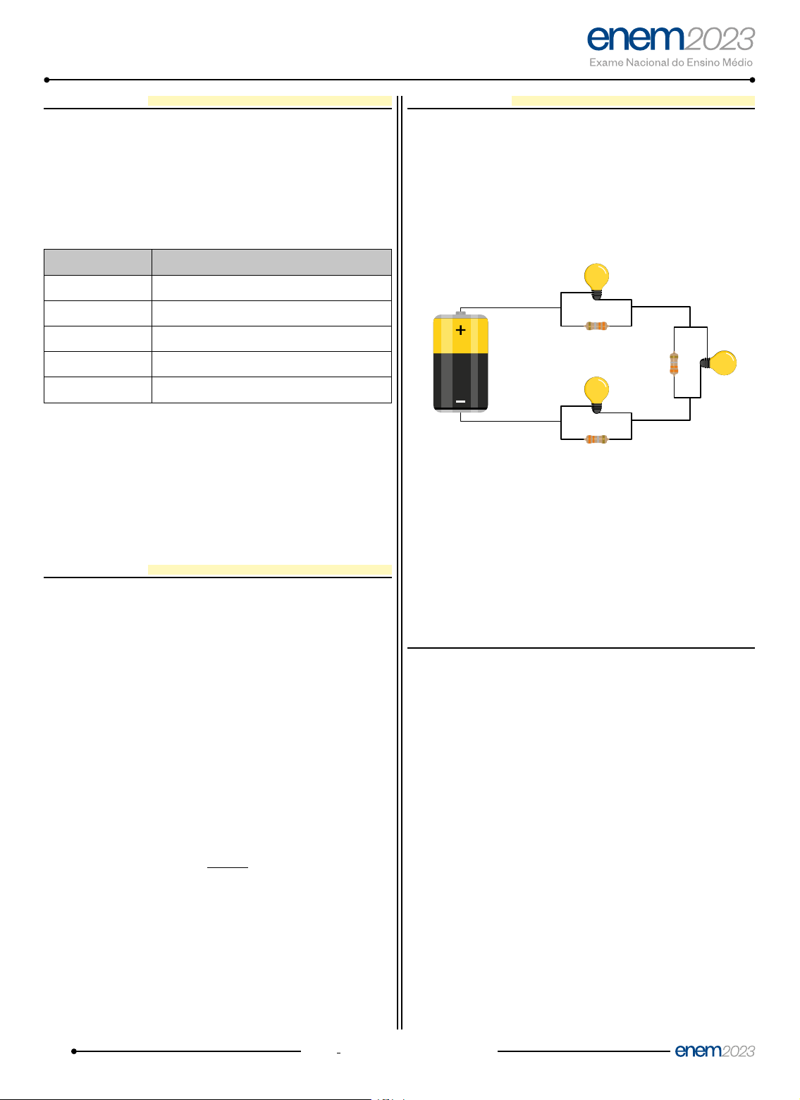 4 CN • 2º DIA • CADERNO 5 • AMARELO QUESTÃO 96 A gasolina é uma mistura de hidrocarbonetos de cadeias saturadas contendo de 8 a 12 átomos de carbono. Além disso, a gasolina de alto desempenho deve conter elevados teores de hidrocarbonetos de cadeias ramificadas, de forma a resistir à compressão e entrar em ignição apenas quando a vela aciona uma centelha elétrica no motor. No quadro, estão apresentados compostos que podem ser utilizados como combustíveis. Composto Nomenclatura I n-decano II n-heptano III 2,2,4-trimetilpentano IV 3-etil-4-metilex-1-eno V 3-etil-2-metilpentan-1-ol Entre esses compostos, aquele que conferirá maior desempenho como combustível é o A A I. B B II. C C III. D D IV. E E V. QUESTÃO 97 De acordo com a Constituição Federal, é competência dos municípios o gerenciamento dos serviços de limpeza e coleta dos resíduos urbanos (lixo). No entanto, há relatos de que parte desse lixo acaba sendo incinerado, liberando substâncias tóxicas para o ambiente e causando acidentes por explosões, principalmente quando ocorre a incineração de frascos de aerossóis (por exemplo: desodorantes, inseticidas e repelentes). A temperatura elevada provoca a vaporização de todo o conteúdo dentro desse tipo de frasco, aumentando a pressão em seu interior até culminar na explosão da embalagem. ZVEIBIL, V. Z. et al. Cartilha de limpeza urbana. Disponível em: www.ibam.org.br. Acesso em: 6 jul. 2015 (adaptado). Suponha um frasco metálico de um aerossol de capacidade igual a 100 mL, contendo 0,1 mol de produtos gasosos à temperatura de 650 °C, no momento da explosão. Considere: R = 0,082 L atm mol K ⋅ ⋅ A pressão, em atm, dentro do frasco, no momento da explosão, é mais próxima de A A 756. B B 533. C C 76. D D 53. E E 13. QUESTÃO 98 O circuito com três lâmpadas incandescentes idênticas, representado na figura, consiste em uma associação mista de resistores. Cada lâmpada (L 1, L2 e L3) é associada, em paralelo, a um resistor de resistência R, formando um conjunto. Esses conjuntos são associados em série, tendo todas as lâmpadas o mesmo brilho quando ligadas à fonte de energia. Após vários dias em uso, apenas a lâmpada L2 queima, enquanto as demais permanecem acesas. Fonte de energia R L³ R R L² L¹ Em relação à situação em que todas as lâmpadas funcionam, após a queima de L2, os brilhos das lâmpadas serão A A os mesmos. B B mais intensos. C C menos intensos. D D menos intenso para L 1 e o mesmo para L3. E E mais intenso para L 1 e menos intenso para L3. *020125AM4* 5CN • 2º DIA • CADERNO 5 • AMARELO QUESTÃO 99 A tecnologia de vacinas de RNA mensageiro (RNAm) é investigada há anos. Avanços científicos em genética molecular permitiram desenvolver uma vacina para controle da pandemia da covid-19 causada pelo vírus de RNA SARS-CoV-2. A vacina de RNAm tem sequências de genes do vírus. Entretanto, por ser muito instável, o RNAm deve ser recoberto por uma capa de lipídios que evita sua degradação e favorece sua ação. Dessa forma, o RNAm desempenhará sua função específica atuando no mesmo compartimento celular de sempre. Disponível em: https://sbim.org.br. Acesso em: 29 nov. 2021 (adaptado). A imunização produzida por esse tipo de vacina é alcançada por meio da A A estimulação de leucócitos induzida pela capa lipídica contendo RNAm. B B atuação do RNAm como sequestrador do vírus para o meio extracelular. C C tradução do RNAm em proteína viral, desencadeando a resposta antigênica. D D competição entre o RNAm vacinal e o RNA viral pelos sítios dos ribossomos. E E incorporação do RNAm viral ao genoma do hospedeiro, gerando novo fenótipo. QUESTÃO 100 Na fertilização in vitro, espermatozoides são adicionados aos gametas femininos retirados de uma mulher. Após o período de incubação, a fecundação é favorecida pela ação de enzimas. Em um procedimento realizado, observou-se que nenhum dos gametas femininos foi fertilizado e, posteriormente, verificou-se que havia sido adicionado, equivocadamente, um coquetel de inibidores das enzimas do acrossomo, no lugar de um dos nutrientes constituintes do meio de cultura. O coquetel de inibidores impediu o(a) A A formação do pronúcleo masculino. B B início da divisão mitótica do zigoto. C C término da segunda divisão meiótica do ovócito. D D passagem do espermatozoide pela corona radiata e zona pelúcida. E E fusão das membranas plasmáticas do ovócito e do espermatozoide. QUESTÃO 101 O fogão por indução funciona a partir do surgimento de uma corrente elétrica induzida no fundo da panela, com consequente transformação de energia elétrica em calor por efeito Joule. A principal vantagem desses fogões é a eficiência energética, que é substancialmente maior que a dos fogões convencionais. A corrente elétrica mencionada é induzida por A A radiação. B B condução. C C campo elétrico variável. D D campo magnético variável. E E ressonância eletromagnética. QUESTÃO 102 Uma academia decide trocar gradualmente seus aparelhos de musculação. Agora, os frequentadores que utilizam os aparelhos do tipo 1 podem também utilizar os aparelhos do tipo 2, representados na figura, para elevar cargas correspondentes às massas M1 e M2, com velocidade constante. A fim de que o exercício seja realizado com a mesma força F , os usuários devem ser orientados a respeito da relação entre as cargas nos dois tipos de aparelhos, já que as polias fixas apenas mudam a direção das forças, enquanto a polia móvel divide as forças. Em ambos os aparelhos, considere as cordas inextensíveis, as massas das polias e das cordas desprezíveis e que não há dissipação de energia. F F M1 M2 Aparelho do tipo 2Aparelho do tipo 1 Para essa academia, qual deve ser a razão M M 2 1 informada aos usuários? A A 1 4 B B 1 2 C C 1 D D 2 E E 4 *020125AM5* 6 CN • 2º DIA • CADERNO 5 • AMARELO QUESTÃO 103 Um garoto comprou vários aba