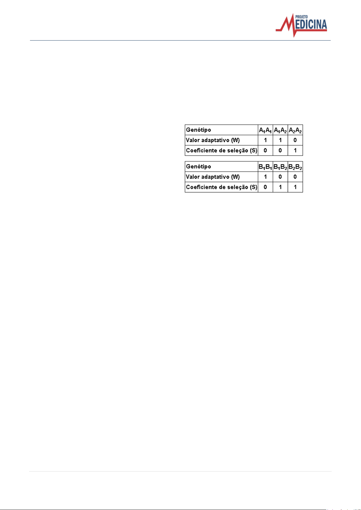 1 | P r o j e t o M e d i c i n a – w w w . p r o j e t o m e d i c i n a . c o m . b r Exercícios de Biologia Genética das Populações – Lista 2 TEXTO PARA AS PRÓXIMAS 2 QUESTÕES. (Uel 97) A anemia falciforme ou siclemia é uma doença hereditária que leva à formação de hemoglobina anormal e, conseqüentemente, de hemácias que se deformam. É condicionada por um alelo mutante s. O indivíduo SS é normal, o Ss apresenta anemia atenuada e o ss geralmente morre. 1. Supondo populações africanas com incidência endêmica de malária, onde a anemia falciforme não sofra influência de outros fatores e onde novas mutações não estejam ocorrendo, a freqüência do gene a) S permanece constante. b) S tende a diminuir. c) S tende a aumentar. d) s permanece constante. e) s tende a aumentar. 2. Verificou-se que em populações de regiões onde a malária é endêmica, os heterozigotos (Ss) são mais resistentes à malária do que os normais (SS). Nesse caso são verdadeiras as afirmações a seguir, EXCETO: a) A malária atua como agente seletivo. b) O indivíduo ss leva vantagem em relação ao SS. c) O indivíduo Ss leva vantagem em relação ao SS. d) Quando a malária for erradicada, ser heterozigoto deixará de ser vantagem. e) Quando a malária for erradicada, haverá mudança na freqüência gênica da população. 3. (Ufrj 2001) Dois 'loci' de uma população, cada um com dois gens alelos, sofrem a ação da seleção natural por muitas gerações, como é mostrado nas tabelas abaixo. O coeficiente de seleção (S) indica os valores com que a seleção natural atua contra o genótipo. O valor adaptativo (W) representa os valores com que a seleção natural favorece o genótipo. Note que (W+S)=1. Qual dos gens, A‚ ou B‚, apresentará a maior freqüência na população? Explique. 4. (Ufc 2001) Descobertas recentes na medicina e na saúde pública, se aplicadas consistentemente, terão algum impacto no curso da evolução humana. Qualquer resistência às doenças infecciosas (de caráter hereditário), como o sarampo e a difteria, conferiria vantagem seletiva a uma família. Assinale a alternativa que mostra, corretamente, os efeitos da imunização em massa sobre a freqüência da resistência ou susceptibilidade inata às doenças. a) A freqüência dos alelos que conferem resistência inata às doenças seria aumentada. b) Os genótipos que produzem pouca ou nenhuma resistência se tornariam comuns. c) A longo prazo, mais pessoas se tornariam independentes de procedimentos médicos. d) A longo prazo, haveria adaptação genética a resistência a muitas doenças. e) Não haveria alteração alguma na freqüência desses alelos.