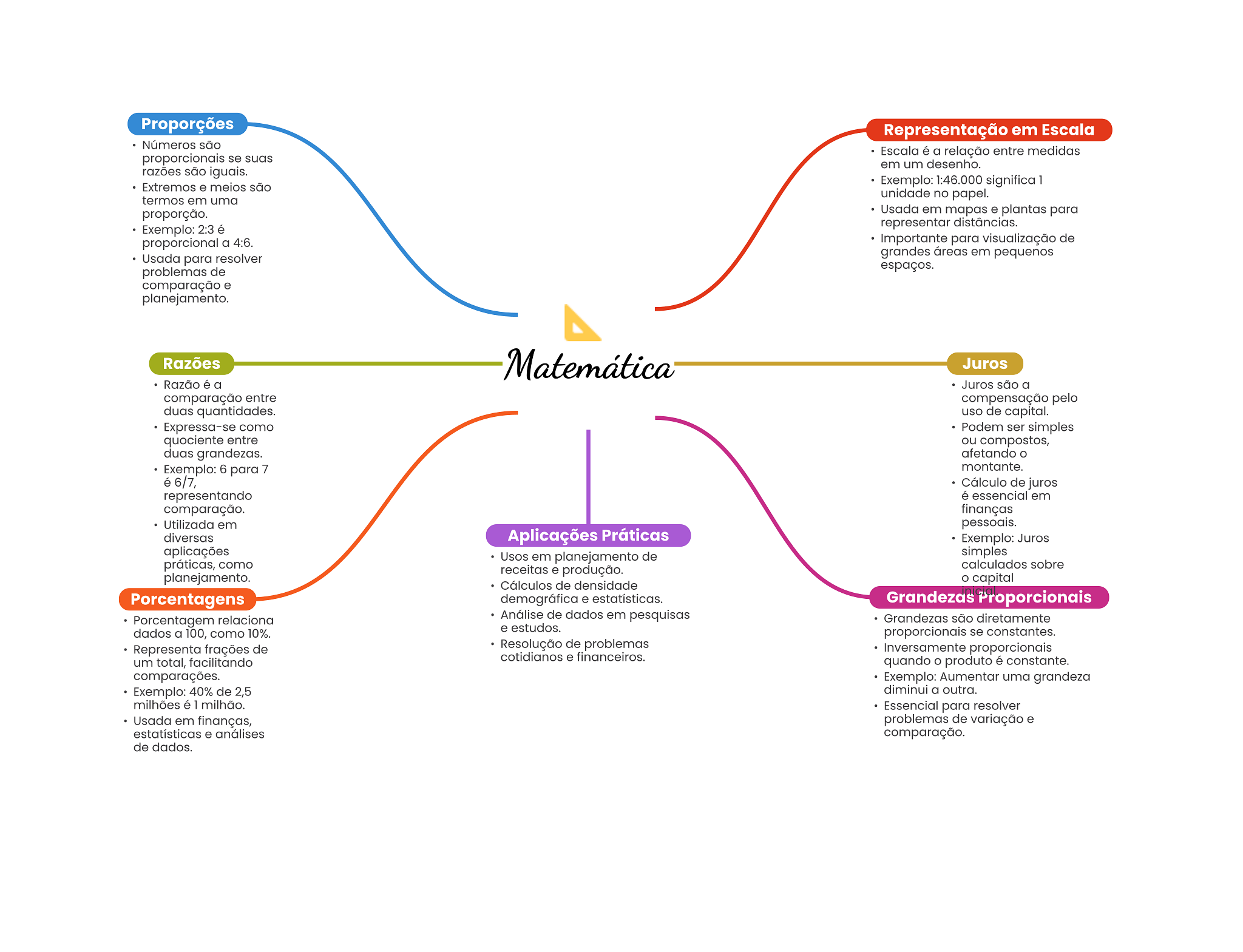 Proporções Representação em Escala Números são Escala é a relação entre medidas proporcionais se suas em um desenho. razões são iguais. Extremos e meios são Exemplo: 1:46.000 significa 1 termos em uma unidade no papel. proporção. Usada em mapas e plantas para representar distâncias. Exemplo: 2:3 é proporcional a 4:6. Importante para visualização de Usada para resolver grandes áreas em pequenos problemas de espaços. comparação e planejamento. Razões Matemática Juros Razão é a Juros são a comparação entre compensação pelo duas quantidades. uso de capital. Expressa-se como Podem ser simples quociente entre ou compostos, duas grandezas. afetando Exemplo: 6 para 7 montante. é 6/7, Cálculo de juros representando é essencial em comparação. finanças Utilizada em pessoais. diversas Aplicações Práticas Exemplo: Juros aplicações Usos em planejamento de simples práticas, como calculados sobre receitas e produção. planejamento. capital Cálculos de densidade Porcentagens demográfica e estatísticas. Grandezas Proporcionais Porcentagem relaciona Análise de dados em pesquisas Grandezas são diretamente e estudos. dados a 100, como 10%. proporcionais se constantes. Representa frações de Resolução de problemas Inversamente proporcionais cotidianos e financeiros. um total, facilitando quando produto é constante. comparações. Exemplo: Aumentar uma grandeza Exemplo: 40% de 2,5 diminui a outra. milhões é 1 milhão. Essencial para resolver Usada em finanças, problemas de variação e estatísticas e análises comparação. de dados.