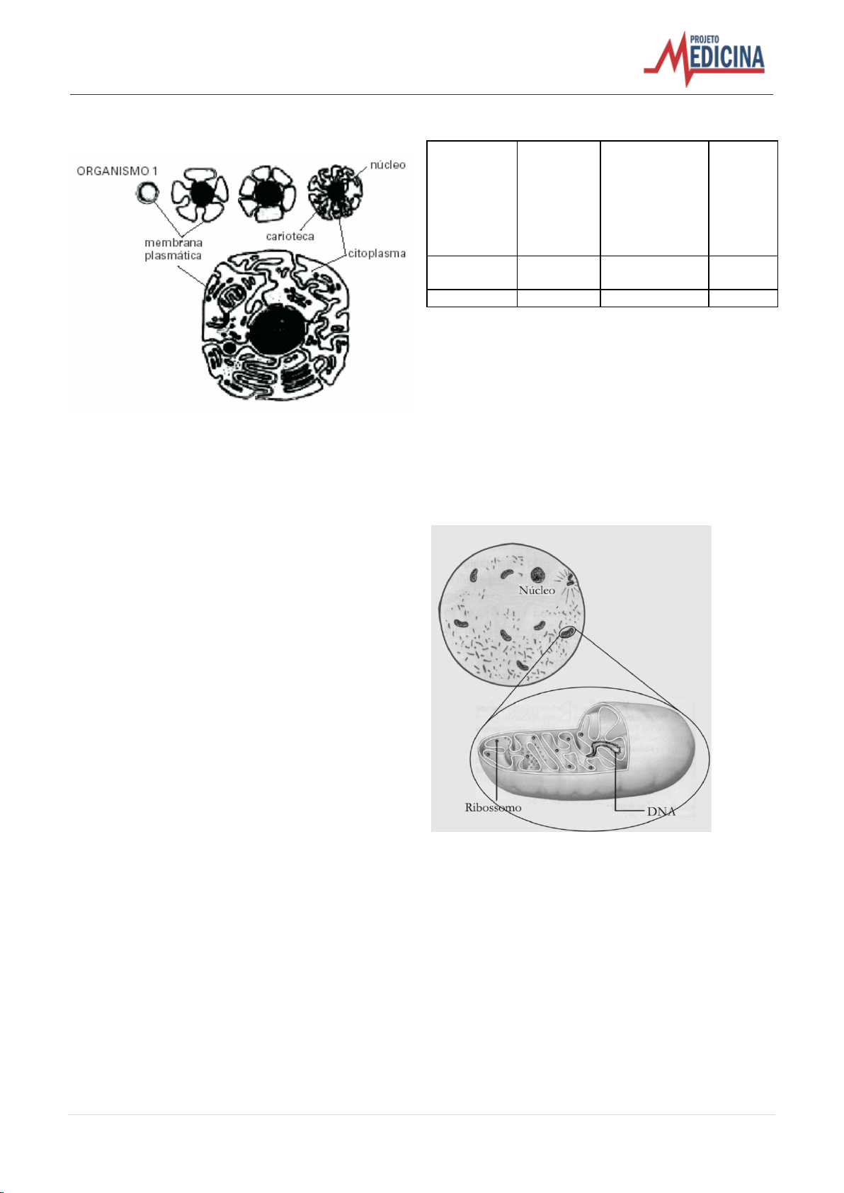11 | Projeto Medicina – www.projetomedicina.com.br III. Uma das principais vantagens da ocorrência da formação das dobras na membrana é o aumento de superfície de contato entre o citoplasma e o meio. Assinale: a) se somente as afirmativas I e III estiverem corretas. b) se somente as afirmativas II e III estiverem corretas. c) se todas as afirmativas estiverem corretas. d) se somente a afirmativa III estiver correta. e) se somente as afirmativas I e II estiverem corretas. . 71) (FGV-2004) Mama África não é só refrão de reggae. Um estudo publicado hoje na revista “Nature” acaba de confirmar que o homem moderno surgiu mesmo no continente africano e começou a se espalhar pelo mundo em algum momento ao redor de 52 mil anos atrás. (...) Seqüenciando o DNA _____ de 53 indivíduos de várias regiões do planeta, a equipe de pesquisadores construiu uma árvore genealógica da espécie, cuja raiz se localiza no continente africano. O DNA _____ é uma ótima ferramenta para estudos de evolução. Como só é transmitido pela mãe, ele escapa ao embaralhamento genético que acontece no momento da fecundação. (Folha de S.Paulo, 07.12.2000) No texto original, parte dele acima reproduzida, constava o tipo de DNA analisado pelos pesquisadores, aqui substituído por um espaço. O tipo de DNA a que o texto se refere é o: a) DNA presente no cromossomo X. b) DNA presente na cromatina sexual, ou Corpúsculo de Barr. c) DNA da mitocôndria. d) DNA do núcleo do óvulo. e) DNA do gene do hormônio progesterona. 72) (Vunesp-2004) Considere a tabela: ORGANELA S TIPOS DE CÉLULAS QUE ESTÃO PRESENTE S COMPONENTE S DA ORGANELA, TAMBÉM PRESENTES NO NÚCLEO CELULAR FUNÇÃO NA CÉLULA 1 Animal e Vegetal 3 Respiraçã o Celular Cloroplastos 2 DNA e RNA 4 a) Indique os termos que podem substituir os números 1, 2, 3 e 4, de modo a estabelecer correspondência com suas respectivas colunas e linhas. b) Indique duas características de cada uma das organelas que permitem levantar a hipótese de que elas tenham se originado de bactérias que há milhões de anos associaram- se a outras células em uma relação mutualística. 73) (UFPB-2006) A célula esquematizada a seguir representa um zigoto humano recém-formado, com destaque feito para uma das organelas existentes nesse tipo celular. De acordo com esses dados, pode-se afirmar que a organela em destaque I. foi herdada do óvulo. II. não é encontrada nos espermatozóides. III. é capaz de se auto-reproduzir. Está(ão) correta(s) a(s) afirmativa(s): a) I, II e III b) apenas I e II c) apenas I e III d) apenas II e III e) apenas III 12 | Projeto Medicina – www.projetomedicina.com.br 74) (UFC-2006) A liberação dos íons cálcio e magnésio no processo de contração de uma fibra muscular estriada esquelética envolve diversos componentes celulares, exceto o: a) lisossomo. b) retículo endoplasmático. c) sarcoplasma. d) sistema T. e) retículo sarcoplasmático. 75) (VUNESP-2005) No esquema estão representadas etapas, numeradas de 1 a 3, de um importante processo que ocorre no interior das células, e algumas organelas envolvidas direta ou indiretamente com esse processo. As etapas que correspondem a 1, 2 e 3, respectivamente, e algumas organelas representadas no esquema, estão corretamente listadas em: a) absorção de aminoácidos, síntese protéica e exportação de proteínas; retículo endoplasmático, lisossomo e mitocôndria. b) fagocitose de macromoléculas, digestão celular e egestão de resíduos; retículo endoplasmático, complexo de Golgi e lisossomo. c) fagocitose de sais minerais, fotossíntese e exportação de compostos orgânicos; cloroplastos e vacúolos. d) absorção de oxigênio, respiração celular e eliminação de dióxido de carbono; mitocôndrias e vacúolos. e) fagocitose de macromoléculas, digestão celular e exportação de proteínas; mitocôndrias e lisossomos. 76) (UEMG-2006) Observe, abaixo, a ultra-estrutura de uma especialização da superfície celular: Sobre essa ultra-estrutura só é CORRETO afirmar que a) ela confere motilidade à superfície celular. b) é própria de células de angiospermas. c) a ultra-estrutura permite maior superfície de contato ao ápice celular. d) ela direciona os cromossomos na divisão celular. 77) (FUVEST-2007) Células de glândulas de animais apresentam nucléolo, retículo endoplasmático rugoso e complexo golgiense (complexo de Golgi) bem desenvolvidos. a) Que relação existe entre o retículo endoplasmático rugoso e o nucléolo? b) Qual é o papel do complexo golgiense na função dessas células? 78) (PUC - PR-2007) Mergulhadas no citoplasma celular encontram-se estruturas com formas e funções definidas, denominadas ORGANELAS CITOPLASMÁTICAS, indispensáveis ao funcionamento do organismo vivo. Associe as organelas com suas respectivas funções: 1. Complexo de Golgi 2. Lisossoma 3. Peroxissoma 4. Ribossoma 5. Centríolo ( ) - responsável pela desintoxicação de álcool e decomposição de peróxido de hidrogênio. ( ) - local de síntese protéica. ( ) - modifica, concentra, empacota e elimina os produtos sintetizados no Retículo Endoplasmático Rugoso. ( ) - vesícula que contem enzima fortemente hidrolíticas formadas pelo Complexo de Golgi. ( ) - responsável pela formação de cílios e flagelos. Assinale a seqüência correta: a) 3 - 4 - 1 - 2 - 5 b) 2 - 3 - 1 - 5 - 4 c) 2 - 1 - 3 - 4 - 5 d) 1 - 3 - 2 - 4 - 5 e) 3 - 4 - 2 - 5 - 1
