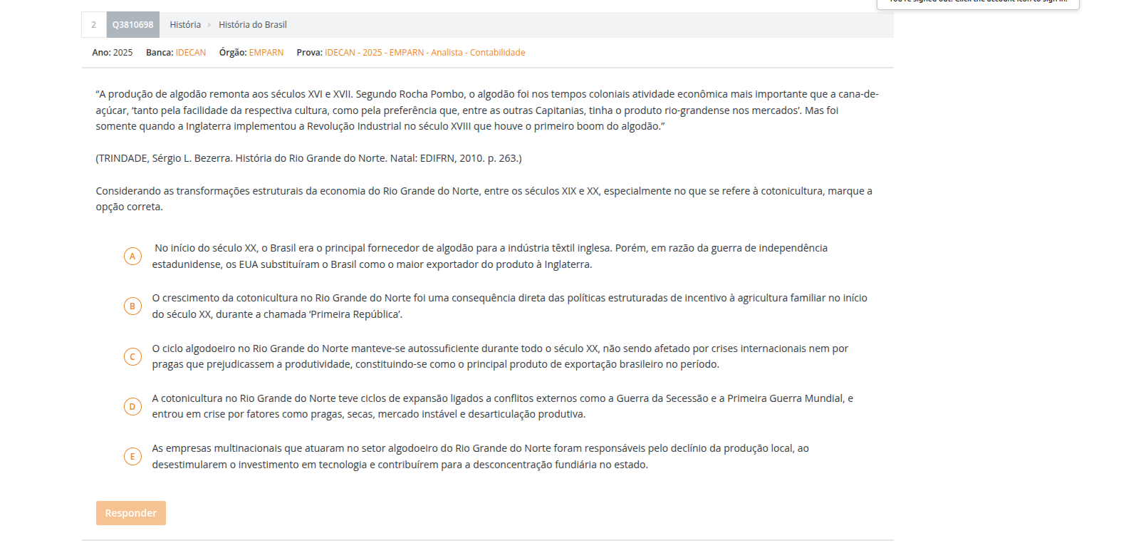 2 Q3810698 História História do Brasil Ano: 2025 Banca: IDECAN Órgão: EMPARN Prova: IDECAN 2025 - EMPARN - Analista Contabilidade "A produção de algodão remonta aos séculos XVI e XVII. Segundo Rocha Pombo, 0 algodão foi nos tempos coloniais atividade econômica mais importante que a cana-de- açúcar, 'tanto pela facilidade da respectiva cultura, como pela preferência que, entre as outras Capitanias, tinha 0 produto rio-grandense nos mercados'. Mas foi somente quando a Inglaterra implementou a Revolução Industrial no século XVIII que houve 0 primeiro boom do algodão." (TRINDADE, Sérgio L. Bezerra. História do Rio Grande do Norte. Natal: EDIFRN, 2010. p. 263.) Considerando as transformações estruturais da economia do Rio Grande do Norte, entre séculos XIX e XX, especialmente no que se refere à cotonicultura, marque a opção correta. No do século XX, O Brasil era principal fornecedor de algodão para a indústria inglesa. Porém, em razão da guerra de independência A estadunidense, EUA Brasil como maior exportador do produto à Inglaterra. O crescimento da cotonicultura no Rio Grande do Norte uma consequência direta das políticas estruturadas de incentivo à agricultura familiar no B do século XX, durante a chamada República'. O ciclo algodoeiro no Rio Grande do Norte manteve-se autossuficiente durante todo século XX, não sendo afetado por crises nem por C pragas que prejudicassem a produtividade, constituindo-se como principal produto de exportação brasileiro no período. A cotonicultura no Rio Grande do Norte teve ciclos de expansão ligados a conflitos externos como a Guerra da Secessão e a Primeira Guerra Mundial, e D entrou em crise por fatores como pragas, secas, mercado instável e desarticulação produtiva. As empresas multinacionais que atuaram no setor algodoeiro do Rio Grande do Norte foram responsáveis pelo declínio da produção local, ao E desestimularem investimento em tecnologia e contribuírem para a desconcentração fundiária no estado. Responder