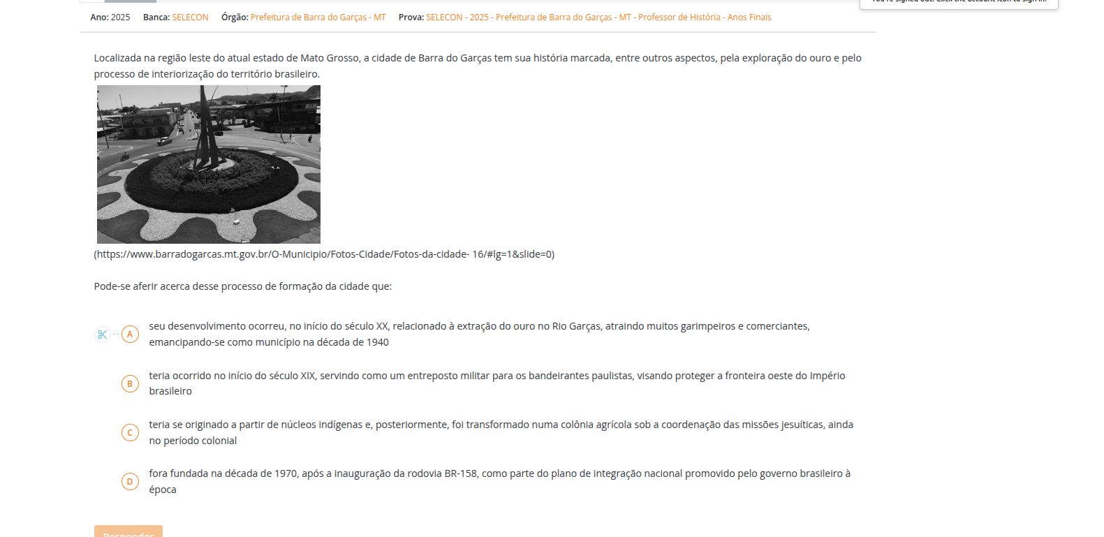 Ano: 2025 Banca: SELECON Órgão: Prefeitura de Barra do Garças MT Prova: SELECON 2025 Prefeitura de Barra do Garças - - MT Professor de História Anos Finais Localizada na região leste do atual estado de Mato Grosso, a cidade de Barra do Garças tem sua história marcada, entre outros aspectos, pela exploração do ouro e pelo processo de interiorização do território brasileiro. Pode-se aferir acerca desse processo de formação da cidade que: seu desenvolvimento ocorreu, no início do século XX, relacionado à extração do ouro no Rio Garças, atraindo muitos garimpeiros e comerciantes, % A emancipando-se como município na década de 1940 teria ocorrido no início do século XIX, servindo como um entreposto militar para os bandeirantes paulistas, visando proteger a fronteira oeste do Império brasileiro teria se originado a partir de núcleos e, posteriormente, fol transformado numa colônia agrícola sob a coordenação das missões ainda C no período colonial fora fundada na década de 1970, após a inauguração da rodovia BR-158, como parte do plano de integração nacional promovido pelo governo brasileiro à D época
