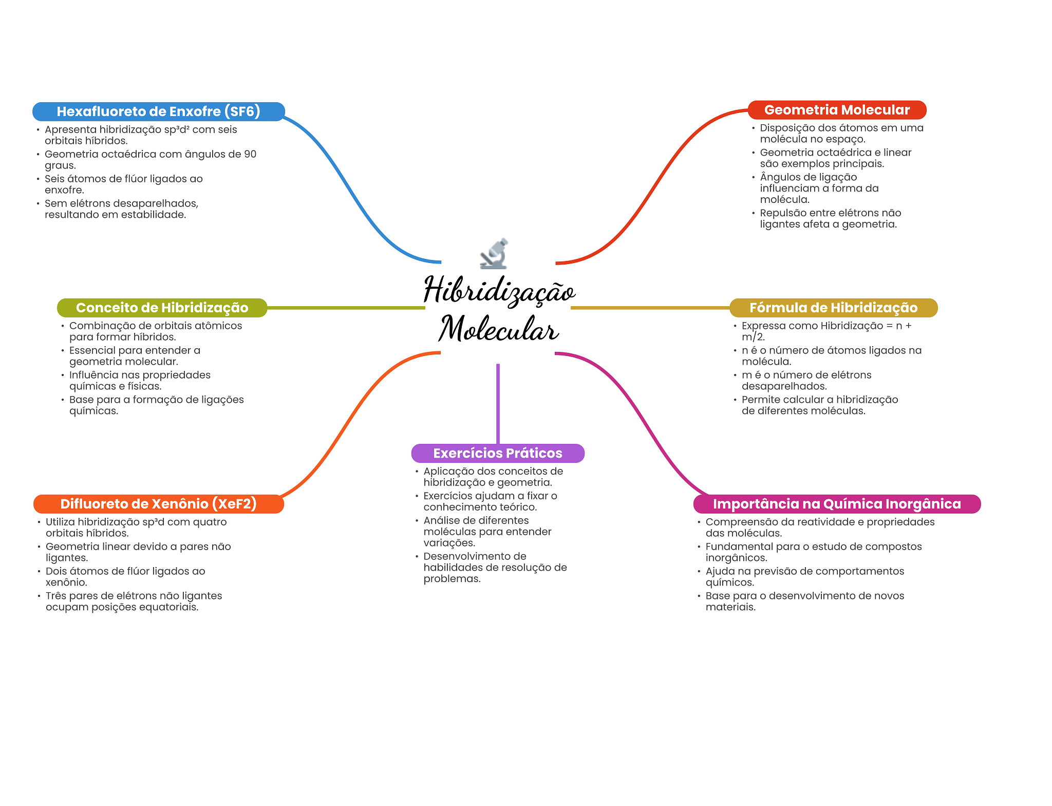 Hexafluoreto de Enxofre (SF6) Geometria Molecular Apresenta hibridização com seis Disposição dos átomos em uma orbitais híbridos. molécula no espaço. Geometria octaédrica com ângulos de 90 Geometria octaédrica e linear graus. são exemplos principais. Seis átomos de flúor ligados ao Ângulos de ligação enxofre. influenciam a forma da Sem elétrons desaparelhados, molécula. resultando em estabilidade. Repulsão entre elétrons não ligantes afeta a geometria. Hibridização Conceito de Hibridização Fórmula de Hibridização Combinação de orbitais atômicos para formar híbridos. Molecular Expressa como Hibridização = n+ m/2. Essencial para entender a n é O número de átomos ligados na geometria molecular. molécula. Influência nas propriedades m é número de elétrons químicas e físicas. desaparelhados. Base para a formação de ligações Permite calcular a hibridização químicas. de diferentes moléculas. Exercícios Práticos Aplicação dos conceitos de hibridização e geometria. Difluoreto de Xenônio (XeF2) Exercícios ajudam a fixar conhecimento teórico. Importância na Química Inorgânica Utiliza hibridização com quatro Análise de diferentes Compreensão da reatividade e propriedades orbitais híbridos. moléculas para entender das moléculas. Geometria linear devido a pares não variações. Fundamental para O estudo de compostos ligantes. Desenvolvimento de inorgânicos. Dois átomos de flúor ligados ao habilidades de resolução de Ajuda na previsão de comportamentos xenônio. problemas. químicos. Três pares de elétrons não ligantes Base para desenvolvimento de novos ocupam posições equatoriais. materiais.