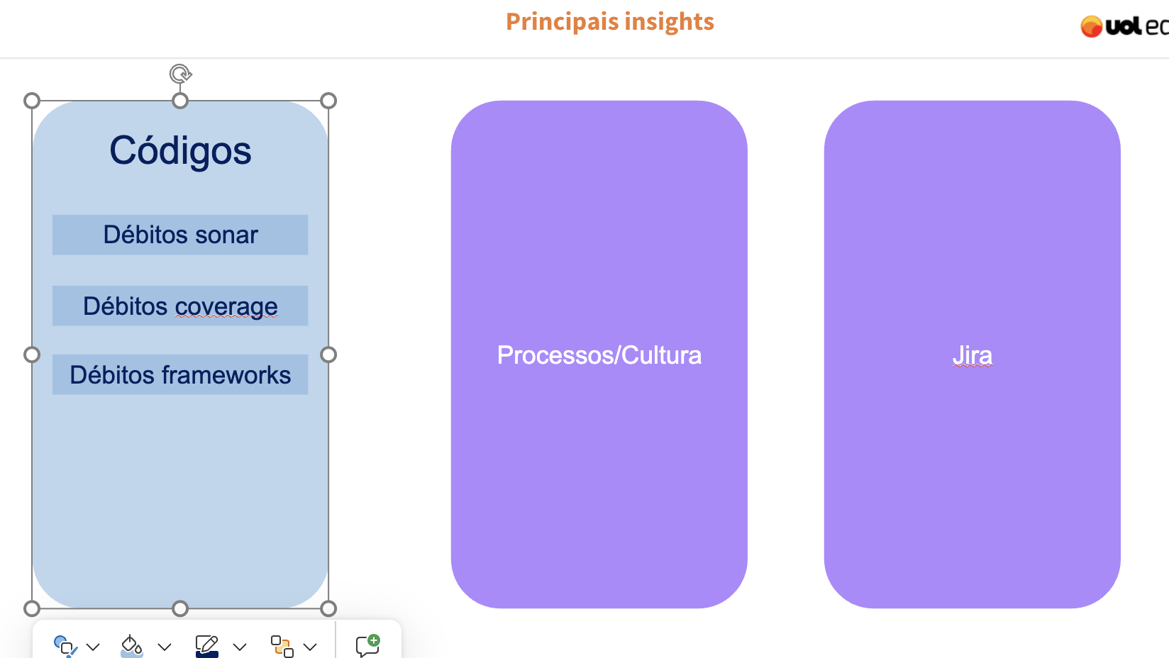Principais insights Códigos Débitos sonar Débitos coverage Processos/Cultura Jira Débitos frameworks +