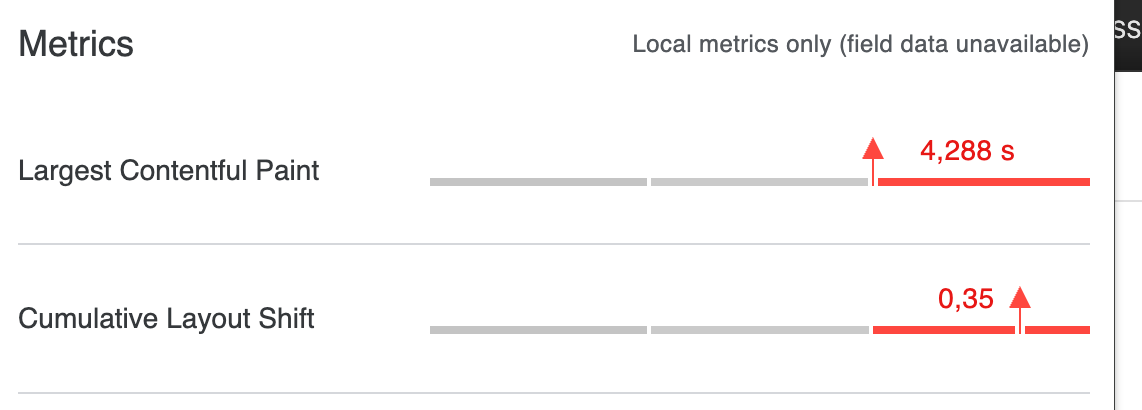 Metrics SS Local metrics only (field data unavailable) 4,288 S Largest Contentful Paint 0,35 Cumulative Layout Shift