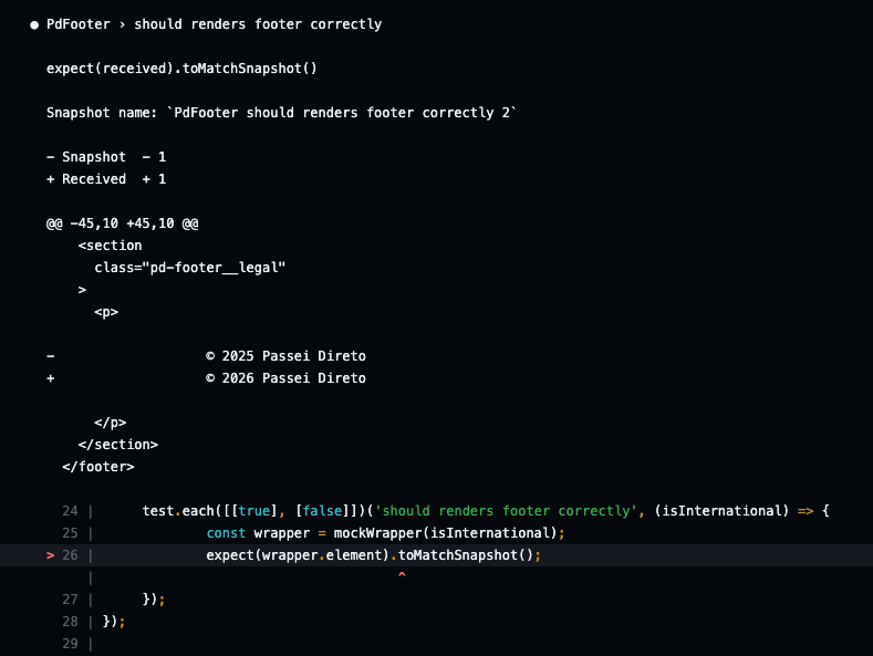 PdFooter > should renders footer correctly expect(received).toMatchSnapshot() Snapshot name: `PdFooter should renders footer correctly - Snapshot - 1 + Received + 1 @@ -45,10 +45,10 @@ - © 2025 Passei Direto + © 2026 Passei Direto 24 I test.each([[true], [false]]) 'should renders footer correctly', (isInternational) => } 25 const wrapper = mockWrapper(isInternational) > 26 expect(wrapper.element).toMatchSnapshot(); 27 I }); 28 }); 29 I