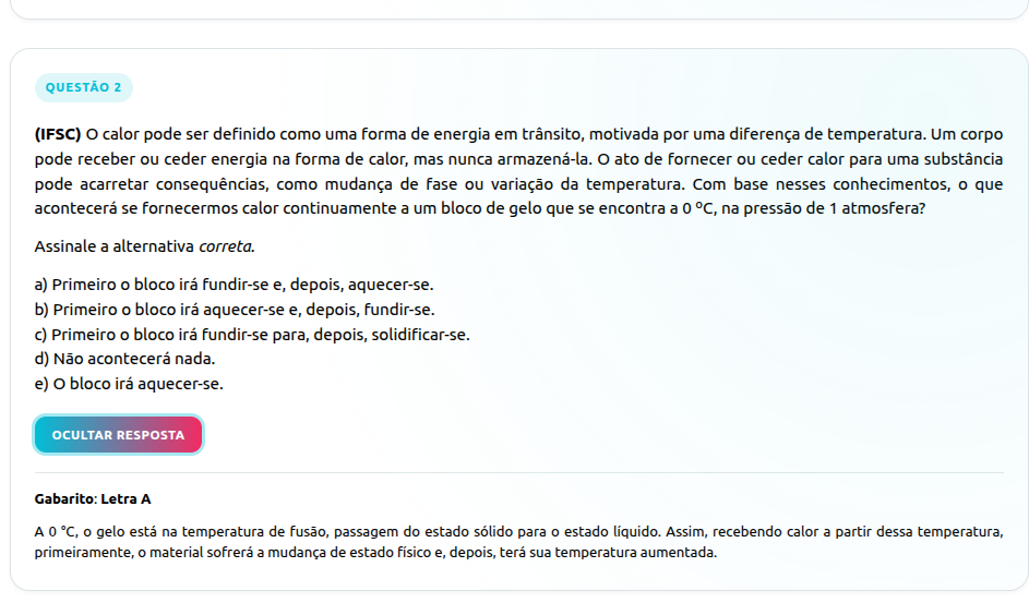 QUESTÃO 2 (IFSC) O calor pode ser definido como uma forma de energia em trânsito, motivada por uma diferença de temperatura. Um coΓpo pode receber ou ceder energia na forma de calor, mas nunca armazená-la. O ato de fornecer ou ceder calor para uma substância pode acarretar consequências, como mudança de fase ou variação da temperatura. Com base nesses conhecimentos, O que acontecerá se fornecermos calor continuamente a um bloco de gelo que se encontra a 0 °C, na pressão de 1 atmosfera? Assinale a alternativa correta. a) Primeiro O bloco irá fundir-se e, depois, aquecer-se. b) Primeiro O bloco irá aquecer-se e, depois, fundir-se. c) Primeiro O bloco irá fundir-se para, depois, solidificar-se. d) Não acontecerá nada. e) O bloco irá aquecer-se. OCULTAR RESPOSTA Gabarito: Letra A A 0 °C, gelo está na temperatura de fusão, passagem do estado para estado líquido. Assim, recebendo calor a partir dessa temperatura, primeiramente, material sofrerá a mudança de estado físico e, depois, terá sua temperatura aumentada.