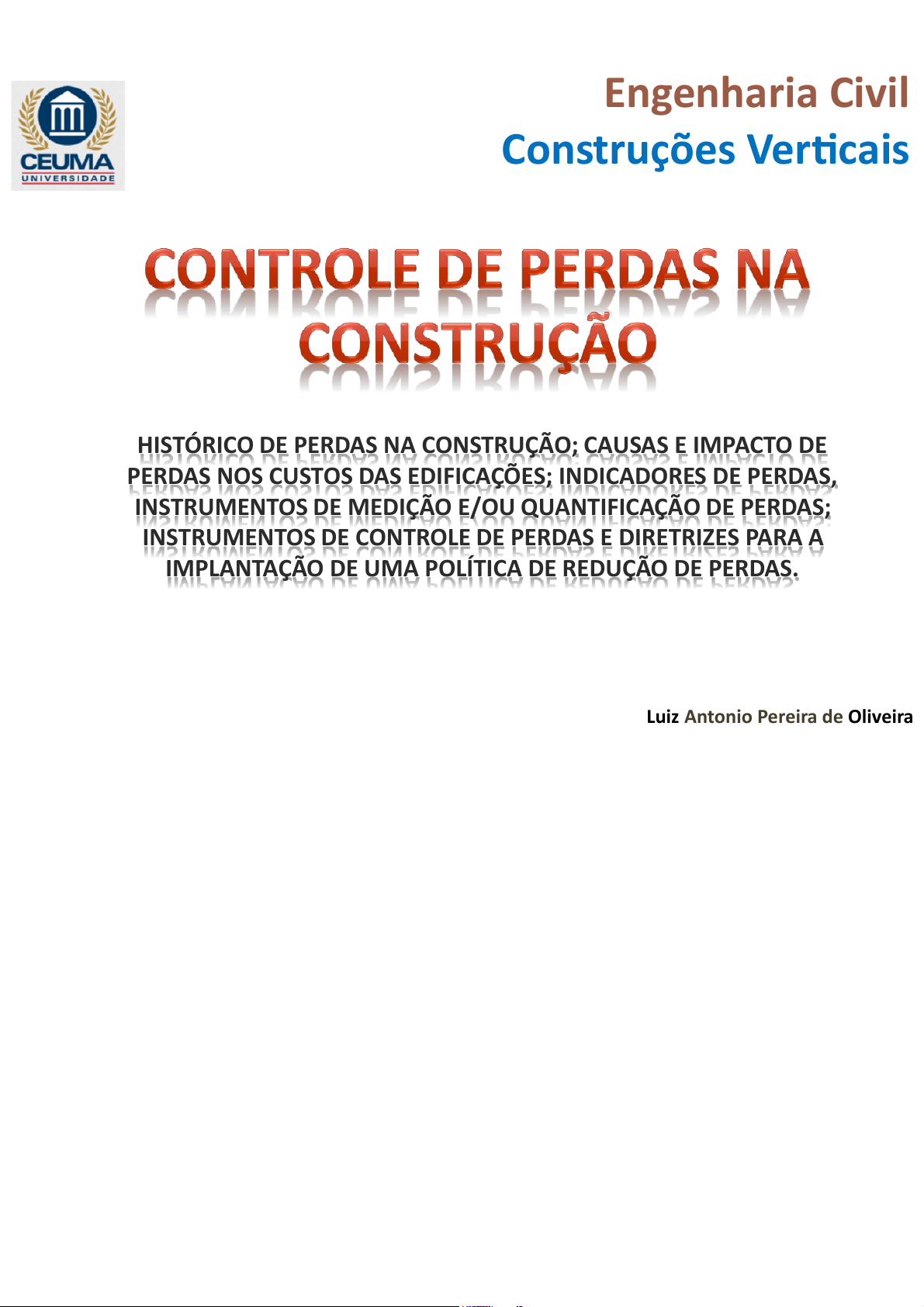 Impresso por Bernardo, E-mail bmeireles@uolinc.com para uso pessoal e privado. Este material pode ser protegido por direitos autorais e não pode ser reproduzido ou repassado para terceiros. 03/02/2026, 14:39:48 Luiz Antonio Pereira de Oliveira Engenharia Civil Construções Verticais HISTÓRICO DE PERDAS NA CONSTRUÇÃO; CAUSAS E IMPACTO DE PERDAS NOS CUSTOS DAS EDIFICAÇÕES; INDICADORES DE PERDAS, INSTRUMENTOS DE MEDIÇÃO E/OU QUANTIFICAÇÃO DE PERDAS; INSTRUMENTOS DE CONTROLE DE PERDAS E DIRETRIZES PARA A IMPLANTAÇÃO DE UMA POLÍTICA DE REDUÇÃO DE PERDAS. Impresso por Bernardo, E-mail bmeireles@uolinc.com para uso pessoal e privado. Este material pode ser protegido por direitos autorais e não pode ser reproduzido ou repassado para terceiros. 03/02/2026, 14:39:48 Engenharia Civil Construções VerticaisCONTROLE DE PERDAS “a quantidade de materiais e mão-de-obra desperdiçados em três obras, é possível a construção de outra idêntica, ou seja, o desperdício atingiria um índice de 33%” (GROHMANN, 1998) “qualquer ineficiência que reflita no uso de equipamentos, materiais e mão- -obra em quantidades superiores àquelas necessárias à de produção da edificação” (SANTOS et al., 1996) “qualquer recurso que se gasta na execução de um produto ou prestação de serviços além do estritamente necessário (mão- -obra, de material, etc) ” (VARGAS et al., 1997) Causas de perdas Impresso por Bernardo, E-mail bmeireles@uolinc.com para uso pessoal e privado. Este material pode ser protegido por direitos autorais e não pode ser reproduzido ou repassado para terceiros. 03/02/2026, 14:39:48 A mão- -obra desqualificadade os improvisos a não valorização da atividade de projeto a falta de planejamento da obra Engenharia Civil Construções VerticaisCONTROLE DE PERDAS Causas de perdas Impresso por Bernardo, E-mail bmeireles@uolinc.com para uso pessoal e privado. Este material pode ser protegido por direitos autorais e não pode ser reproduzido ou repassado para terceiros. 03/02/2026, 14:39:48 Principais causas das anomalias na construção civil Origem do problema Índice (%) 2,1 26,4 60,0Projeto Construção Equipamentos Outros 11,5 Fonte: CONDE (2000) Engenharia Civil Construções VerticaisCONTROLE DE PERDAS Causas de perdas Impresso por Bernardo, E-mail bmeireles@uolinc.com para uso pessoal e privado. Este material pode ser protegido por direitos autorais e não pode ser reproduzido ou repassado para terceiros. 03/02/2026, 14:39:48 Principais causas de anomalias na construção em aço Fonte: PRAVIA e BETINELLI (1998) Engenharia Civil Construções VerticaisCONTROLE DE PERDAS Causas de perdas Impresso por Bernardo, E-mail bmeireles@uolinc.com para uso pessoal e privado. Este material pode ser protegido por direitos autorais e não pode ser reproduzido ou repassado para terceiros. 03/02/2026, 14:39:48 Engenharia Civil Construções VerticaisCONTROLE DE PERDAS Causas de perdas Possibilidade de intervenção e custos acumulados ao longo da produção de um empreendimento de construção Impresso por Bernardo, E-mail bmeireles@uolinc.com para uso pessoal e privado. Este material pode ser protegido por direitos autorais e não pode ser reproduzido ou repassado para terceiros. 03/02/2026, 14:39:48 Lei da evolução dos custos relativos de intervenção. Engenharia Civil Construções VerticaisCONTROLE DE PERDAS Causas de perdas Impresso por Bernardo, E-mail bmeireles@uolinc.com para uso pessoal e privado. Este material pode ser protegido por direitos autorais e não pode ser reproduzido ou repassado para terceiros. 03/02/2026, 14:39:48 Detalhamento do projeto Engenharia Civil Construções VerticaisCONTROLE DE PERDAS Impresso por Bernardo, E-mail bmeireles@uolinc.com para uso pessoal e privado. Este material pode ser protegido por direitos autorais e não pode ser reproduzido ou repassado para terceiros. 03/02/2026, 14:39:48 aumentar a produtividade O que fazer para? a qualidade das obras otimizar os custos otimizar os prazos Engenharia Civil Construções VerticaisCONTROLE DE PERDAS Impresso por Bernardo, E-mail bmeireles@uolinc.com para uso pessoal e privado. Este material pode ser protegido por direitos autorais e não pode ser reproduzido ou repassado para terceiros. 03/02/2026, 14:39:48 padronização e gestão dos processos É obrigatório buscar: padronização e gestão de projetos padronização e gestão de fornecedores novas tecnologias substituição de processos tradicionais Engenharia Civil Construções VerticaisCONTROLE DE PERDAS