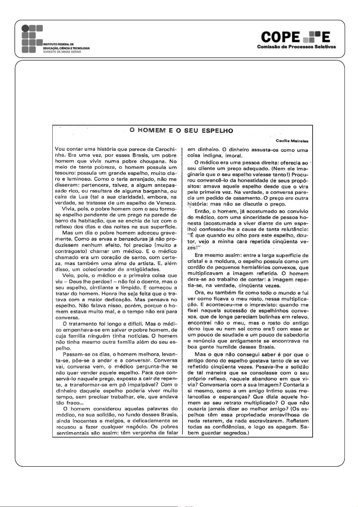 Instituto Federal de Educação, Ciência e Tecnologia do Sudeste de Minas Gerais - COPESE Pag. 1 de 28 PROCESSO SELETIVO 2014-‐1 -‐ Cursos Técnicos Integrados -‐ PORTUGUÊS (Parte I -‐ Interpretação de texto) As questões de 1 a 6 se referem ao estudo do texto abaixo: In: PERSUHN, Janice J. Escrevivendo: comunicação e expressão. São Paulo: Editora do Brasil, 1980, p. 192.