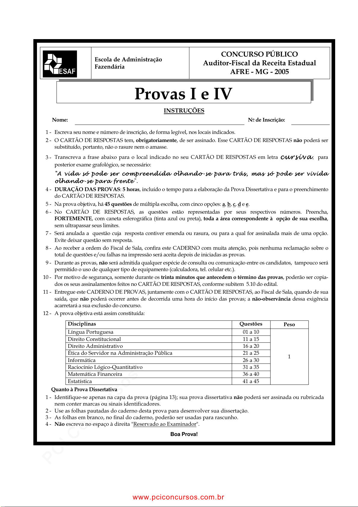 pcimarkpci MDAwMDowMDAwOjAwMDA6MDAwMDowMDAwOmZmZmY6YWE1NToxMmQx:V2VkLCAxMSBGZWIgMjAyNiAxMToxNDo1MyAtMDMwMA== www.pciconcursos.com.br Escola de Administração Fazendária CONCURSO PÚBLICO Auditor-Fiscal da Receita Estadual AFRE - MG - 2005 INSTRUÇÕES Nome: No de Inscrição: 1 - Escreva seu nome e número de inscrição, de forma legível, nos locais indicados. 2 - O CARTÃO DE RESPOSTAS tem, obrigatoriamente, de ser assinado. Esse CARTÃO DE RESPOSTAS não poderá ser substituído, portanto, não o rasure nem o amasse. 3 - Transcreva a frase abaixo para o local indicado no seu CARTÃO DE RESPOSTAS em letra cursiva , para posterior exame grafológico, se necessário: "A vida só pode ser compreendida olhando-se para trás, mas só pode ser vivida olhando-se para frente". 4 - DURAÇÃO DAS PROVAS: 5 horas, incluído o tempo para a elaboração da Prova Dissertativa e para o preenchimento do CARTÃO DE RESPOSTAS. 5 - Na prova objetiva, há 45 questões de múltipla escolha, com cinco opções: a, b, c, d e e. 6 - No CARTÃO DE RESPOSTAS, as questões estão representadas por seus respectivos números. Preencha, FORTEMENTE, com caneta esferográfica (tinta azul ou preta), toda a área correspondente à opção de sua escolha, sem ultrapassar seus limites. 7 - Será anulada a questão cuja resposta contiver emenda ou rasura, ou para a qual for assinalada mais de uma opção. Evite deixar questão sem resposta. 8 - Ao receber a ordem do Fiscal de Sala, confira este CADERNO com muita atenção, pois nenhuma reclamação sobre o total de questões e/ou falhas na impressão será aceita depois de iniciadas as provas. 9 - Durante as provas, não será admitida qualquer espécie de consulta ou comunicação entre os candidatos, tampouco será permitido o uso de qualquer tipo de equipamento (calculadora, tel. celular etc.). 10 - Por motivo de segurança, somente durante os trinta minutos que antecedem o término das provas, poderão ser copia- dos os seus assinalamentos feitos no CARTÃO DE RESPOSTAS, conforme subitem 5.10 do edital. 11 - Entregue este CADERNO DE PROVAS, juntamente com o CARTÃO DE RESPOSTAS, ao Fiscal de Sala, quando de sua saída, que não poderá ocorrer antes de decorrida uma hora do início das provas; a não-observância dessa exigência acarretará a sua exclusão do concurso. 12 - A prova objetiva está assim constituída: Disciplinas Questões Peso Língua Portuguesa 01 a 10 Direito Constitucional 11 a 15 Direito Administrativo 16 a 20 Ética do Servidor na Administração Pública 21 a 25 Informática 26 a 30 Raciocínio Lógico-Quantitativo 31 a 35 Matemática Financeira 36 a 40 Estatística 41 a 45 1 Quanto à Prova Dissertativa 1 - Identifique-se apenas na capa da prova (página 13); sua prova dissertativa não poderá ser assinada ou rubricada nem conter marcas ou sinais identificadores. 2 - Use as folhas pautadas do caderno desta prova para desenvolver sua dissertação. 3 - As folhas em branco, no final do caderno, poderão ser usadas para rascunho. 4 - Não escreva no espaço à direita "Reservado ao Examinador". Boa Prova! Provas I e IV www.pciconcursos.com.br pcimarkpci MDAwMDowMDAwOjAwMDA6MDAwMDowMDAwOmZmZmY6YWE1NToxMmQx:V2VkLCAxMSBGZWIgMjAyNiAxMToxNDo1MyAtMDMwMA== www.pciconcursos.com.br Auditor-Fiscal da Receita Estadual - AFRE - MG - 2005 Provas I e IV 2 LÍNGUA PORTUGUESA O texto abaixo serve de base para as questões 01 e 02. 5 10 15 O setor público não é feito apenas de filas, atrasos, burocracia, ineficiência e reclamações. A sétima edição do Prêmio de Gestão Pública, coordenado pelo Ministério do Planejamento, mostra que o servi- ço público federal também é capaz de oferecer servi- ços com qualidade de primeiro mundo. De 74 institui- ções públicas inscritas, 13 foram selecionadas por ter conseguido, ao longo dos anos, implantar e manter práticas e rotinas de gestão capazes de melhorar de forma crescente seus resultados, tornando-os refe- rências nacionais. O perfil dos premiados mostra que o que está em questão não é tamanho, visibilidade ou importância estratégica, mas, sim, a capacidade de fazer com que as engrenagens da máquina fun- cionem de forma eficiente, constante e muito bem controlada. (Ilhas de Excelência. ISTOÉ, 2/3/2005, com adaptações) 01- A argumentação do texto não permite inferir que a) A melhora de resultados é critério para uma institui- ção pública se tornar referência nacional. b) A capacidade de funcionar de forma eficiente, cons- tante e bem controlada pode resultar em serviços de qualidade. c) A qualidade de primeiro mundo em gestão pública tem como critérios a visibilidade e a importância estratégica da instituição. d) A qualidade de serviços do primeiro mundo constitui parâmetro para avaliação da qualidade de serviços públicos federais no Brasil. e) A premiação considerou como qualidade a implan- tação e a manutenção de práticas de rotina que melhoram os resultados da gestão. 02- Assinale a opção incorreta a respeito das estruturas lin- güísticas do texto. a) A retirada do advérbio “apenas”( .1) preserva a cor- reção gramatical do texto, mas altera as relações significativas entre os argumentos. b) A supressão do advérbio “também”( .5) preserva a correção gramatical, mas retira do texto a idéia pres- suposta de que o serviço público oferece serviços que não são de qualidade. c) A substituição da forma não flexionada de “ter” ( .7) pelo infinitivo flexionado correspondente, terem, respeita as regras gramaticais e preserva a coerência textual. d) A retirada do pronome do termo “tornando-os”( .10) preserva a correção gramatical e a coerência textual, deixando subentendido o objeto de “referências nacionais”( .10 e 11). e) Na linha 11, a substituição do primeiro “que” pelo sinal de dois pontos preserva a correção gramatical e a coerência argumentativa do texto, com a vantagem de evitar uma repetição de pala