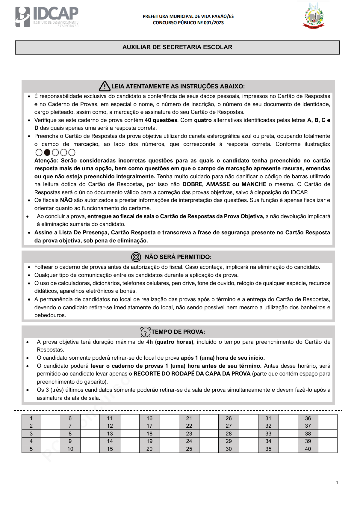 Respostas será o único documento válido para a correção das provas objetivas, salvo à disposição do IDCAP.