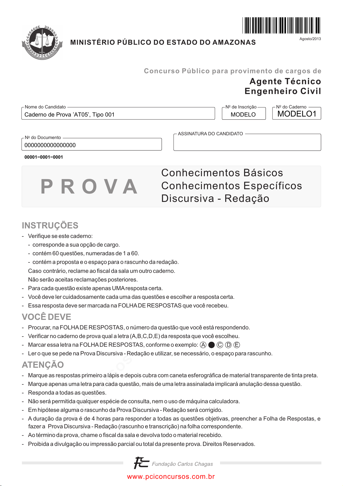 pcimarkpci MDAwMDowMDAwOjAwMDA6MDAwMDowMDAwOmZmZmY6YWE1NToxMmQx:VGh1LCAxMiBGZWIgMjAyNiAxMDo1Nzo1MSAtMDMwMA== www.pciconcursos.com.br N do CadernooN de Inscriçãoo ASSINATURA DO CANDIDATO N do Documentoo Nome do Candidato P R O V A A C D E Agosto/2013 MINISTÉRIO PÚBLICO DO ESTADO DO AMAZONAS Agente Técnico Engenheiro Civil Concurso Público para provimento de cargos de Conhecimentos Básicos Conhecimentos Específicos Discursiva - Redação INSTRUÇÕES VOCÊ DEVE ATENÇÃO - Verifique se este caderno: - corresponde a sua opção de cargo. - contém 60 questões, numeradas de 1 a 60. - contém a proposta e o espaço para o rascunho da redação. Caso contrário, reclame ao fiscal da sala um outro caderno. Não serão aceitas reclamações posteriores. - Para cada questão existe apenas UMAresposta certa. - Você deve ler cuidadosamente cada uma das questões e escolher a resposta certa. - Essa resposta deve ser marcada na FOLHADE RESPOSTAS que você recebeu. - Procurar, na FOLHADE RESPOSTAS, o número da questão que você está respondendo. - Verificar no caderno de prova qual a letra (A,B,C,D,E) da resposta que você escolheu. - Marcar essa letra na FOLHADE RESPOSTAS, conforme o exemplo: - Ler o que se pede na Prova Discursiva - Redação e utilizar, se necessário, o espaço para rascunho. - Marque as respostas primeiro a lápis e depois cubra com caneta esferográfica de material transparente de tinta preta. - Marque apenas uma letra para cada questão, mais de uma letra assinalada implicará anulação dessa questão. - Responda a todas as questões. - Não será permitida qualquer espécie de consulta, nem o uso de máquina calculadora. - Em hipótese alguma o rascunho da Prova Discursiva - Redação será corrigido. - A duração da prova é de 4 horas para responder a todas as questões objetivas, preencher a Folha de Respostas, e fazer a Prova Discursiva - Redação (rascunho e transcrição) na folha correspondente. - Ao término da prova, chame o fiscal da sala e devolva todo o material recebido. - Proibida a divulgação ou impressão parcial ou total da presente prova. Direitos Reservados. Caderno de Prova ’AT05’, Tipo 001 MODELO 0000000000000000 MODELO1 00001−0001−0001 www.pciconcursos.com.br pcimarkpci MDAwMDowMDAwOjAwMDA6MDAwMDowMDAwOmZmZmY6YWE1NToxMmQx:VGh1LCAxMiBGZWIgMjAyNiAxMDo1Nzo1MSAtMDMwMA== www.pciconcursos.com.br 2 MPAMD-Conhecimentos Básicos2 CONHECIMENTOS BÁSICOS Língua Portuguesa Atenção: Considere o texto abaixo para responder às questões de números 1 a 9. Segundo o filósofo americano Michael Sandel, da Uni- versidade Harvard, estamos em uma época em que todas as relações, sejam emocionais, sejam cívicas, estão tendendo a ser tratadas pela lógica da economia de mercado. Diz ele que passa da hora de abrir-se um amplo debate sobre o processo que, "sem que percebamos, sem que tenhamos decidido que é para ser assim, nos faz mudar de uma economia de mercado para uma sociedade de mercado". Já chegamos a ela? Feliz- mente ainda não, mas estamos a caminho. A economia de mercado é o corolário da democracia no campo das atividades produtivas. Mas o que seria uma "socie- dade de mercado"? É uma sociedade em que os valores so- ciais, a vida em família, a natureza, a educação, a saúde, até os direitos cívicos podem ser comprados e vendidos. Em resumo, uma sociedade em que todas as relações humanas tendem a ser mediadas apenas pelo seu aspecto econômico. Sandel reafirma sempre que, com todos os seus defei- tos, o mercado ainda é a forma mais eficiente de organizar a produção e de distribuir bens. Reconhece que a adoção de eco- nomias de mercado levou a prosperidade a regiões do globo que nunca a haviam conhecido. Enfatiza, também, que, junto a essa economia de mercado, vem quase sempre o desenvolvi- mento de instituições democráticas, ambas baseadas na liber- dade. Os riscos apontados são, segundo ele, de outra natureza. Ele alerta para o fato de que, por ser tão eficiente na economia, a lógica econômica está invadindo todos os outros domínios da vida em sociedade. (Adaptado de: Jones Rossi e Guilherme Rosa. Veja, 21 de novembro de 2012. p. 75-77) 1. O filósofo citado no texto (A) censura certa tendência das economias de mercado em sociedades mais desenvolvidas, que acabam in- terferindo no mercado interno de nações menos pri- vilegiadas economicamente. (B) defende uma eventual sociedade de mercado ca- racterizada pela evolução das relações econômicas, em que tudo, incluindo-se até mesmo os valores, deve ser comercializado. (C) reconhece o valor da economia de mercado, porém se preocupa com a tendência atual de comercia- lização dos valores sociais, fato que tende a desvir- tuá-los. (D) aceita a interferência das regras da economia em to- dos os campos da atividade humana, ainda que seja necessário incluir os valores sociais nas mesmas condições de bens e de produtos. (E) afirma que a liberdade democrática presente em uma sociedade de mercado justifica a comercia- lização, tanto de bens e de produtos, quanto dos valores que norteiam essa sociedade. 2. Conclui-se corretamente do texto que (A) sociedades bem desenvolvidas são aquelas que conseguem valorizar as relações humanas de acor- do com as leis da economia de mercado. (B) valores sociais vêm se transformando, atualmente, em objetos de transações comerciais, segundo a lógica de mercado. (C) economia de mercado e sociedade de mercado são conceitos que se fundiram atualmente, pois o preço direciona todas as transações de compra e venda. (D) sociedade de mercado é aquela que recebe, atual- mente, os benefícios conjuntos da economia e da democracia, gerados pela economia de mercado. (E) relações humanas podem ser objetos habituais de negociação entre partes interessadas, em respeito à liberdade democrática vigente na economia de mer- cado. _________________________________________________________ 3. Em relação ao 2 o parágraf