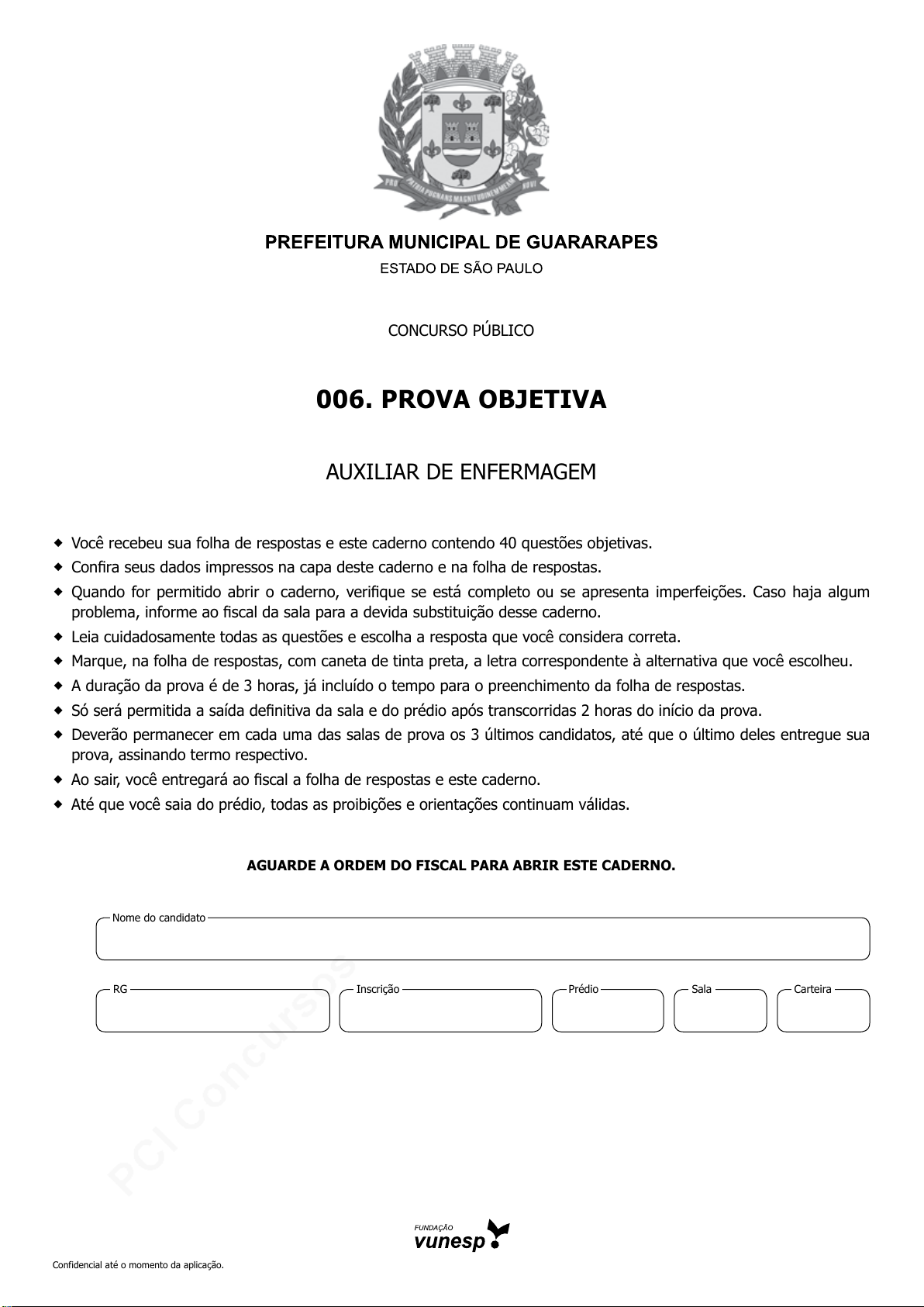 pcimarkpci MDAwMDowMDAwOjAwMDA6MDAwMDowMDAwOmZmZmY6YWE1NToxMmJh:RnJpLCAyMCBGZWIgMjAyNiAxMzo1ODoxMCAtMDMwMA== www.pciconcursos.com.br Confidencial até o momento da aplicação. concurso público 006. Prova objetiva auxiliar de enfermagem � Você recebeu sua folha de respostas e este caderno contendo 40 questões objetivas. � Confira seus dados impressos na capa deste caderno e na folha de respostas. � Quando for permitido abrir o caderno, verifique se está completo ou se apresenta imperfeições. Caso haja algum problema, informe ao fiscal da sala para a devida substituição desse caderno. � Leia cuidadosamente todas as questões e escolha a resposta que você considera correta. � Marque, na folha de respostas, com caneta de tinta preta, a letra correspondente à alternativa que você escolheu. � A duração da prova é de 3 horas, já incluído o tempo para o preenchimento da folha de respostas. � Só será permitida a saída definitiva da sala e do prédio após transcorridas 2 horas do início da prova. � Deverão permanecer em cada uma das salas de prova os 3 últimos candidatos, até que o último deles entregue sua prova, assinando termo respectivo. � Ao sair, você entregará ao fiscal a folha de respostas e este caderno. � Até que você saia do prédio, todas as proibições e orientações continuam válidas. aguarde a ordem do fiscal Para abrir este caderno. Nome do candidato Prédio sala carteiraInscriçãorg pcimarkpci MDAwMDowMDAwOjAwMDA6MDAwMDowMDAwOmZmZmY6YWE1NToxMmJh:RnJpLCAyMCBGZWIgMjAyNiAxMzo1ODoxMCAtMDMwMA== www.pciconcursos.com.br Confidencial até o momento da aplicação. pcimarkpci MDAwMDowMDAwOjAwMDA6MDAwMDowMDAwOmZmZmY6YWE1NToxMmJh:RnJpLCAyMCBGZWIgMjAyNiAxMzo1ODoxMCAtMDMwMA== www.pciconcursos.com.br 3 pgar2501/006-auxiliarEnfermagemConfidencial até o momento da aplicação. conhecimentos gerais Língua Portuguesa Leia a tira para responder às questões 01 e 02: (Bill Waterson, “O Melhor de Calvin”. https://cultura.estadao.com.br/quadrinhos, 04.04.2025) 01. Uma afirmação coerente com as informações da tira, e em conformidade com a norma-padrão, é: (A) Se o aluno tivesse esforçado-se para ter boas notas, não haveriam comentários da professora que afetariam sua autoestima. (B) A professora disse que o aluno dever-se-ia esforçar porque vem surgindo notas baixas que estão afetando sua autoestima. (C) “Me sinto afetado por esta nota ruim e pela sua negação do fato de que sou uma vítima” – disse ironicamente o menino. (D) A nota ruim e a negação do fato pela professora fizeram com que o aluno se sentisse mal, com a sua autoestima afetada. (E) É flagrante que a nota ruim do aluno é um fato isolado nos seus estudos, pois a professora não recriminou-o por aquilo. 02. Considerando a interlocução com o uso do pronome “Você”, as informações do segundo quadrinho admitem a reescrita: (A) Então, esforce-se mais e não tire notas baixas. (B) Então, esforça-se mais e não tire notas baixas. (C) Então, esforce-se mais e não tira notas baixas. (D) Então, esforça-se mais e não tira notas baixas. (E) Então, esforças-se mais e não tires notas baixas. pcimarkpci MDAwMDowMDAwOjAwMDA6MDAwMDowMDAwOmZmZmY6YWE1NToxMmJh:RnJpLCAyMCBGZWIgMjAyNiAxMzo1ODoxMCAtMDMwMA== www.pciconcursos.com.br 4pgar2501/006-auxiliarEnfermagem Confidencial até o momento da aplicação. 03. As informações do texto permitem concluir que (A) as crianças nascidas após a promulgação da Consti- tuição federal tiveram os seus direitos básicos certa- mente garantidos. (B) as crianças vêm perdendo oportunidades de ascen- são social porque se dedicam pouco às avaliações nacionais e internacionais. (C) as crianças cujos pais são pobres têm 50% de chances de ingressarem no grupo dos 10% mais ricos do país, quando adultas. (D) as crianças nascidas pobres tendem a ser adultos pobres, porque a mobilidade social praticamente inexiste no Brasil. (E) as crianças vislumbram muitas chances de uma vida melhor que a de seus pais, considerando educação, saúde, trabalho e renda. 04. A conclusão do texto sugere que (A) a oferta de futuro digno às crianças independe de mudanças realizadas por autoridades governa- mentais. (B) o futuro digno para as crianças de hoje exige que haja o rompimento com o ciclo de desigualdades sociais. (C) a melhor maneira de garantir dignidade aos adultos do futuro é com a manutenção da ordem social atual. (D) o rompimento com o ciclo de desigualdades sociais terá impacto praticamente nulo para o futuro das crianças. (E) o Brasil reconhece os direitos de seus cidadãos, embora não tenha condições de transformar a reali- dade social. 05. O termo destacado está empregado em sentido figurado em: (A) O estudo sobre mobilidade intergeracional traça um cenário bastante desolador... (2o parágrafo) (B) Tudo isso indica que o Brasil desonrou compromissos firmados com o seu povo... (4o parágrafo) (C) E é essa mesma Constituição que diz aos brasileiros que a criança é uma prioridade absoluta. (4o pará- grafo) (D) Os indicadores de educação apontam que a quali- dade do ensino brasileiro é baixa... (6o parágrafo) (E) Se nada mudar, o País e milhões dos seus cidadãos estarão condenados a futuro algum. (7o parágrafo) Leia o texto para responder às questões de 03 a 10: Crianças condenadas à estagnação A probabilidade de um brasileiro nascer pobre e morrer pobre é alta. Menos de 2% das crianças cujos pais estão entre os 50% mais pobres do País alcançarão a renda dos 10% mais ricos. E o mais provável é que 66% delas ainda estejam na mesma faixa dos ascendentes quando chegarem à fase adulta da vida. Essas projeções são do recém-lançado Atlas da Mobili- dade Social do Brasil, do Instituto Mobilidade e Desenvolvi- mento Social (IMDS). O estudo sobre mobilidade intergera- cional traça um cenário bastante desolador, haja vista que a imobilidade social no País parece ser a regra. De a