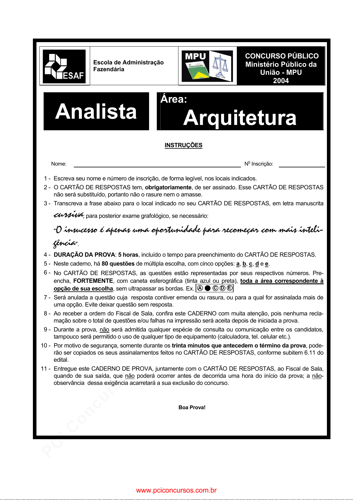 pcimarkpci MDAwMDowMDAwOjAwMDA6MDAwMDowMDAwOmZmZmY6YWE1NToxMmJh:RnJpLCAyMCBGZWIgMjAyNiAxMzo1Nzo1NCAtMDMwMA== www.pciconcursos.com.br Escola de Administração Fazendária CONCURSO PÚBLICO Ministério Público da União - MPU 2004 Analista Área: Arquitetura INSTRUÇÕES Nome: No Inscrição: 1 - Escreva seu nome e número de inscrição, de forma legível, nos locais indicados. 2 - O CARTÃO DE RESPOSTAS tem, obrigatoriamente, de ser assinado. Esse CARTÃO DE RESPOSTAS não será substituído, portanto não o rasure nem o amasse. 3 - Transcreva a frase abaixo para o local indicado no seu CARTÃO DE RESPOSTAS, em letra manuscrita cursiva, para posterior exame grafológico, se necessário: "O insucesso é apenas uma oportunidade para recomeçar com mais inteli- gência". 4 - DURAÇÃO DA PROVA: 5 horas, incluído o tempo para preenchimento do CARTÃO DE RESPOSTAS. 5 - Neste caderno, há 80 questões de múltipla escolha, com cinco opções: a, b, c, d e e. 6 - No CARTÃO DE RESPOSTAS, as questões estão representadas por seus respectivos números. Pre- encha, FORTEMENTE, com caneta esferográfica (tinta azul ou preta), toda a área correspondente à opção de sua escolha, sem ultrapassar as bordas. Ex. 7 - Será anulada a questão cuja resposta contiver emenda ou rasura, ou para a qual for assinalada mais de uma opção. Evite deixar questão sem resposta. 8 - Ao receber a ordem do Fiscal de Sala, confira este CADERNO com muita atenção, pois nenhuma recla- mação sobre o total de questões e/ou falhas na impressão será aceita depois de iniciada a prova. 9 - Durante a prova, não será admitida qualquer espécie de consulta ou comunicação entre os candidatos, tampouco será permitido o uso de qualquer tipo de equipamento (calculadora, tel. celular etc.). 10 - Por motivo de segurança, somente durante os trinta minutos que antecedem o término da prova, pode- rão ser copiados os seus assinalamentos feitos no CARTÃO DE RESPOSTAS, conforme subitem 6.11 do edital. 11 - Entregue este CADERNO DE PROVA, juntamente com o CARTÃO DE RESPOSTAS, ao Fiscal de Sala, quando de sua saída, que não poderá ocorrer antes de decorrida uma hora do início da prova; a não- observância dessa exigência acarretará a sua exclusão do concurso. Boa Prova! MPU A B C D E www.pciconcursos.com.br pcimarkpci MDAwMDowMDAwOjAwMDA6MDAwMDowMDAwOmZmZmY6YWE1NToxMmJh:RnJpLCAyMCBGZWIgMjAyNiAxMzo1Nzo1NCAtMDMwMA== www.pciconcursos.com.br Analista - MPU - 2004 Área: Arquitetura 2 LÍNGUA PORTUGUESA Leia os itens seguintes, que formam um texto, para res- ponder às questões 01 e 02. 01- Marque o item que expressa o tema central desse texto. a) Se a data da Abolição marcará no Brasil o fim do predomínio agrário, o quadro político instituído no ano seguinte quer responder à conveniência de uma forma adequada à nova composição social. b) Existe um elo secreto estabelecendo entre esses dois acontecimentos e numerosos outros uma revo- lução lenta, mas segura e concertada, a única que, rigorosamente, temos experimentado em toda a nos- sa vida nacional. c) Processa-se, é certo, sem o grande alarde de algu- mas convulsões de superfície, que os historiadores exageram freqüentemente em seu zelo, minucioso e fácil, de compendiar as transformações exteriores da existência dos povos. d) Perto dessa revolução, a maioria de nossas agita- ções do período republicano, como as suas similares das nações da América espanhola, parecem desvios na trajetória da vida política legal do Estado compa- ráveis a essas antigas “revoluções palacianas”, e) tão familiares aos conhecedores da história européia. (Sérgio Buarque de Holanda) 02- Marque V diante das asserções corretas e F diante das falsas e depois escolha a seqüência certa. ( ) Em: “Se a data da Abolição marcará no Brasil o fim do predomínio agrário ...”, ( .1 e 2 da opção a da questão 01) empregando-se no presente a forma verbal, alte- ra-se o sentido do enunciado. ( ) Em “... estabelecendo entre esses dois acontecimen- tos e numerosos outros uma revolução lenta...” ( .1, 2 e 3 da opção b da questão 01), o autor poderia ter usado uma oração adjetiva desenvolvida mantendo o mes- mo sentido. ( ) Em “...temos experimentado em toda a nossa vida nacional...” ( .4 e 5 da opção b da questão 01), pode-se dispensar o artigo sem prejuízo da ortodoxia gramati- cal. ( ) Em “Processa-se, é certo, sem o grande alarde de algumas convulsões de superfície...” ( .1 e 2 da opção c da questão 01), o sujeito implícito é “elo secreto”. ( ) Em “comparáveis a essas antigas revoluções palaci- anas” ( . 4 e 5 da opção d da questão 01), o termo subli- nhado opõe-se conceitualmente, no texto, a “revolu- ção lenta, mas segura e concertada” ( . 2 e 3 da opção b da questão 01). a) V, F, F, V, V b) F, V, V, F, V c) F, V, F, F, V d) F, V, V, F, F e) F, F, V, V, F 03- Entre as diferentes versões do mesmo texto, escolha a que representa a melhor opção estilística. a) Os portugueses foram pioneiros da conquista do trópi- co para a civilização e eles tiveram, nessa proeza, sua maior missão histórica. E sem embargo de tudo quan- to se possa alegar contra sua obra, forçoso é reco- nhecer que eles foram não somente os portadores efetivos como os portadores naturais dessa missão. Nenhum outro povo do Velho Mundo achou-se tão bem armado para se aventurar à exploração regular e intensa das terras próximas da linha equinocial, onde os homens depressa degeneram, segundo o conceito generalizado na era quinhentista. b) Foram os portugueses os pioneiros da conquista do trópico para a civilização, tendo nessa proeza sua maior missão histórica. Não obstante tudo quanto se possa alegar contra sua obra, forçoso é reconhecer que eles foram não somente os portadores efetivos como os portadores naturais dessa missão. Nenhum outro povo do Velho Mundo achou-se tão bem armado para se aventurar à 