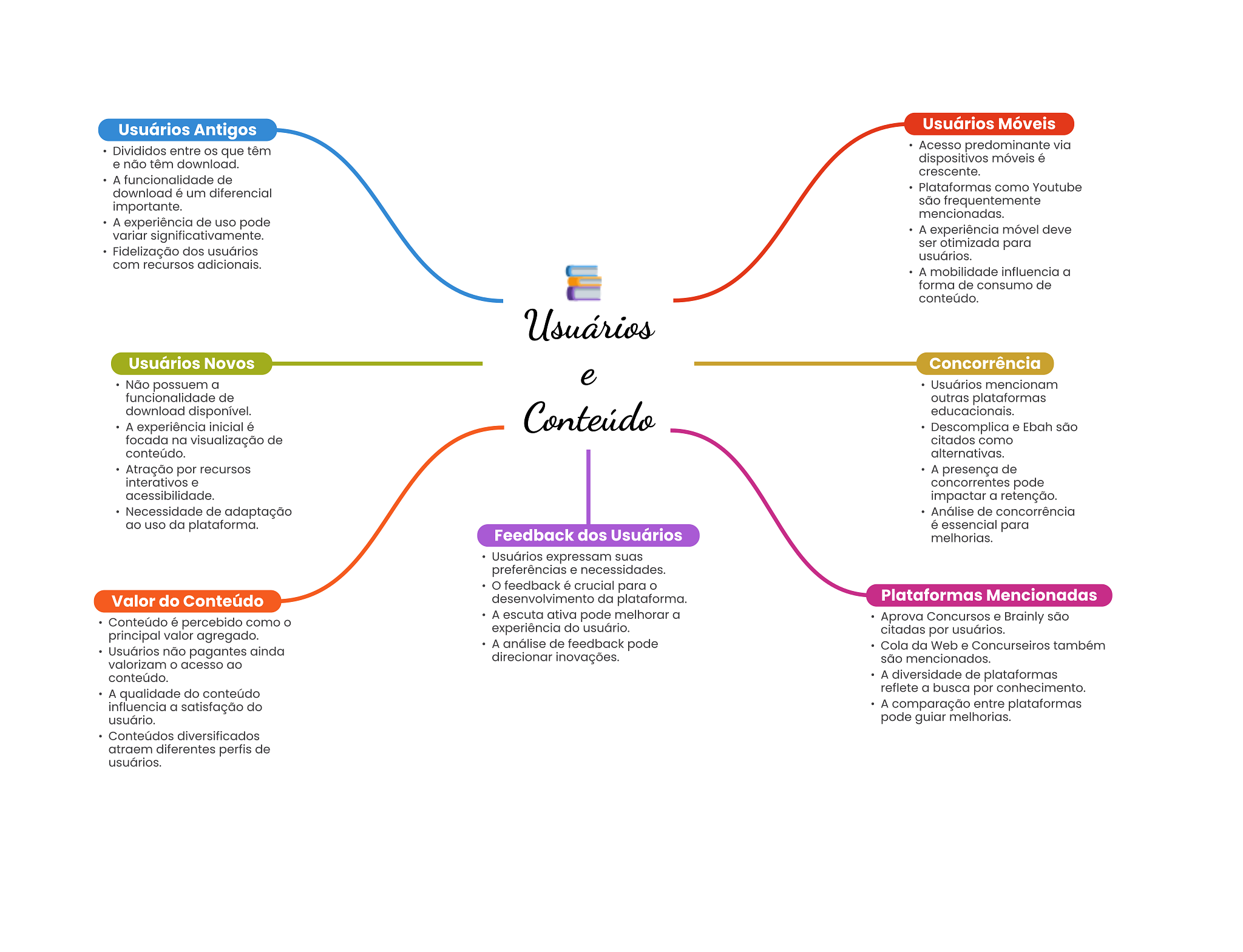 Usuários Antigos Usuários Móveis Divididos entre os que têm Acesso predominante via e não têm download. dispositivos móveis é crescente. A funcionalidade de Plataformas como Youtube download é um diferencial importante. são frequentemente mencionadas. A experiência de uso pode variar significativamente. A móvel deve ser otimizada para Fidelização dos usuários usuários. com recursos adicionais. A mobilidade influencia a forma de consumo de conteúdo. Usuários Usuários Novos Concorrência e Não possuem a Usuários mencionam funcionalidade de outras plataformas download disponível. A experiência inicial é Conteúdo educacionais. Descomplica e Ebah são focada na visualização de citados como conteúdo. alternativas. Atração por recursos A presença de interativos e concorrentes pode acessibilidade. impactar a retenção. Necessidade de adaptação Análise de concorrência ao uso da plataforma. é essencial para Feedback dos Usuários melhorias. Usuários expressam suas preferências e necessidades. feedback é crucial para Valor do Conteúdo desenvolvimento da plataforma. Plataformas Mencionadas A escuta ativa pode melhorar a Conteúdo é percebido como Aprova Concursos e Brainly são experiência do usuário. principal valor agregado. citadas por usuários. A análise de feedback pode Cola da Web e Concurseiros também Usuários não pagantes ainda valorizam acesso ao direcionar inovações. são mencionados. conteúdo. A diversidade de plataformas A qualidade do conteúdo reflete a busca por conhecimento. influencia a satisfação do A comparação entre plataformas usuário. pode guiar melhorias. Conteúdos diversificados atraem diferentes perfis de usuários.