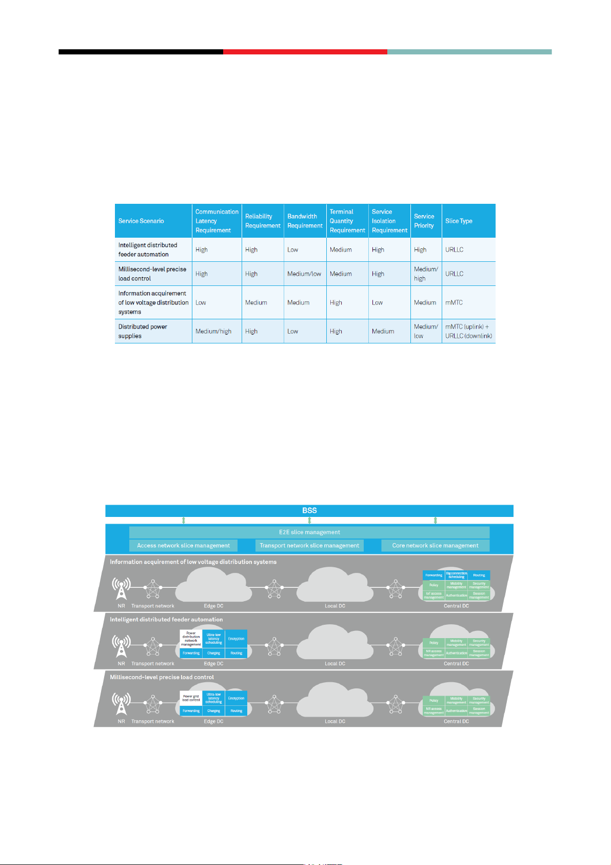 6 2.2.3. Deployment Perspective From the perspective of service deployment, 5G not only enables new power grid industrial control services but also inherits the information collection services supported by the current 2G/3G/4G public networks. In this way, multiple slices of the power grid can be deployed, managed, and maintained in a unified manner, which helps customers of the power grid industry reduce costs effectively. Table 1. 5G network slices meeting various requirements of different Smart Grid scenarios 2.3. Designing 5G network slicing solution for smart grid 2.3.1. Smart grid's multi-slice architecture Based on the application scenarios of smart grids and the architecture of 5G network slicing, the overall architecture of 5G smart grid design and management is as follows. The slices of information acquirement of low voltage distribution systems, intelligent distributed feeder automation, and millisecond-level precise load control are used to meet the technical specification requirements of different service scenarios. Domain-specific slice management and integrated end-to-end (E2E) slice management are used to meet service requirements in these scenarios. Figure 7. 5G Network slicing architecture of smart grids