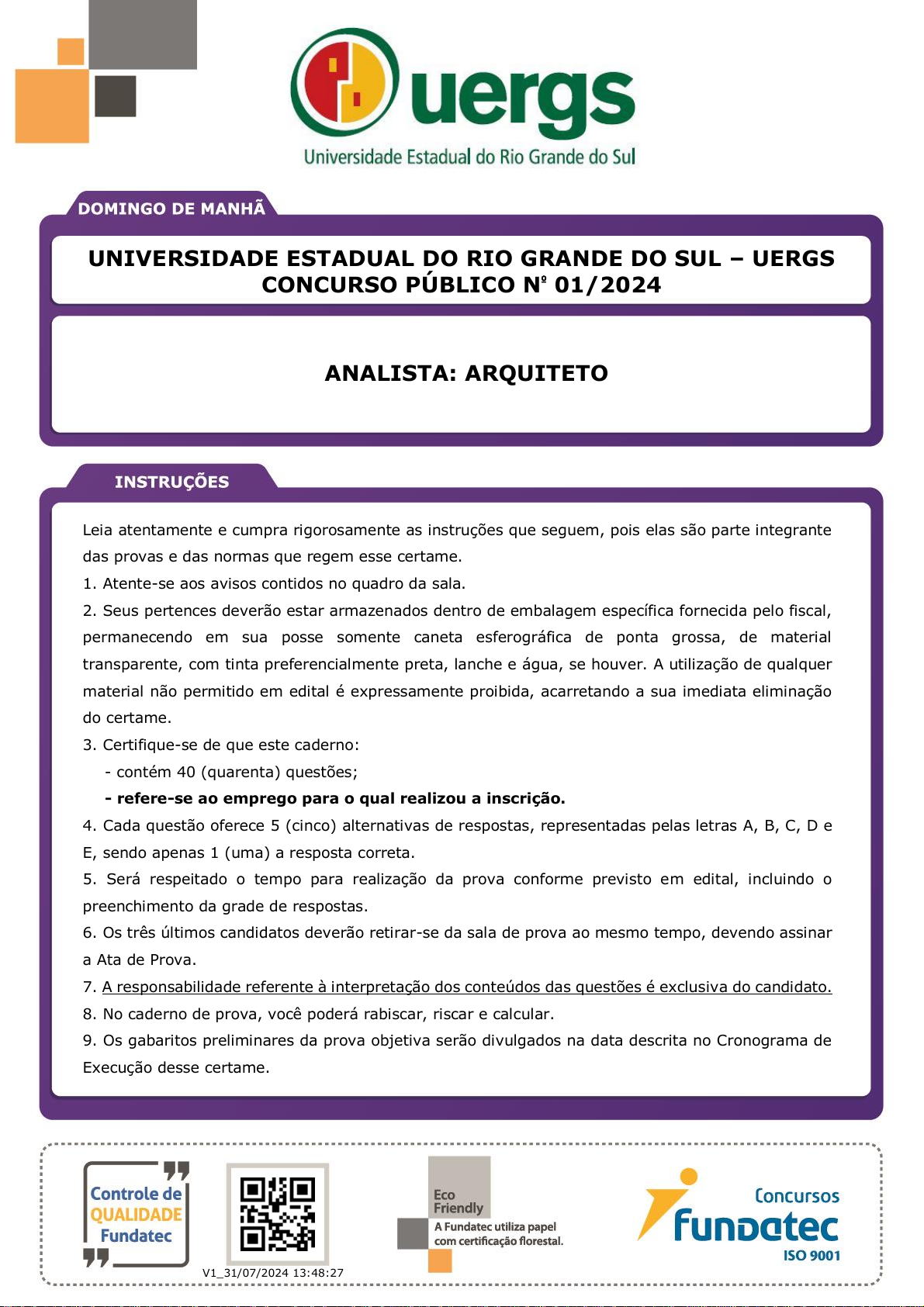 pcimarkpci MDAwMDowMDAwOjAwMDA6MDAwMDowMDAwOmZmZmY6YWE1NToxMmQx:V2VkLCAxMSBGZWIgMjAyNiAxMToxNDoxOCAtMDMwMA== www.pciconcursos.com.br UNIVERSIDADE ESTADUAL DO RIO GRANDE DO SUL – UERGS CONCURSO PÚBLICO Nº 01/2024 QR code V1_31/07/2024 13:48:27 Leia atentamente e cumpra rigorosamente as instruções que seguem, pois elas são parte integrante das provas e das normas que regem esse certame. 1. Atente-se aos avisos contidos no quadro da sala. 2. Seus pertences deverão estar armazenados dentro de embalagem específica fornecida pelo fiscal, permanecendo em sua posse somente caneta esferográfica de ponta grossa, de material transparente, com tinta preferencialmente preta, lanche e água, se houver. A utilização de qualquer material não permitido em edital é expressamente proibida, acarretando a sua imediata eliminação do certame. 3. Certifique-se de que este caderno: - contém 40 (quarenta) questões; 4. Cada questão oferece 5 (cinco) alternativas de respostas, representadas pelas letras A, B, C, D e E, sendo apenas 1 (uma) a resposta correta. 5. Será respeitado o tempo para realização da prova conforme previsto em edital, incluindo o preenchimento da grade de respostas. 6. Os três últimos candidatos deverão retirar-se da sala de prova ao mesmo tempo, devendo assinar a Ata de Prova. 7. A responsabilidade referente à interpretação dos conteúdos das questões é exclusiva do candidato. 8. No caderno de prova, você poderá rabiscar, riscar e calcular. 9. Os gabaritos preliminares da prova objetiva serão divulgados na data descrita no Cronograma de Execução desse certame. - refere-se ao emprego para o qual realizou a inscrição. ANALISTA: ARQUITETO pcimarkpci MDAwMDowMDAwOjAwMDA6MDAwMDowMDAwOmZmZmY6YWE1NToxMmQx:V2VkLCAxMSBGZWIgMjAyNiAxMToxNDoxOCAtMDMwMA== www.pciconcursos.com.br RASCUNHO Utilize esse espaço para anotar suas respostas *A anotação neste rascunho NÃO substitui o preenchimento da grade de respostas. 01 02 03 04 05 06 07 08 09 10 11 12 13 14 15 16 17 18 19 20 21 22 23 24 25 26 27 28 29 30 31 32 33 34 35 36 37 38 39 40 41 42 43 44 45 46 47 48 49 50 51 52 53 54 55 56 57 58 59 60 61 62 63 64 65 66 67 68 69 70 71 72 73 74 75 76 77 78 79 80 81 82 83 84 85 86 87 88 89 90 91 92 93 94 95 96 97 98 99 100 pcimarkpci MDAwMDowMDAwOjAwMDA6MDAwMDowMDAwOmZmZmY6YWE1NToxMmQx:V2VkLCAxMSBGZWIgMjAyNiAxMToxNDoxOCAtMDMwMA== www.pciconcursos.com.br 850_BASE_NS_DM Execução: Fundatec NÍVEL SUPERIOR 16/8/202415:13:44 LÍNGUA PORTUGUESA Sobre orquídeas e pessoas Por Tríssia Ordovás Sartori 01 02 03 04 05 06 07 08 09 10 11 12 13 14 15 16 17 18 19 20 21 22 23 24 25 26 27 28 29 30 31 32 33 Dia desses, contemplando minhas orquídeas, percebi que as flores caíram faz um tempo. Restaram apenas os galhos secos e um par de folhas na base. Desde então, as coloquei na bancada da área de serviço. Olhando para elas, entre uma arrumação e outra, fiquei pensando na contradição de ter algo que floresce e fica exuberante por apenas um curto espaço de tempo. A beleza das flores compensa a ausência seguinte? O fato de elas terem sido presenteadas por pessoas queridas faz com que durem mais no imaginário? Por mais lírica que eu seja, não tenho tanta certeza disso... Curiosamente, Marcelo também escreveu sobre ciclo de florescimento das orquídeas e, ao ler a crônica antes de ela ser publicada, conversamos sobre a coincidência de observarmos o mesmo aspecto peculiar das plantas. Compartilhar uma impressão parecida e a vontade (que dá e passa) de se desfazer delas, porque dão certo trabalho e deixam pouco espaço para fruição, fez com que me sentisse menos incomodada. Esse senso de pertencimento ___ um alívio, de vez em quando. Na quarta-feira passada, recebi a Medalha Anita Garibaldi, na companhia de outras cinco mulheres com trajetórias relevantes na comunidade e, juntamente com a alegria da deferência, só conseguia pensar nas brechas que tinham sido transpostas para que esse momento fosse possível. Lembrei de um vídeo .... assisti ___ um tempinho, que falava sobre o projeto The Dream Gap, que nada mais é do que a lacuna nos sonhos das meninas. A lacuna entre elas e a totalidade de seu potencial. ___ partir dos cinco anos, gurias passam a deixar de acreditar que podem ser presidentes, cientistas, astronautas, engenheiras, grandes pensadoras, CEOs. O antídoto para isso é ver mulheres brilhantes sendo brilhantes. Contemplando minhas parceiras de homenagem, pude ter uma pequena ideia de como chegaram onde estão. A beleza do momento ofuscou qualquer lacuna, qualquer abatimento, qualquer dificuldade. Não sei se dá para comparar com a efemeridade das flores de orquídea. Andei pesquisando e descobri que cada espécie tem um ciclo: algumas permanecem floridas por meses, outras por apenas alguns dias e ainda assim dependem de luminosidade, temperatura e quantidade de água para mostrarem a melhor forma. Ou seja, mesmo as mais belas e duradouras precisam de cuidados, de um olhar especial. Pensando nisso, desisti de me desfazer das plantinhas. Sei que elas não podem espelhar meu estado de espírito nem minha tendência a ver beleza em todas as coisas, mas logo, logo elas estarão radiantes e me farão esquecer dos galhos secos, que vão voltar, mas também não serão para sempre. (Disponível em: gauchazh.clicrbs.com.br/pioneiro/colunistas/trissia-ordovas-sartori/noticia/2024/06/sobre- orquideas-e-pessoas-html – texto adaptado especialmente para esta prova). QUESTÃO 01 – Considerando o exposto pelo texto, analise as assertivas a seguir: I. A reflexão da autora é suscitada por uma situação cotidiana. II. A autora foi agraciada com uma premiação juntamente com outras mulheres sobre cujas trajetórias ela apresenta uma reflexão. III. Ao final, a autora confessa ter jogado as orquídeas fora devido ao trabalho que elas dão e à sua efemeridade. Quais estão corretas? A) Apenas I. B) Apenas II. C) Apenas I e II. D) Apenas I e III. E) Apenas II e III. pcimarkpci