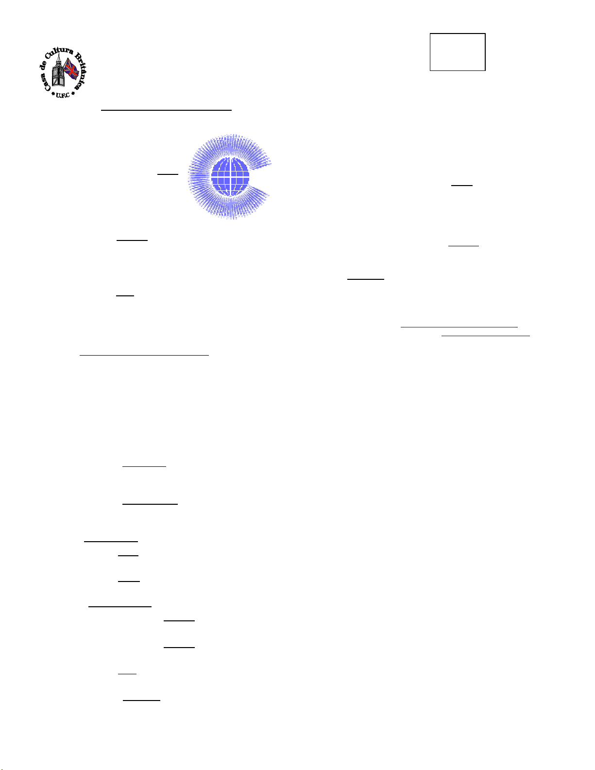_______________________________________________Teste de Nível S2 12.1___________________________________________________ 1 UNIVERSIDADE FEDERAL DO CEARÁ CASA DE CULTURA BRITÂNICA TESTE DE NÍVEL – S2 – PERÍODO 2012.1 NOME DO CANDIDATO: _________________________________ No. de inscrição:________ Part I – READING COMPREHENSION – Read the following text and answer questions 1 to 10. INTRODUCING THE COMMONWEALTH OF NATIONS The Commonwealth is an association of fifty-four nations. These nations are ex-British colonies and they have a common language, 5 culture, law, education, legal system, and democratic traditions. With the process of decolonization and the creation of independent states from former British colonies, the changing 10 British Empire is now a "Commonwealth of Nations". These nations now work together and have international objectives, for example, the promotion of international understanding, equality and world peace. They also combat racism. 15 Some member countries are the United Kingdom, Canada, India, Australia, New Zealand, Jamaica, and some small islands in the Caribbean and the Pacific, for example, Saint Lucia or Samoa. Of the fifty-four, thirty-three are republics (such as India), five have 20 their own monarchies (such as Brunei Darussalam), and sixteen are a constitutional monarchy with the queen of the United Kingdom as their head of state (such as Canada and Australia). The Commonwealth of Nations supports the 25 Commonwealth Games every four years for member countries. The Commonwealth Day is on the second Monday in March. Each year carries a different theme but each country celebrates the day in a different way. The population of the 54 member 30 states exceeds two billion, about 30% of the world’s population. The members of the Commonwealth are voluntary, but only independent countries are members. Adapted from: www.commonwealth-of-nations.org and 35 www.geography.about.com I – UNDERSTANDING THE TEXT 1. The main idea of the text above is to: a) promote equality among former British colonies. c) combat racism among Commonwealth nations. b) explain what the Commonwealth is and does. d) criticize the process of decolonization. 2. The text above says that: a) the Commonwealth of Nations has a common language but independent laws and legal systems. b) 16 Commonwealth nations have the queen of the United Kingdom as their head of state. c) 54 ex–British colonies are now republics and have democratic traditions. d) the former British colonies now have their own monarchies. 3. Choose the CORRECT alternative according to the text. a) The Commonwealth supports an annual sports event. c) India participates in the Commonwealth games. b) Only four Commonwealth members play the games. d) The Commonwealth does not like the games. 4. Choose the INCORRECT alternative according to the text. a) Commonwealth Day is on March 2nd. c) Commonwealth members are volunteers. b) Commonwealth Day is always on a Monday. d) Commonwealth nations are independent. II – REFERENCE 5. The word ‘they’ (line 4) refers to: a) Commonwealth nations b) the British Empire c) language and law d) democratic traditions 6. The word ‘their’ (line 23) refers to: a) the sixteen countries b) the republics c) the five countries d) the fifty–four countries III – VOCABULARY 7. In the text, the word ‘former’ (line 10) means: a) conventional b) previous c) exact d) regular 8. In the text, the word ‘carries’ (line 28) means: a) wins b) changes c) supports d) has 9. The word ‘also’ (line 15) states in the sentence the idea of: a) addition b) contrast c) consequence d) condition 10. The word ‘exceeds’ (line 31) means: a) transcends b) includes c) excludes d) ignores S2 _______________________________________________Teste de Nível S2 12.1___________________________________________________ 2 PART II – USE OF ENGLISH For questions 11 to 20, choose the option that CORRECTLY completes the sentences. (X = no word) 11. My brother and I ______ very good students, but my sister______. a) am – is b) are – isn’t c) am not – is d) aren’t – are 12. A: ______ your parents in town this weekend? B: No, they ______. I ______ at home alone. a) Is – are – is b) Is – isn’t – am c) Are – aren’t – am d) Aren’t – aren’t – is 13. A: Where ______ your cousins from? B: ______. a) are – Fine b) is – At home c) are – France d) is – To school 14. A: ______ your friend ______ to the same school as you? B: No, she ______. a) Do – go – don’t b) Does – goes – doesn’t c) Do – goes – not d) Does – go – doesn’t 15. London is a ______ city. It’s ______ beautiful, but ______ cheap! a) nice – quite – not very b) quite – very – not c) very – a – X d) X – a – not a 16. A: ______ you ______ a cup of tea? B: Yes, please. a) Do – wants b) Would – like c) X – like d) X – wants 17. A: How often ______ you go to the gym? B: I ______ go very ______. a) are – X – often b) are – am not – usually c) do – don’t – often d) X – X – always 18. A: What time ______ start work? B: I ______ at 7 o’clock. I ______ late. a) do you – start always – never am c) you – hardly ever start – always am b) do you – always start – am never d) you – start hardly ever – am always 19. A: Are these ______ books, Lucy? B: No, teacher, ______ books are right here. Those are ______ books. a) your – my – Mary’s b) my – your – Mary c) her – her – Mary d) your – she’s – Mary’s 20. Attention, students! Please, ______ your cell phones and ______ during the exam. a) not turn off – not talk b) no turn off – no talk c) turn off – not talk d) turn off – don’t talk For questions 21 to 25, choose the INCORRECT option. 21. a) Helen studies at university. c) Janet lives on the second floor. b) Larry works at the morning. d) Sally’s birthday is in June. 22. a) A: How old are you? B: I’m twenty year