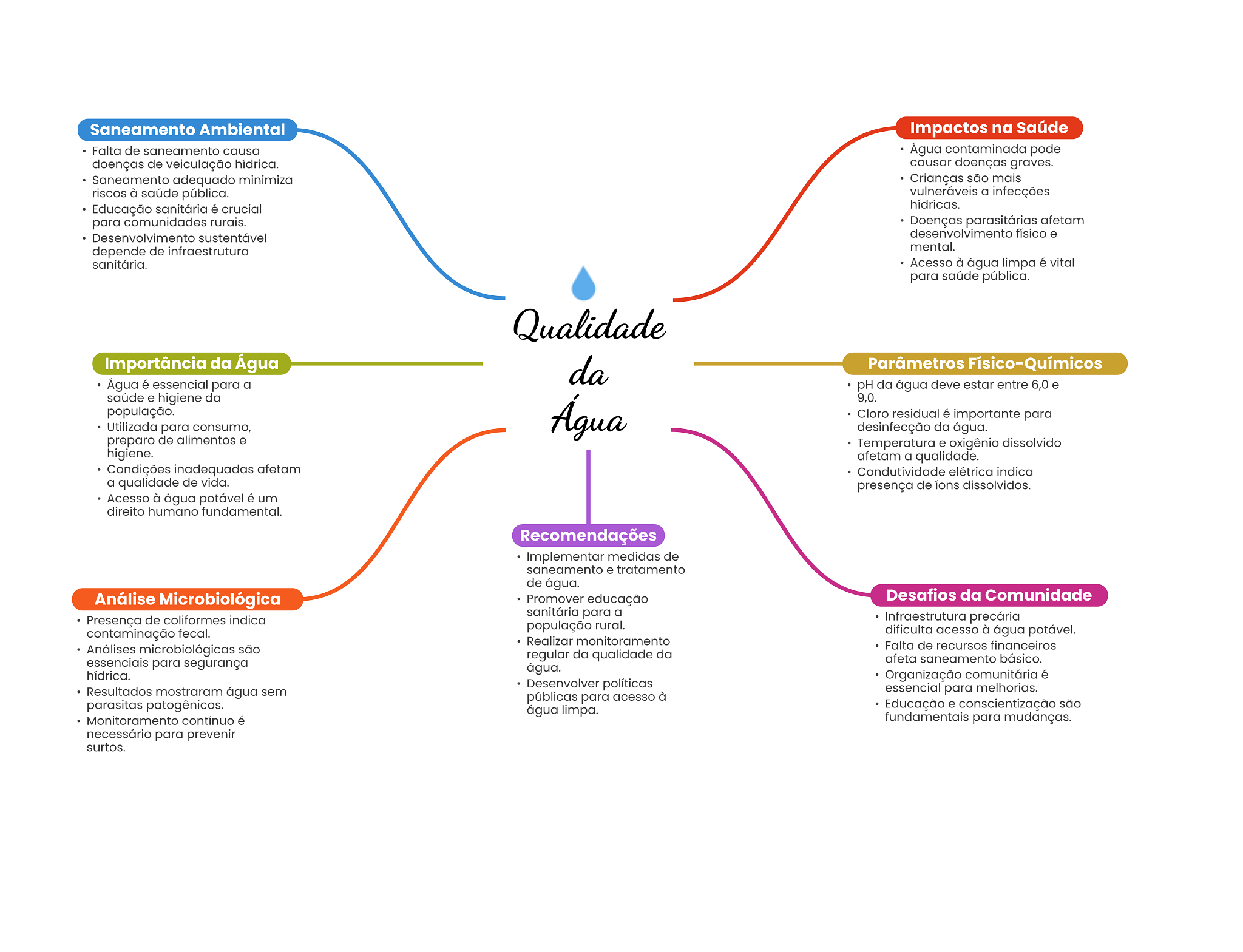 Saneamento Ambiental Impactos na Saúde Falta de saneamento causa Água contaminada pode doenças de veiculação hídrica. causar doenças graves. Saneamento adequado minimiza Crianças são mais riscos à saúde pública. vulneráveis a infecções Educação sanitária é crucial hídricas. para comunidades rurais. Doenças parasitárias afetam Desenvolvimento sustentável desenvolvimento físico e depende de infraestrutura mental. sanitária. Acesso à água limpa é vital para saúde pública. Qualidade Importância da Água da Parâmetros Físico-Químicos Água é essencial para a pH da água deve estar entre 6,0 e saúde e higiene da 9,0. população. Água Cloro residual é importante para Utilizada para consumo, desinfecção da água. preparo de alimentos e Temperatura e oxigênio dissolvido higiene. afetam a qualidade. Condições inadequadas afetam Condutividade elétrica indica a qualidade de vida. presença de dissolvidos. Acesso à água potável é um direito humano fundamental. Recomendações Implementar medidas de saneamento e tratamento de água. Análise Microbiológica Promover educação Desafios da Comunidade sanitária para a Presença de coliformes indica Infraestrutura precária população rural. contaminação fecal. dificulta acesso à água potável. Realizar monitoramento Análises microbiológicas são Falta de recursos financeiros regular da qualidade da essenciais para segurança afeta saneamento básico. água. hídrica. Organização comunitária é Desenvolver políticas Resultados mostraram água sem essencial para melhorias. públicas para acesso à parasitas patogênicos. água limpa. Educação e conscientização são Monitoramento contínuo é fundamentais para mudanças. necessário para prevenir surtos.