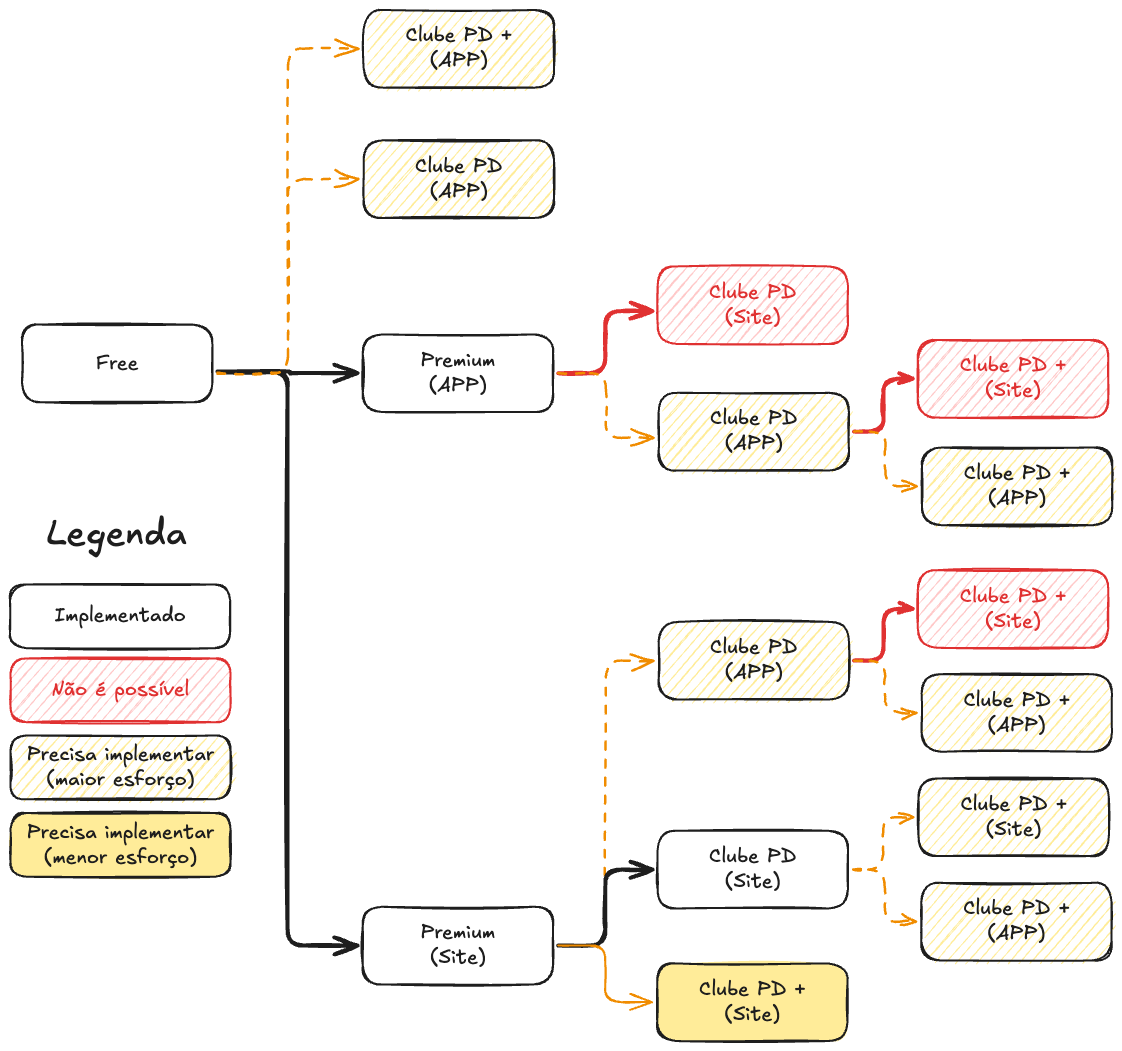 Clube PD + (APP) Clube PD (APP) Clube PD (Site) Free Premium Clube PD + (APP) (Site) Clube PD (APP) Clube PD + (APP) Legenda PD + Implementado (Site) Clube PD (APP) Não é possível Clube PD + (APP) Precisa implementar (maior esforço) Clube PD + Precisa implementar (Site) (menor esforço) Clube PD (Site) Clube PD + Premium (APP) (Site) Clube PD + (Site)