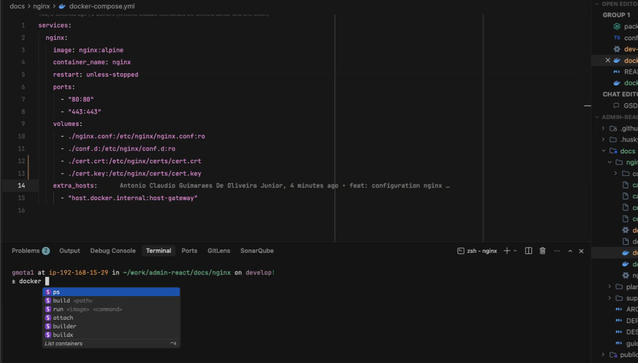 docs > nginx > docker-compose.yml OPEN EDITO GROUP 1 1 services: pack 2 nginx: TS conf 3 image: nginx:alpine dev- 4 container_name: nginx X dock 5 restart: unless-stopped dock 6 ports: CHAT 7 "80:80" GSD 8 "443:443" ADMIN-REA( 9 volumes: 10 - ./nginx.conf:/etc/nginx/nginx.conf:ro husk 11 ./conf.d:/etc/nginx/conf.d:ro > docs 12 ./cert.crt:/etc/nginx/certs/cert.crt ngir 13 ./cert.key:/etc/nginx/certs/cert.key > 14 extra_hosts: Antonio Claudio Guimaraes De Oliveira Junior, 4 minutes ago feat: configuration nginx - ca 15 "host.docker.internal:host-gateway" 16 de de Problems 2 Output Debug Console Terminal Ports GitLens SonarQube zsh nginx + plar $ ps $ build sup $ run ARC $ attach $ builder buildx DES List containers public