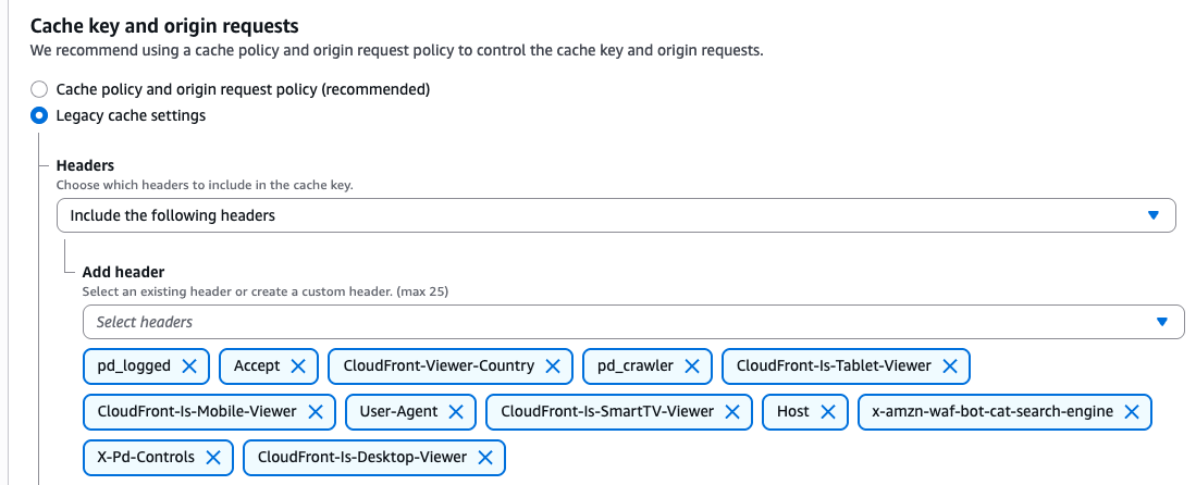 Cache key and origin requests We recommend using a cache policy and origin request policy to control the cache key and origin requests. Cache policy and origin request policy (recommended) Legacy cache settings Headers Choose which headers to include in the cache key. Include the following headers Add header Select an existing header or create a custom header. (max 25) Select headers pd_logged X Accept X CloudFront-Viewer-Country X pd_crawler X CloudFront-Is-Tablet-Viewer X CloudFront-Is-Mobile-Viewer X User-Agent X CloudFront-Is-SmartTV-Viewer X Host X x-amzn-waf-bot-cat-search-engine X X-Pd-Controls X X
