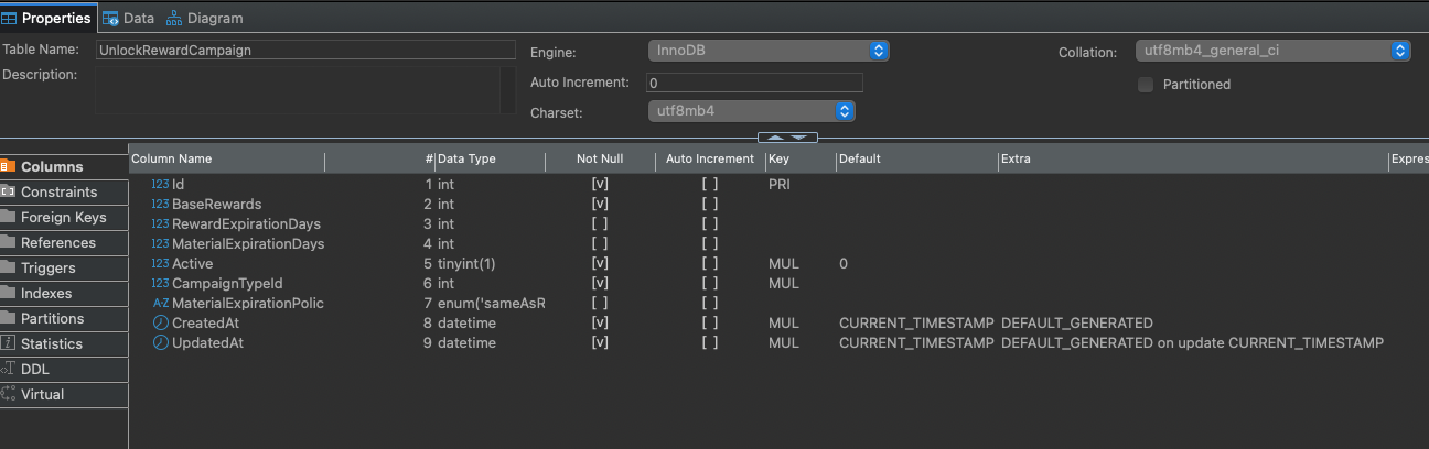 Properties Data Diagram Table Name: UnlockRewardCampaign Engine: InnoDB C Collation: utf8mb4_general_ci C Description: Auto Increment: 0 Partitioned Charset: utf8mb4 Column Name # Data Type Not Null Auto Increment Key Default Extra Expres Columns 123 Id 1 int [v] [] PRI Constraints 123 BaseRewards 2 int [v] [] Foreign Keys 123 RewardExpirationDays 3 int [] [] References 123 MaterialExpirationDays 4 int [] [] Triggers 123 Active 5 tinyint(1) [v] [] MUL 0 123 CampaignTypeld 6 int [v] MUL Indexes A-Z MaterialExpirationPolic 7 enum('sameAsR Partitions CreatedAt 8 datetime [v] MUL CURRENT_TIMESTAMP DEFAULT_GENERATED Statistics UpdatedAt 9 datetime [v] [] MUL CURRENT_TIMESTAMP DEFAULT_GENERATED on update CURRENT_TIMESTAMP DDL Virtual