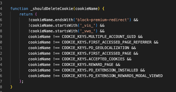 3 4 function_shouldDeleteCookie(cookieName) { 5 return ( 6 ! !cookieName.endsWith('block-premium-redirect') && 7 && 8 && 9 cookieName !== 0 cookieName 1 cookieName == COOKIE_KEYS.PD_GEOLOCALIZATION && 2 cookieName COOKIE_KEYS.FIRST_ACCESSED_PAGE && 3 cookieName 4 cookieName == 5 cookieName !== COOKIE_KEYS.PD_EXTENSION_INSTALLED && 6 cookieName COOKIE_KEYS.PD_EXTENSION_REWARDS_MODAL_VIEWED 7 8