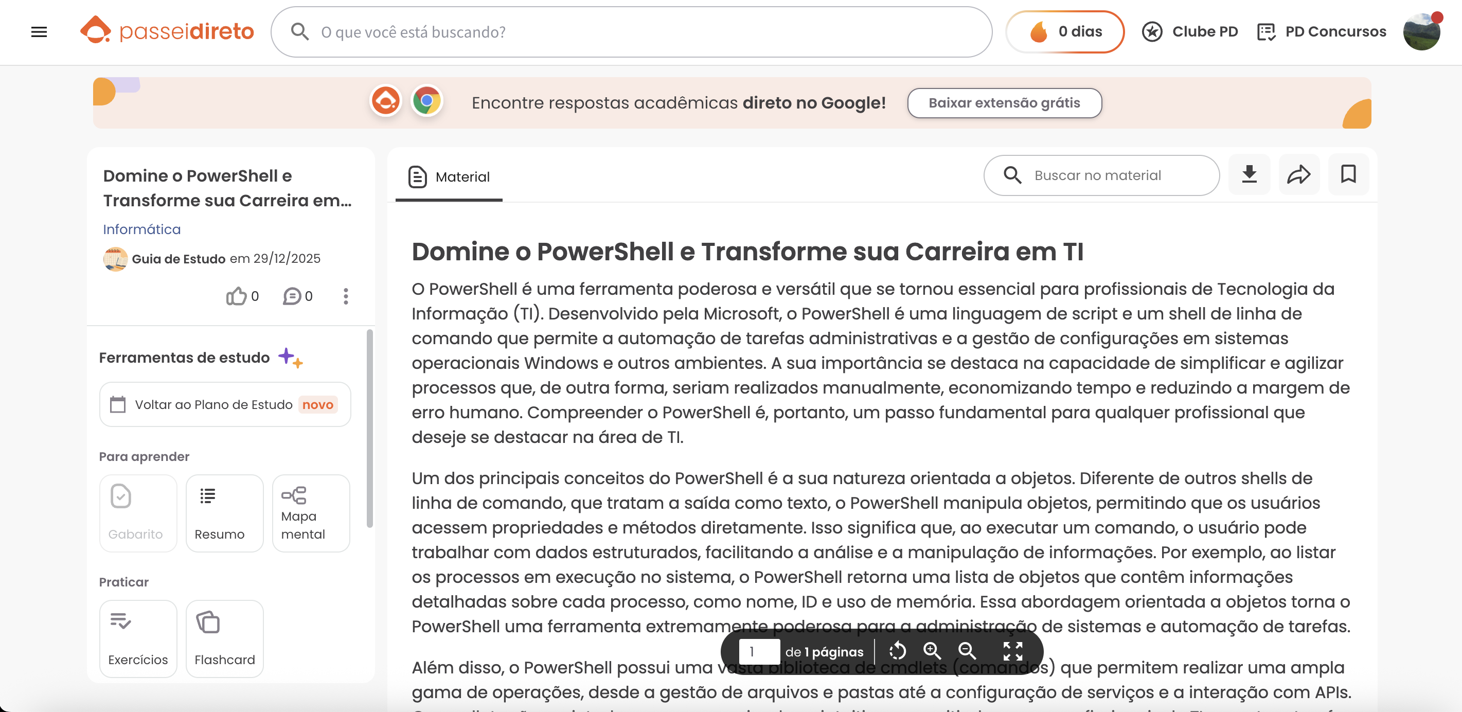 passeidireto que você está buscando? 0 dias Clube PD PD Concursos Encontre respostas acadêmicas direto no Google! Baixar extensão grátis Domine PowerShell e Material Buscar no material Transforme sua Carreira em... Informática Guia de Estudo em 29/12/2025 Domine PowerShell e Transforme sua Carreira em TI 0 0 PowerShell é uma ferramenta poderosa e versátil que se tornou essencial para profissionais de Tecnologia da Informação (TI). Desenvolvido pela Microsoft, PowerShell é uma linguagem de script e um shell de linha de comando que permite a automação de tarefas administrativas e a gestão de configurações em sistemas Ferramentas de estudo operacionais Windows e outros ambientes. A sua importância se destaca na capacidade de simplificar e agilizar processos que, de outra forma, seriam realizados manualmente, economizando tempo e reduzindo a margem de Voltar ao Plano de Estudo novo erro humano. Compreender PowerShell é, portanto, um passo fundamental para qualquer profissional que deseje se destacar na área de TI. Para aprender Um dos principais conceitos do PowerShell é a sua natureza orientada a objetos. Diferente de outros shells de linha de comando, que tratam a saída como texto, PowerShell manipula objetos, permitindo que usuários Gabarito Resumo mental acessem propriedades e métodos diretamente. Isso significa que, ao executar um comando, usuário pode trabalhar com dados estruturados, facilitando a análise e a manipulação de informações. Por exemplo, ao listar Praticar processos em execução no sistema, PowerShell retorna uma lista de objetos que contêm informações detalhadas sobre cada processo, como nome, ID e uso de memória. Essa abordagem orientada a objetos torna o PowerShell uma ferramenta extremamente poderosa a administração de sistemas e automação de tarefas. 1 Exercícios Flashcard de 1 páginas Além disso, PowerShell possui uma de cmdlets (comandos) que permitem realizar uma ampla gama de operações, desde a gestão de arquivos e pastas até a configuração de serviços e a interação com APIs.