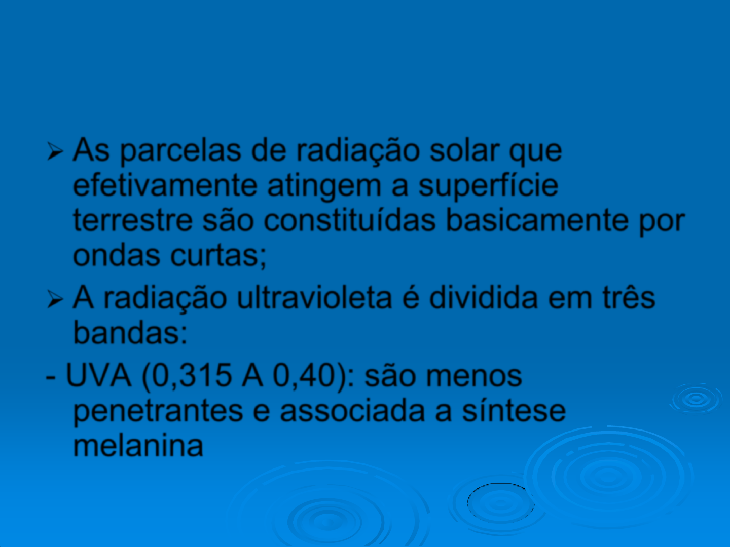 * As parcelas de radiação solar que efetivamente atingem a superfície terrestre são constituídas basicamente por ondas curtas; A radiação ultravioleta é dividida em três bandas: - UVA (0,315 A 0,40): são menos penetrantes e associada a síntese melanina * UVB (0,28 A 0,315): importante para a síntese de vitamina D, mas pode ser danosa se exposta de forma excessiva; UVC (0,20 A 0,28): especialmente danosa, mas é quase toda absorvida pela camada de ozônio * SINTESE DE MELANINA * CALOR SENSÍVEL B) CONDUÇÃO Transferência de calor entre moléculas; Passagem do calor do núcleo central a periferia do animal; Qq objeto com que o animal possa ter contato. * CALOR SENSÍVEL C) CONVECÇÃO Depende de uma corrente de fluido que pode ser líquido ou gasoso; Camada limite: Convecção: Natural ou passiva Forçada ou ativa * CALOR LATENTE A) EVAPORAÇÃO A1) Evaporação trato respiratório . Frequência respiratória: = trabalho muscular. . Profundidade respiratória. . Aves: sacos aéreos. * CALOR LATENTE A2) Evaporação superfície cutânea A.2.1) Perspiração insensível. Difusão simples Áreas implumes das aves Eficente: qualitativamente * CALOR LATENTE A.2.2) Glândulas sudoríparas. Capa externa (pêlos), epiderme, derme (papilar e reticular), hipoderme. écrinas: homem, atríquias, camada papilar, secretora-excretora, composição inicial (água, NaCl, KCl), final 99% água e 1% cloretos: mecanismo poupador. * * * CALOR LATENTE apócrinas: camada reticular (mais profunda, Associada a um folículo piloso, gl. sebácea e ao músculo pilo-eretor. Secreção: inicial água, NaCl, KCl, albumina Final: 94,5% água, 0,5% albumina e 5% cloretos. Reconstituir a célula GASTO DE ENERGIA * * * MECANISMOS VASOMOTORES Anastomoses artério venosas: variação do fluxo sanguíneo. * MECANISMOS VASOMOTORES Mecanismo contracorrente;