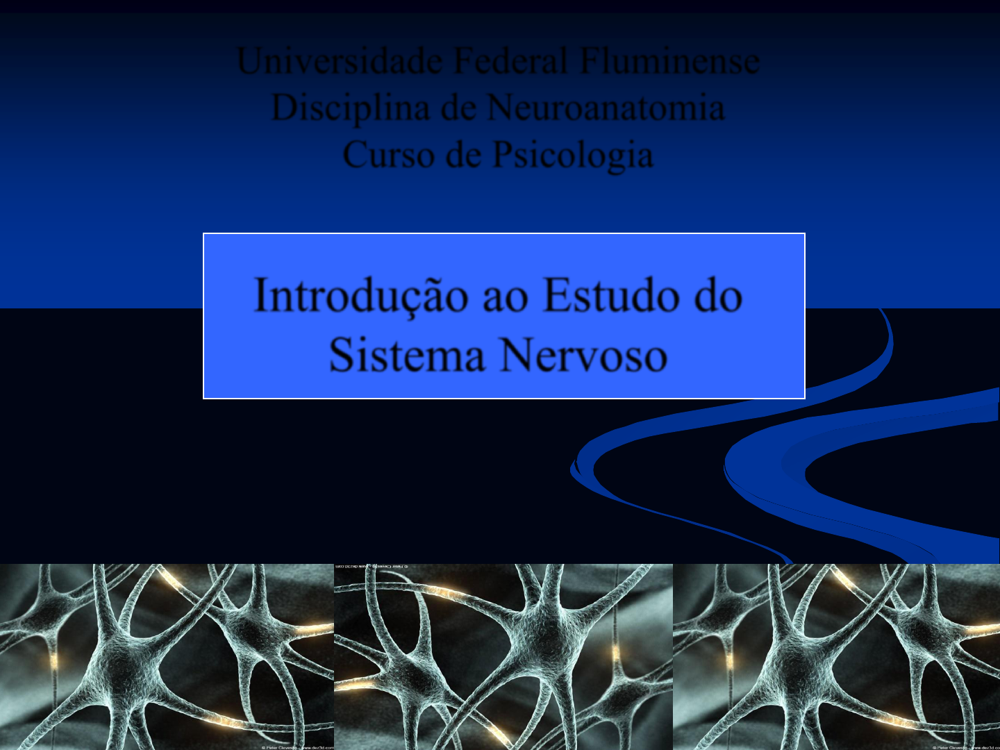 * Universidade Federal Fluminense Disciplina de Neuroanatomia Curso de Psicologia Introdução ao Estudo do Sistema Nervoso Prof. Walter Machado-Pinheiro walter@vm.uff.br * TECIDO NERVOSO - Constituição: Células da Glia (Neuróglias – 70%) e Neurônios (30%). - Localização: Sistema nervoso (central e periférico) e vísceras (por exemplo, tubo digestivo). * TECIDO NERVOSO Glias: Astrócitos, Micróglias, Oligodendrócitos e Células de Schwann. * TECIDO NERVOSO - Neurônios: várias formas e tipos. - Propriedades: irritabilidade e condutibilidade. * TECIDO NERVOSO - Neurônios: corpo, dendritos, axônio e terminações axonais. * TECIDO NERVOSO - Sinapses e neurotransmissores: * TECIDO NERVOSO - Sinapses e neurotransmissores: * TECIDO NERVOSO - Sinapses e neurotransmissores: mielina * Sistema Nervoso - Central x Periférico * Sistema Nervoso Periférico Nervos espinhais, Nervos Cranianos, Gânglios periféricos, e Terminações nervosas. * Sistema Nervoso Central * Sistema Nervoso Central * Sistema Nervoso Central - Meninges: Dura-máter, Aracnóide, Pia-máter. * Nomenclatura anatômica Exemplo: * Cultura é cultura... * * * * * * * * * * * * * * *