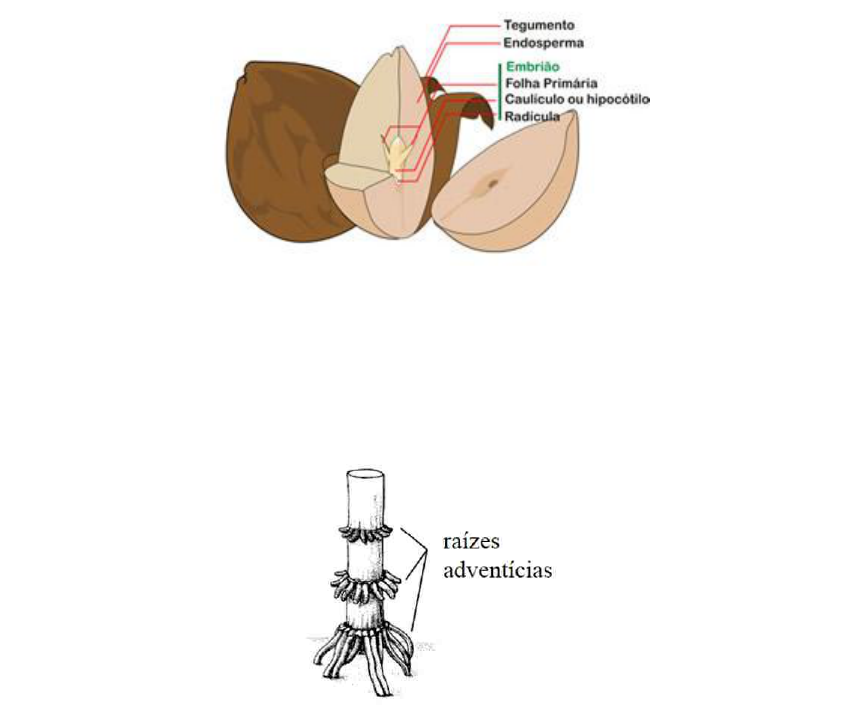 Morfologia externa das plantas angiospermas O corpo da maioria das plantas angiospermas é dividido em duas partes principais, uma localizada sob o solo, constituída pelas raízes, e outra área constituída pelo caule, folhas, flores e frutos. As células das raízes, assim com as células de muito caules, não fazem fotossíntese e por isso dependem do alimento produzido nas células das folhas. O caule, folhas, flores e frutos, por sua vez, dependem da água e dos sais minerais absorvidos pelas raízes. A raiz Quase sempre a raiz é originada a partir da radícula do embrião, localizado na semente. Partes das semente A partir dela surgem ramos secundários. No entanto, é freqüente surgirem raízes a partir de caules e mesmo de folhas. Essas raízes conhecidas como adventícias (do latim advena = que vem de fora, que nasce fora do lugar habitual), são comuns, por exemplo, na base de um pé de milho. As raízes distribuem-se amplamente pelo solo, mas há algumas plantas que possuem raízes aéreas, comuns nas trepadeiras, bromélias, orquídeas, enquanto outras possuem raízes submersas, como os aguapés, comuns em represas. Raiz aérea Raiz aquática Temos dois tipos básicos de sistema radicular: o pivotante, em que há uma raiz principal, e ofasciculado, em que os ramos radiculares são equivalentes em tamanho e aparência, não apresentando uma raiz principal. Partes da raiz A extremidade de uma raiz é envolta por um capuz de células denominado coifa, cuja função é proteger omeristema radicular, um tecido em que as células estão se multiplicando ativamente por mitose. É no meristema que são produzidos as novas células da raiz, o que possibilita o seu crescimento. Logo após a extremidade, localiza-se a região onde as células surgidas por mitose crescem. Nessa região denominada zona de distensão ou de alongamento celular, a raiz apresenta a maior taxa de crescimento. Após a zona de distensão situa-se a zona pilífera da raiz, que se caracteriza por apresentar células epidérmicas dotadas de projeções citoplasmáticas finas e alongadas, os pêlos absorventes. É através desses pelos que a raiz absorve a maior parte da água e dos sais minerais de que precisa. Já a região de ramos secundários é aquela que se nota o brotamento de novas raízes que surgem de regiões internas da raiz principal. Tipos de Raizes A principal função da raiz é a absorção dos nutrientes minerais, sendo que, no solo, também é responsável pela fixação do vegetal ao substrato. Alguns tipos de raízes, no entanto, também desempenham outras funções: Raizes tuberosas, como as da mandioca, da batata-doce e do nabo armazenam reservas alimentares, principalmente na forma de grãos de amido, utilizadas durante a floração e a produção de frutos pela planta. Os agricultores colhem essas raízes antes da planta tenha chance de consumir as reservas armazenadas, utilizando-as na alimentação humana e de animais. Raízes respiratórias ou pneumatóforos são adaptadas a realização de trocas gasosas com o ambiente. Esse tipo de raiz é encontrado em plantas como a Avicena tomentosa, que vive no solo encharcado e pobre em gás oxigênio nos manguezais. As raízes principais dessa planta crescem rente à superfície do solo e, de espaço em espaço, apresentam pneumatóforos, que crescem para cima, perpendicularmente ao solo. Durante a maré vazante os pneumatóforos ficam expostos e pode realizar trocas de gases com o ar. Raízes-suportes, também chamadas raízes-escoras, aumentam a base de fixação da planta ao solo. Algumas espécies de árvores possuem raízes tubulares, em forma de pranchas verticais, que aumentam a estabilidade da planta e fornecem maior superfície para respiração do sistema radicular. Raízes aéreas são características de plantas epífetas, isto é, que vivem sobre outras plantas sem parasitá-las. Essas raízes podem atingir vários metros de comprimento antes de alcançar o solo, constituindo os cipós. Raízes sugadoras são adaptadas à extração de alimentos de plantas hospedeiras, sendo características de plantas parasitas, como o cipó-chumbo e a erva-de-passarinho. As raízes sugadoras possuem um órgão de fixação, chamado apreensório, do qual partem finas projeções denominadas haustórios. Oshaustórios penetram na planta hospedeira até atingir os vasos condutores de seiva, de onde extraem água e nutrientes de que a planta parasita necessita para sobreviver. No caso de a planta ser hemiparasita, a exemplo da erva-de-passarinho (é clorofilada, e portanto autótrofa), somente a seiva bruta (água e minerais), que transita pelos vasos lenhosos do xilema, é retirada da planta hospedeira. Caule As funções do caule O caule realiza a integração de raízes e folhas, tanto do ponto de vista estrutural como funcional. Em outras palavras, além de constituir a estrutura física onde se inserem raízes e folhas, o caule desempenha as funções de condução de água e sais minerais das raízes para as folhas, e de condução de matéria orgânica das folhas para as raízes. Caules jovens têm células clorofiladas e são revestidos por uma epiderme uniestratificada, isto é, formada por uma única camada (estrato) de células. Plantas que apresentam pequeno crescimento em espessura, como as gramíneas, por exemplo, também apresentam caules revestidos pela epiderme e esta pode ainda apresentar sobre si, externamente, uma cutícula protetora. Já em plantas que crescem muito em espessura, transformando-se em arbustos ou árvores, a epiderme é substituída por um revestimento complexo, formado por vários tecidos. O tecido mais externo é formado por células mortas, que conferem o aspecto áspero e opaco aos troncos das árvores. Esse revestimento multitecidual, denominado periderme, acompanha o crescimento em espessura dos troncos. Os caules são, em geral, estruturas aéreas, que crescem verticalmente em relação ao solo. Existem, no