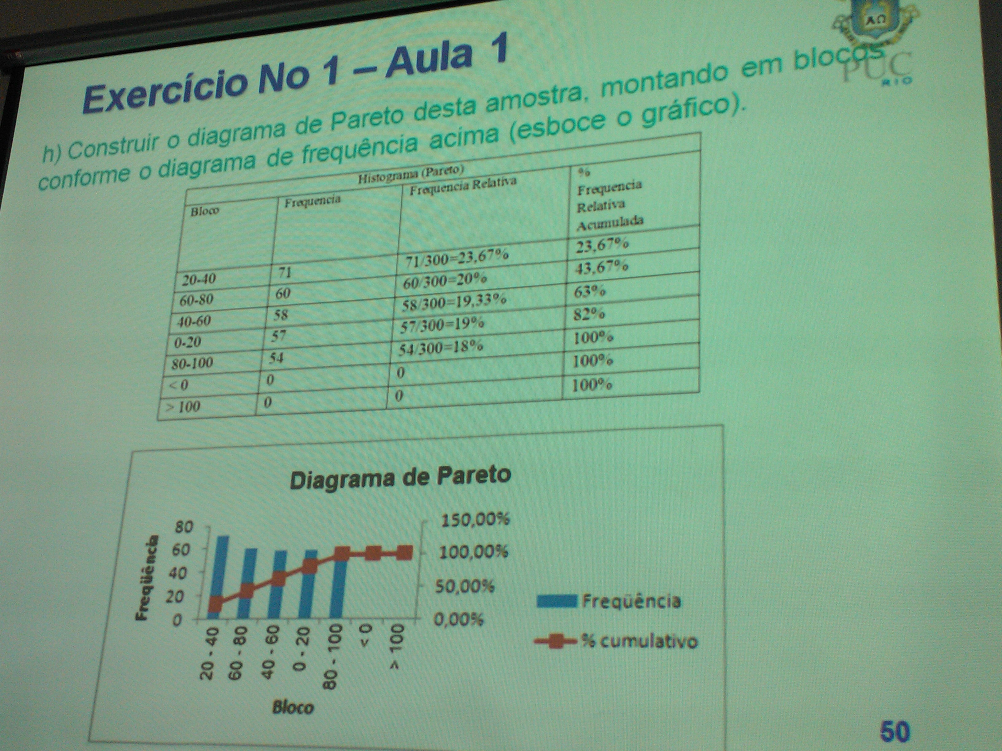 Exercício No 1 Aula 1 AO h) Construir diagrama de Pareto desta amostra, montando em PUC RIO conforme o diagrama de frequência acima (esboce o gráfico). Histograma (Pareto) Bloco Frequencia Frequencia Relativa % Frequencia Relativa Acumulada 20-40 71 23,67% 60-80 60 60/300=20% 43,67% 40-60 58 58/300=19,33% 63% 0-20 57 57/300=19% 82% 80-100 54 54/300=18% 100% <0 0 0 100% 0 100% Diagrama de Pareto 80 150,00% 60 40 100,00% 20 50,00% 0,00% 20 1000 % cumulativo A Bloco 50