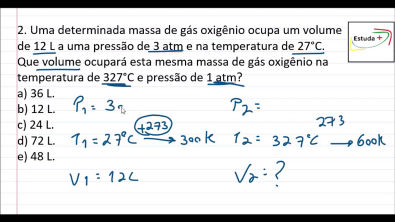 Extensivo de Química ENEM: http://bit.ly/ENEM-ExtensivoQuímica A Química do ENEM: http://bit.ly/A-Química-ENEM Matemática Básica para Concursos: http://bit.ly/Matemática-Concursos Curso de Química para EsPCEx: http://bit.ly/Química-EsPCEx Curso de Química para Aprendiz de Marinheiro (EAM): http://bit.ly/Química-EAM Curso de Química do Colégio Naval: http://bit.ly/Química-ColégioNaval Contato para aulas particulares: WhatsApp: (67)99136-4416 [Exercício do Vídeo] 2. Uma determinada massa de gás oxigênio ocupa um volume de 12 L a uma pressão de 3 atm e na temperatura de 27°C. Que volume ocupará esta mesma massa de gás oxigênio na temperatura de 327°C e pressão de 1 atm? a) 36 L. b) 12 L. c) 24 L. d) 72 L. e) 48 L. Não utilize o Adblock nos vídeos do Estuda Mais, isso atrapalha no crescimento do canal. Gostou dessa aula da um Like nesse vídeo e divulgue em suas redes sociais, isso vai ajudar o canal a crescer. Visite o Site do Estuda Mais e saiba mais sobre os pacotes de aulas particulares. https://estuda-mais8.webnode.com/ Inscreva-se em nosso canal no youtube: https://www.youtube.com/user/estudamais Conheça nosso Blog: http://estuda-maiss.blogspot.com.br/ Siga o Estuda Mais no Instagram: @estudamais_youtube Siga o Twitter do Estuda Mais: https://twitter.com/MaisEstuda Curta nossas páginas no facebook: https://www.facebook.com/estudamaiss/ https://www.facebook.com/estudaexatas... Ative o sininho e receba todas as notificações de vídeos do Estuda Mais Visite o site do Estuda Exatas http://estudaexatas-com.webnode.com/ #Química #EstudaMais #CiênciasdaNatureza #Educação #Exercício #Comofazer #ENEM #Vestibular #Concurso #concursopúblico #resolução #youtubeedu